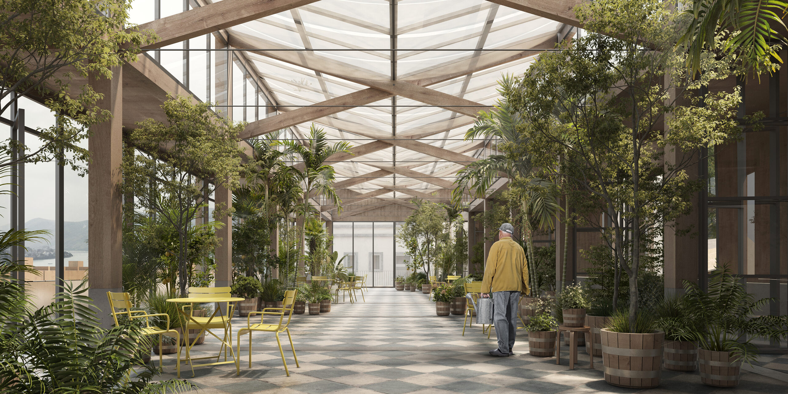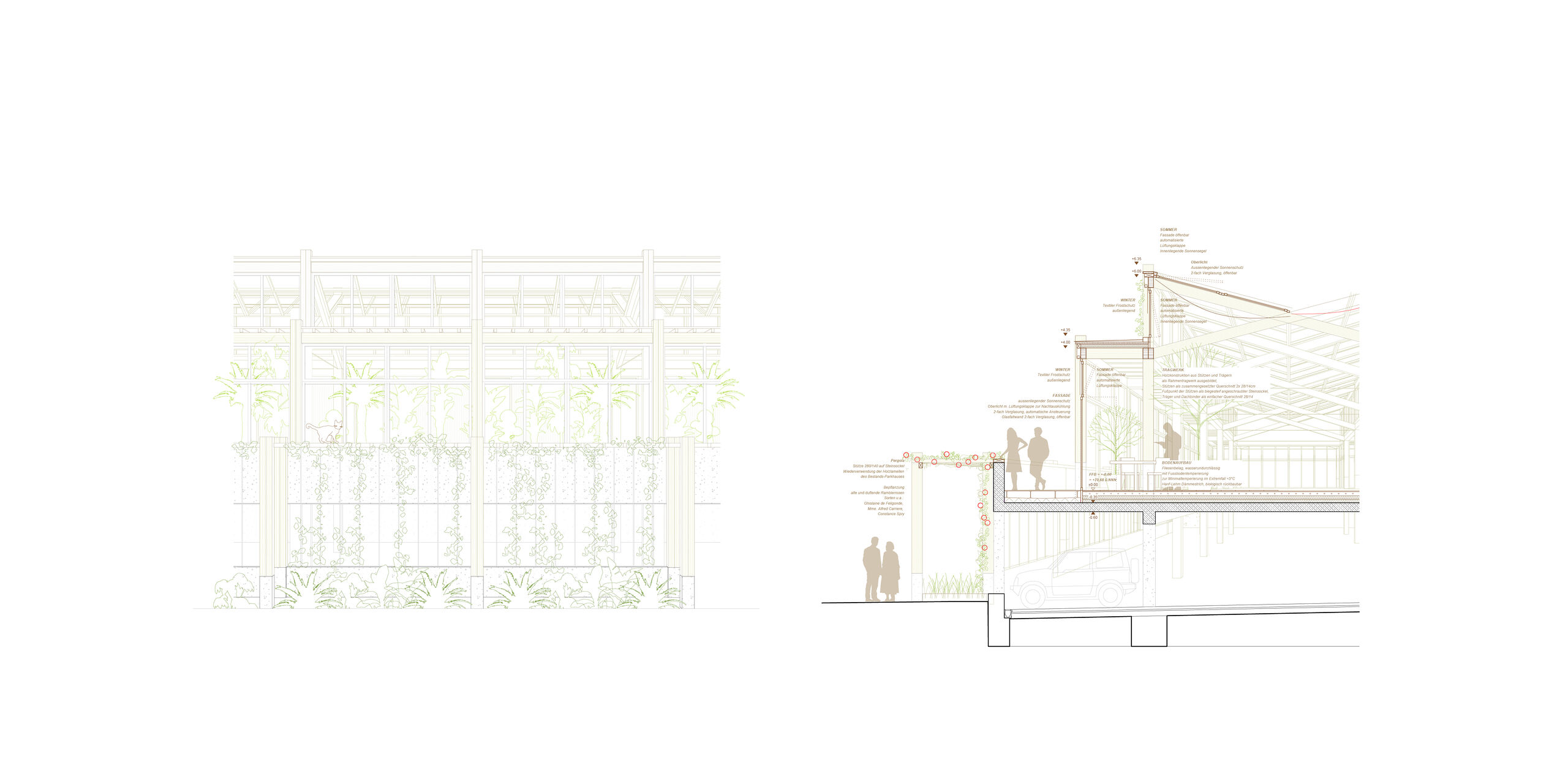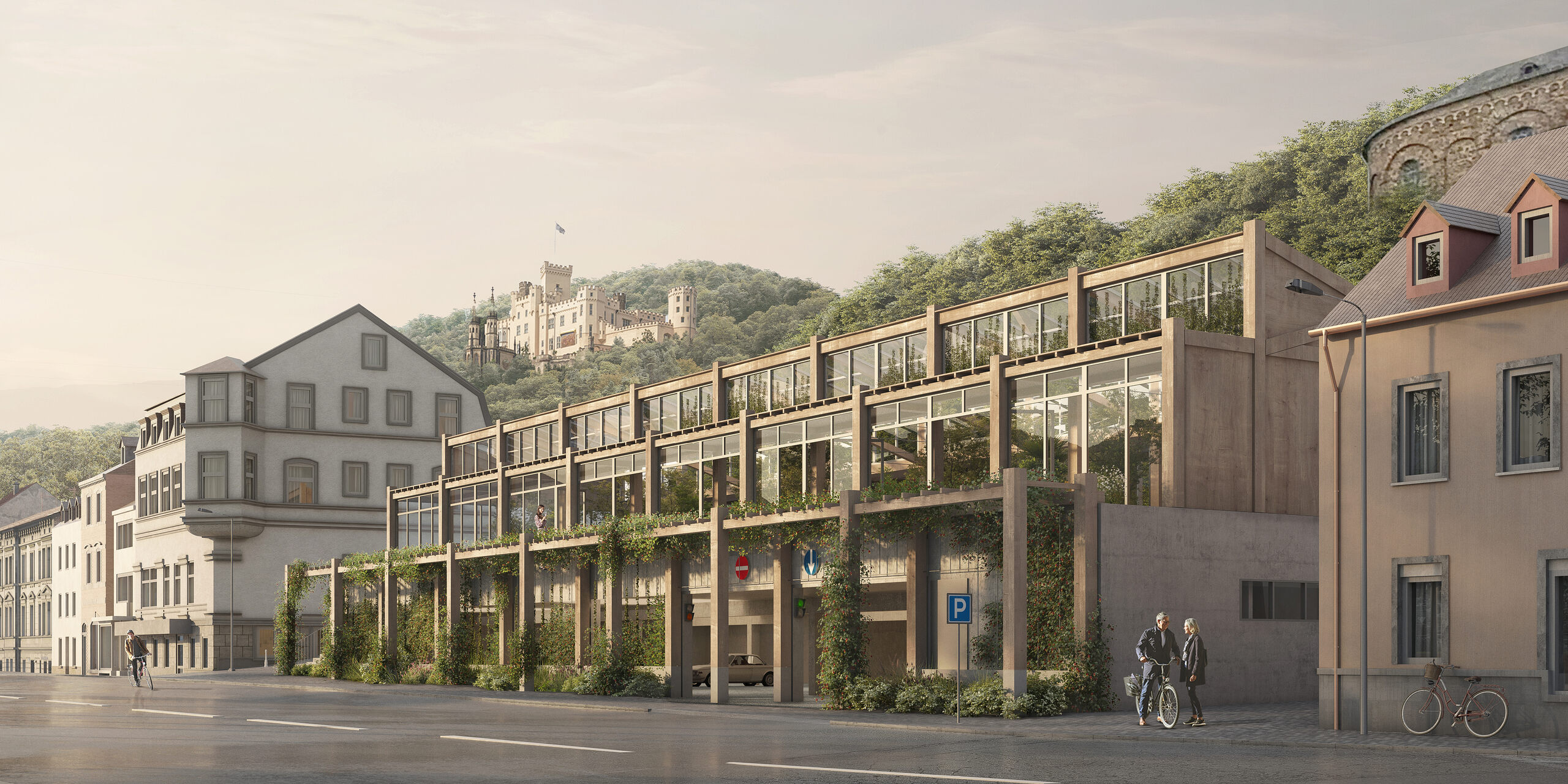 For this purpose, a light-flooded orangery in a light timber construction is placed on top of the existing parking garage and an open pergola overgrown with plants is introduced to create a holistic impression. The pergola transforms the character of the existing multi-storey parking lot, creates a direct design link to Stolzenfels Castle and anchors the new orangery in its context.