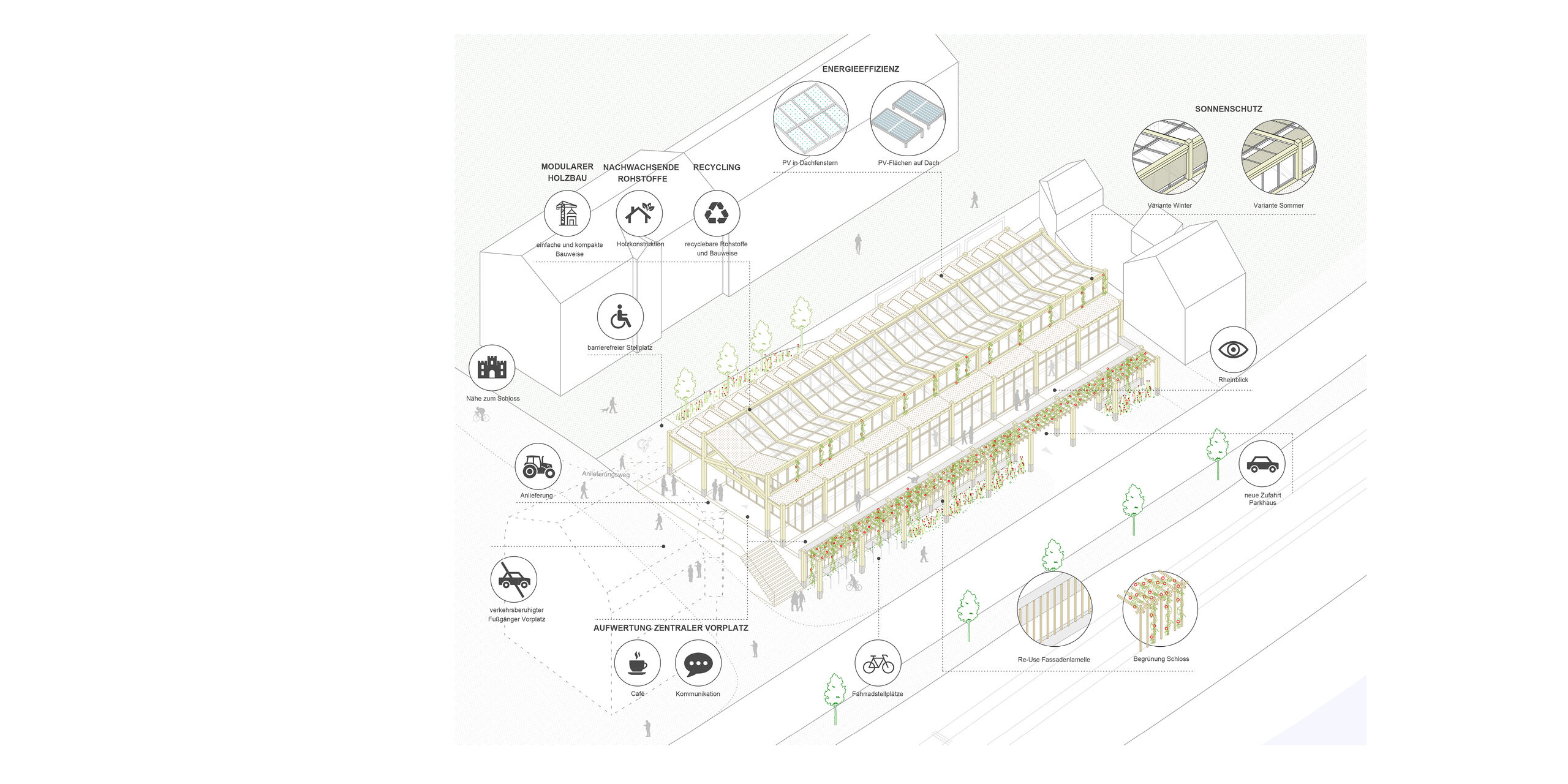 The new building is being constructed as a contemporary, sustainable timber construction and is based on the structure of historic orangeries, thus creating a link to the castle.
