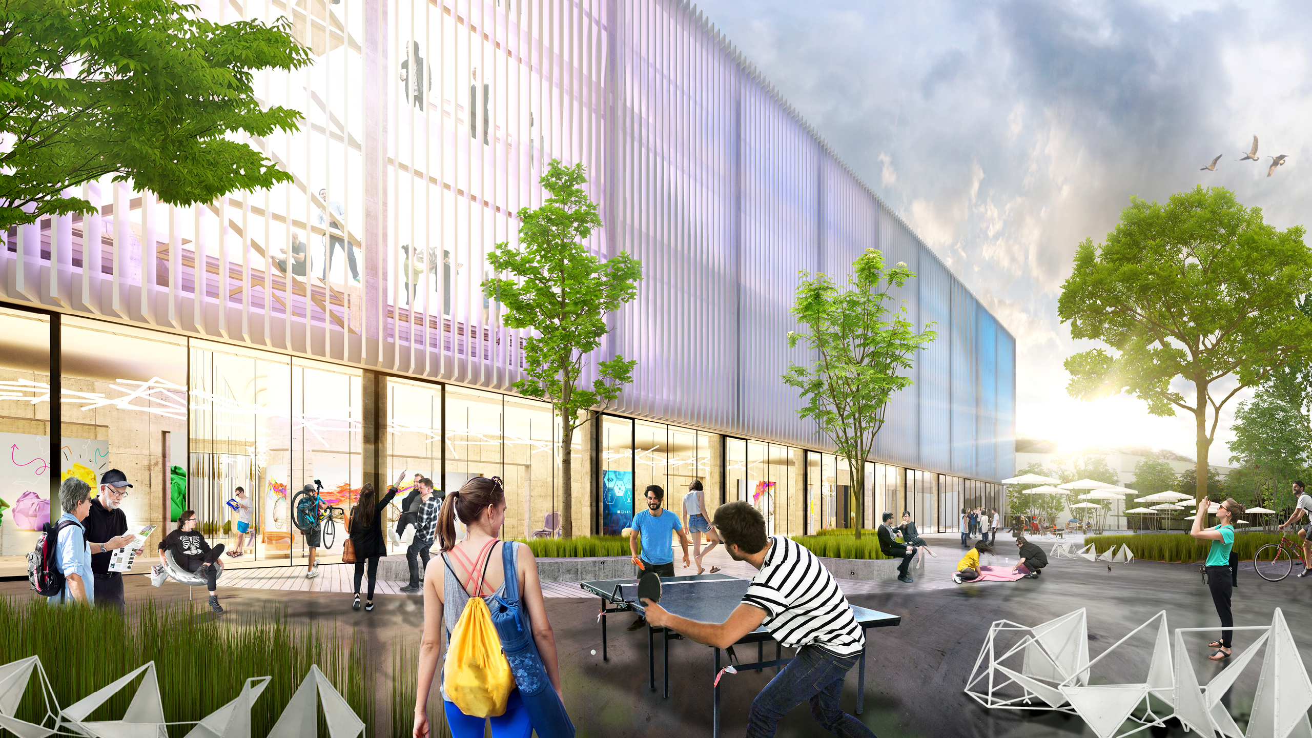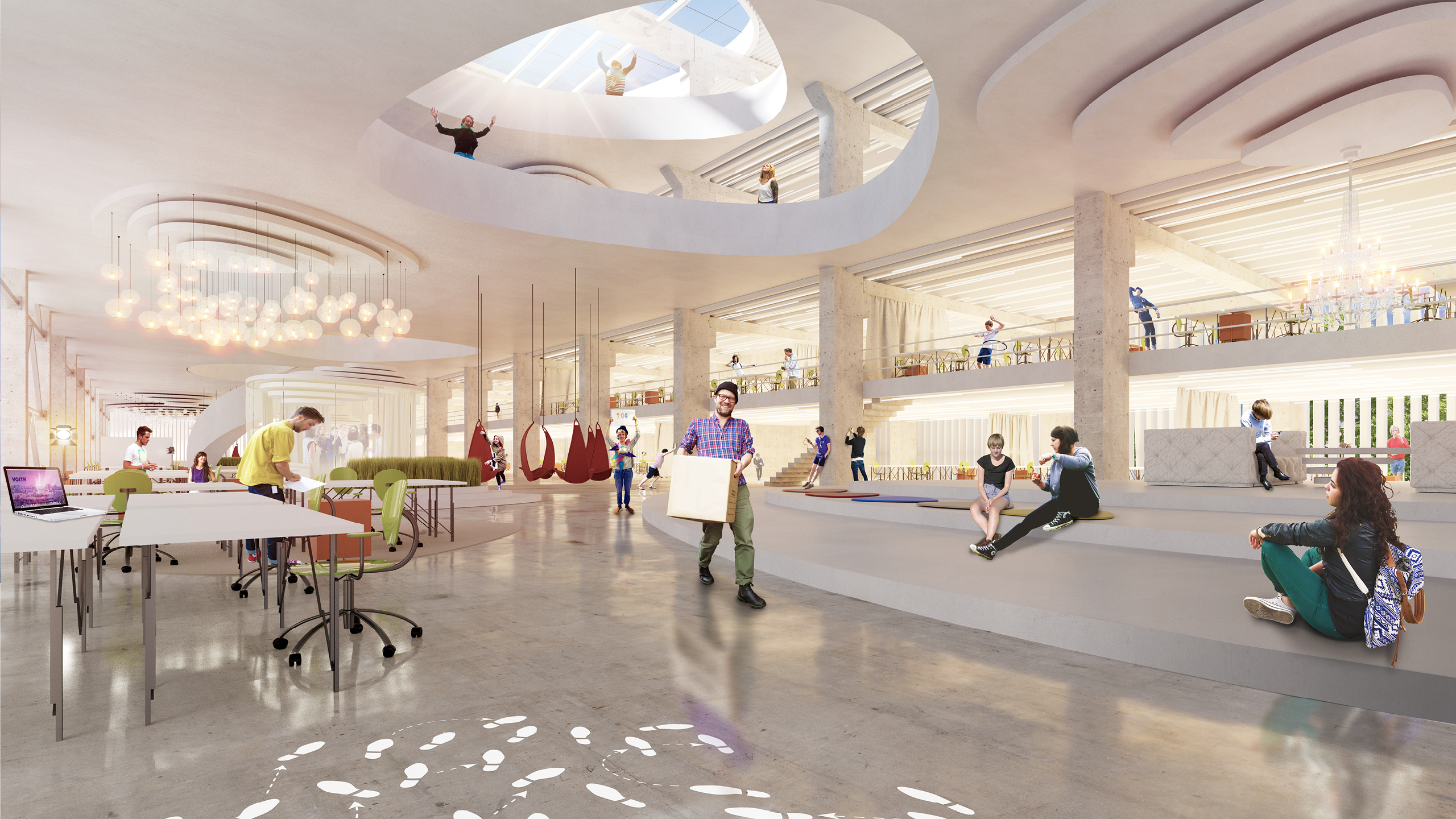 Flexible, lichtdurchflutete Büroflächen werden durch kommunikative Lufträume durchdrungen und lassen eine innovative Denkfabrik entstehen, die Austausch, Begegnung und Kommunikation ermöglicht und das Gefühl der Zusammengehörigkeit und den Teamgeist stärken.