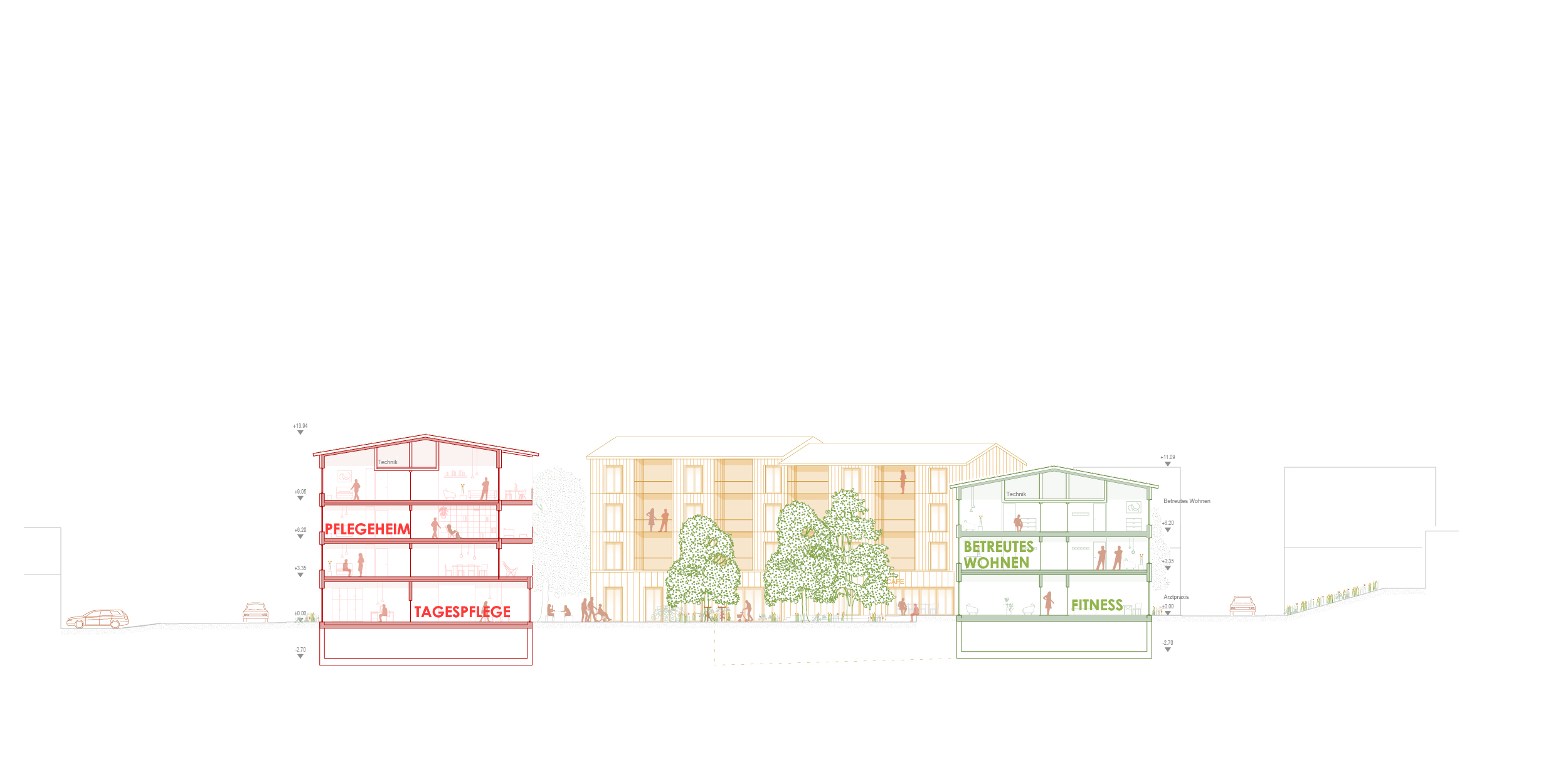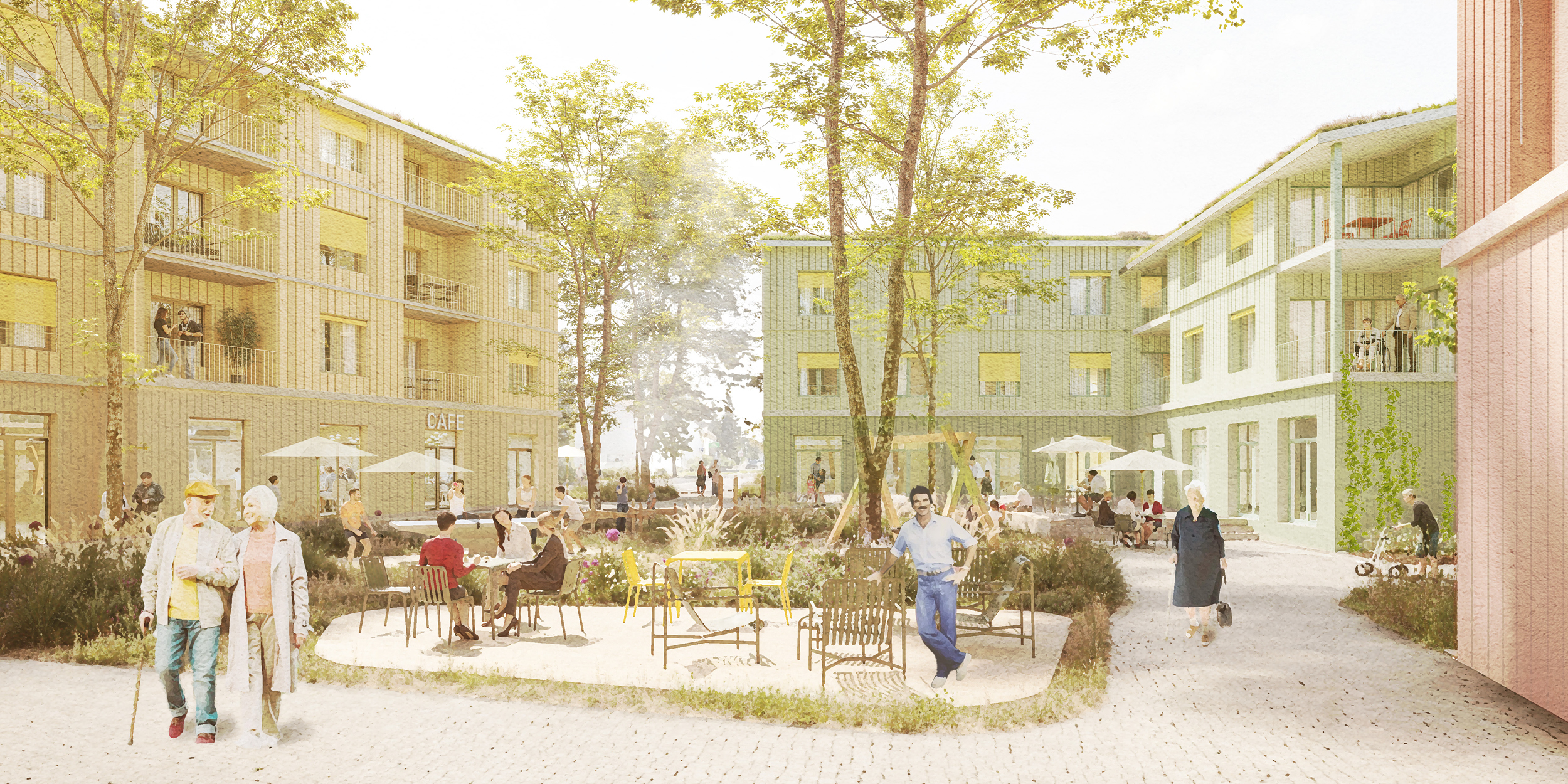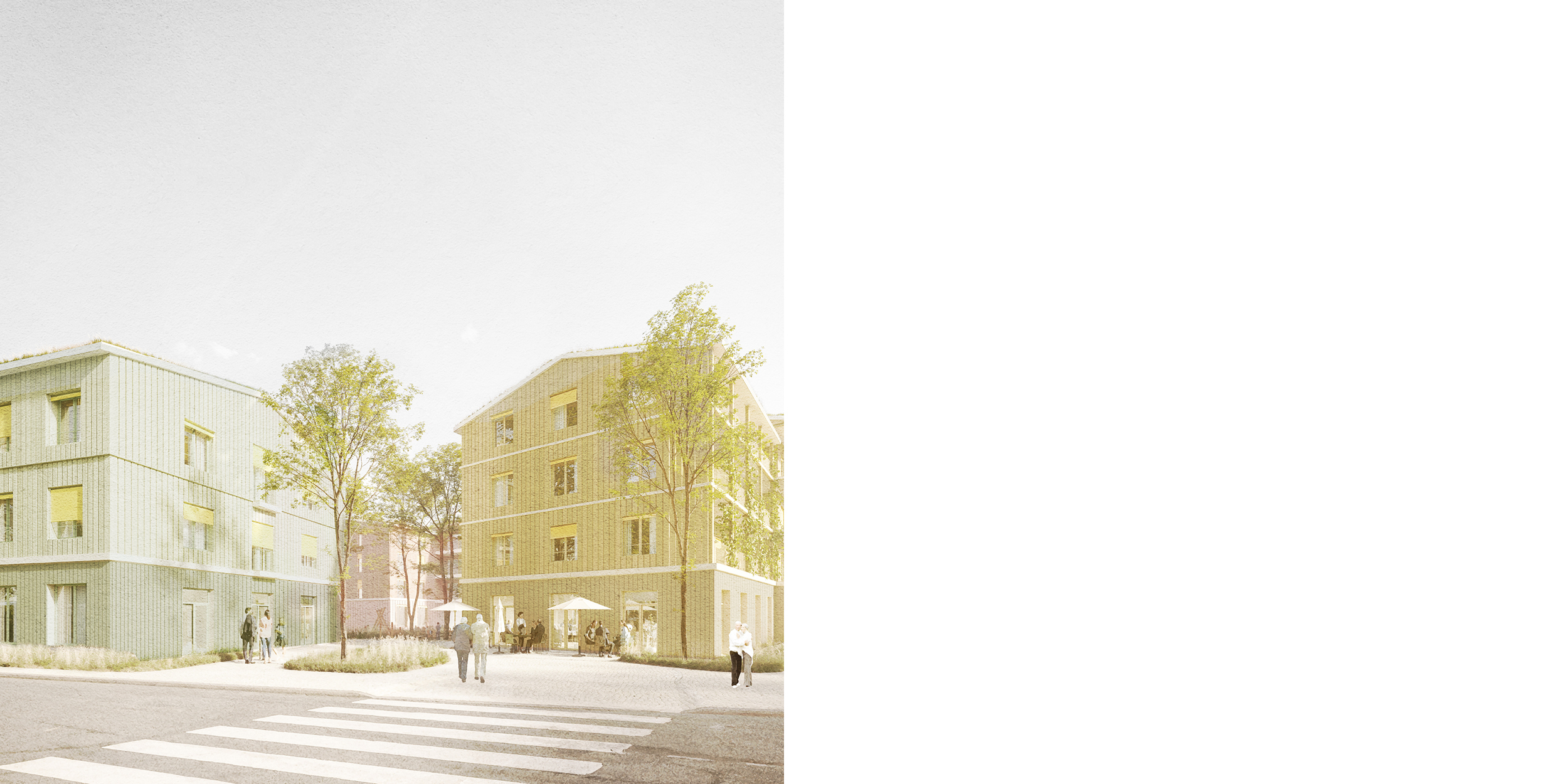Die Architektur übersetzt die städtebauliche Haltung in eine klare und zugleich einladende Gestalt. Ein durchgehendes Sockelgeschoss mit großzügigen Verglasungen bildet die Basis des Quartiers. Es öffnet die gemeinschaftlichen Nutzungen zum Stadtraum und verleiht dem Areal einen offenen Charakter. Darüber entwickeln sich differenzierte Wohngeschosse, deren horizontale Gliederung durch leichte Vor- und Rücksprünge und Loggien rhythmisiert wird. So entsteht ein plastisches Fassadenbild mit unterschiedlicher Farbigkeit, das den Baukörpern Lebendigkeit verleiht, ohne ihre Klarheit zu stören.