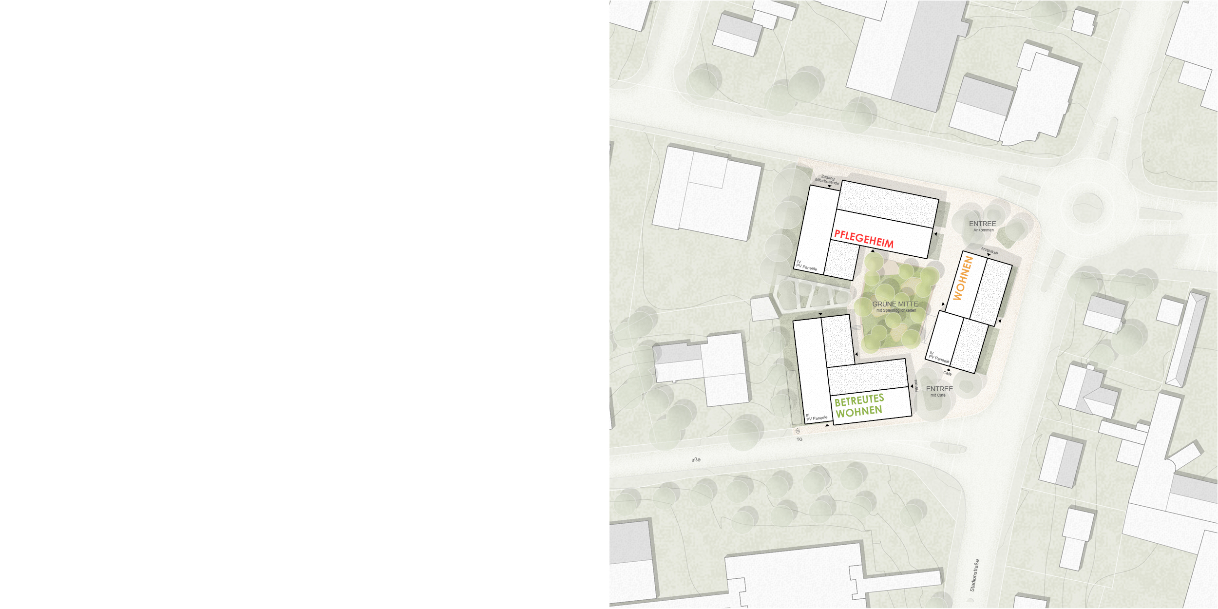 Das neue Areal Heerstraße 79 bildet einen wichtigen Baustein für die stadträumliche Entwicklung am südlichen Eingang von Rottweil. Es markiert den Übergang von der städtischen Verdichtung entlang der Heerstraße zur kleinteiligen Bebauung im Westen und schafft gleichzeitig einen neuen Identitätspunkt. Die städtebauliche Leitidee basiert auf Offenheit und Vernetzung. Drei klar gegliederte Baukörper mit jeweils leicht versetzten Satteldächern rahmen das Grundstück, ohne es abzuschotten. Diese Figur gibt dem Areal eine prägnante Präsenz im Stadtraum und schafft gleichzeitig einen großzügigen Innenhof, der als grüne, gemeinschaftlich nutzbare Mitte wirkt.