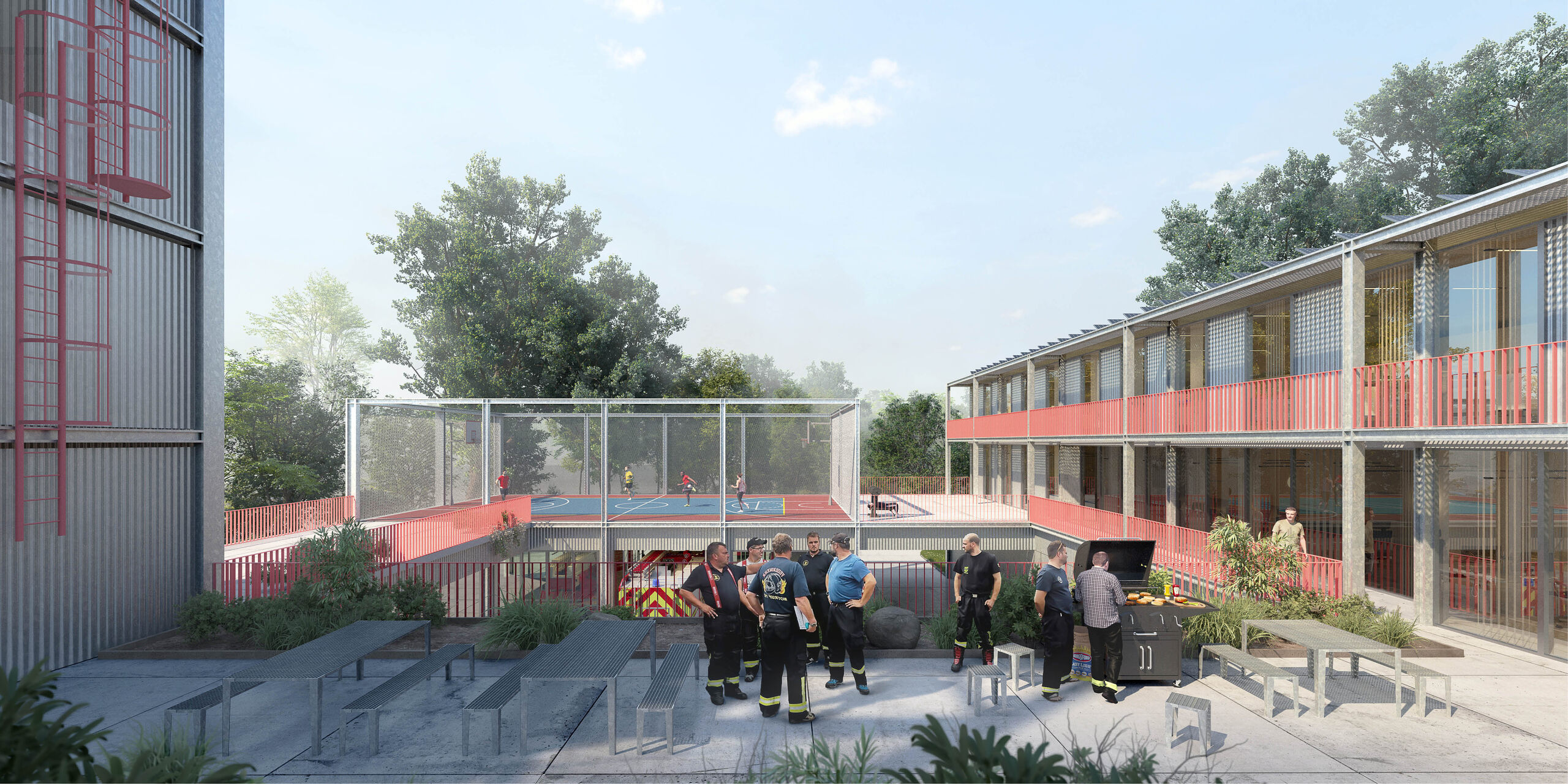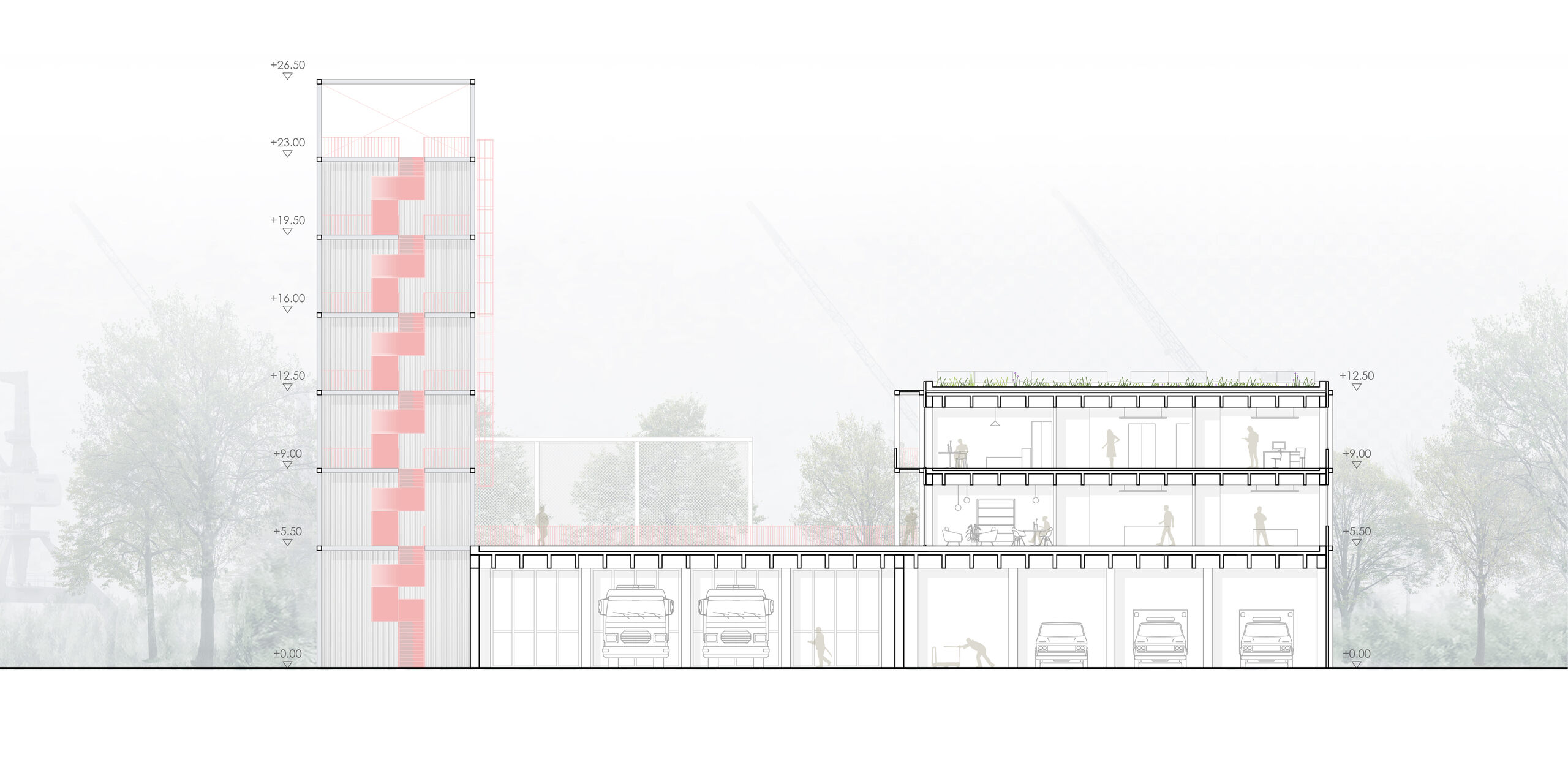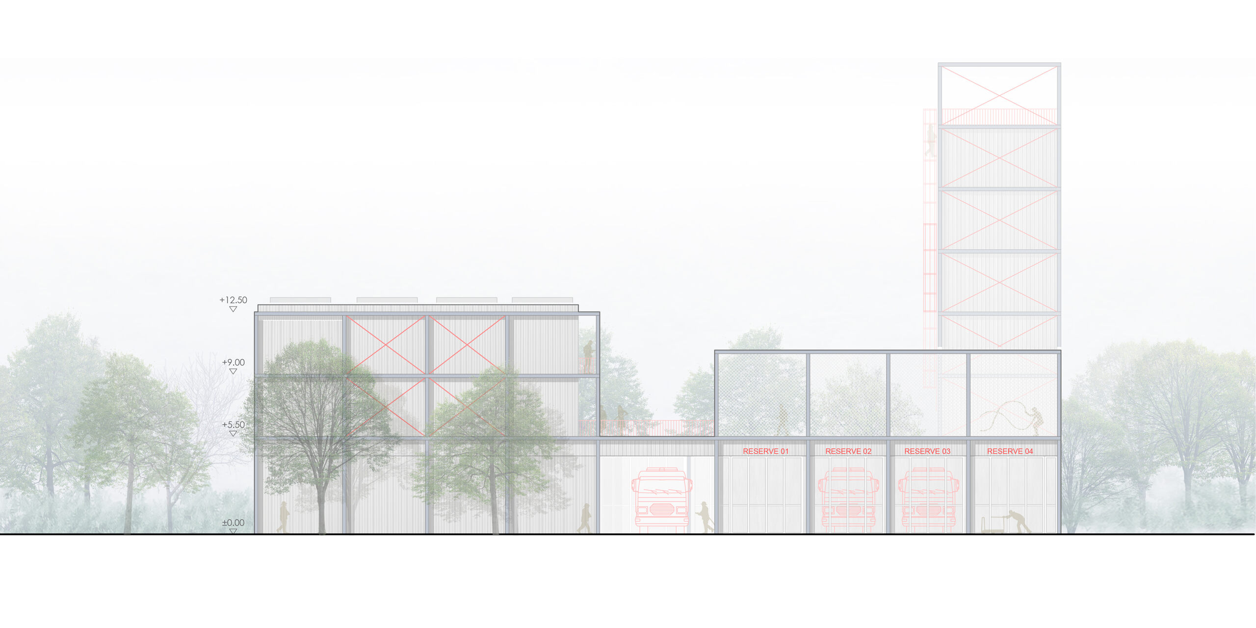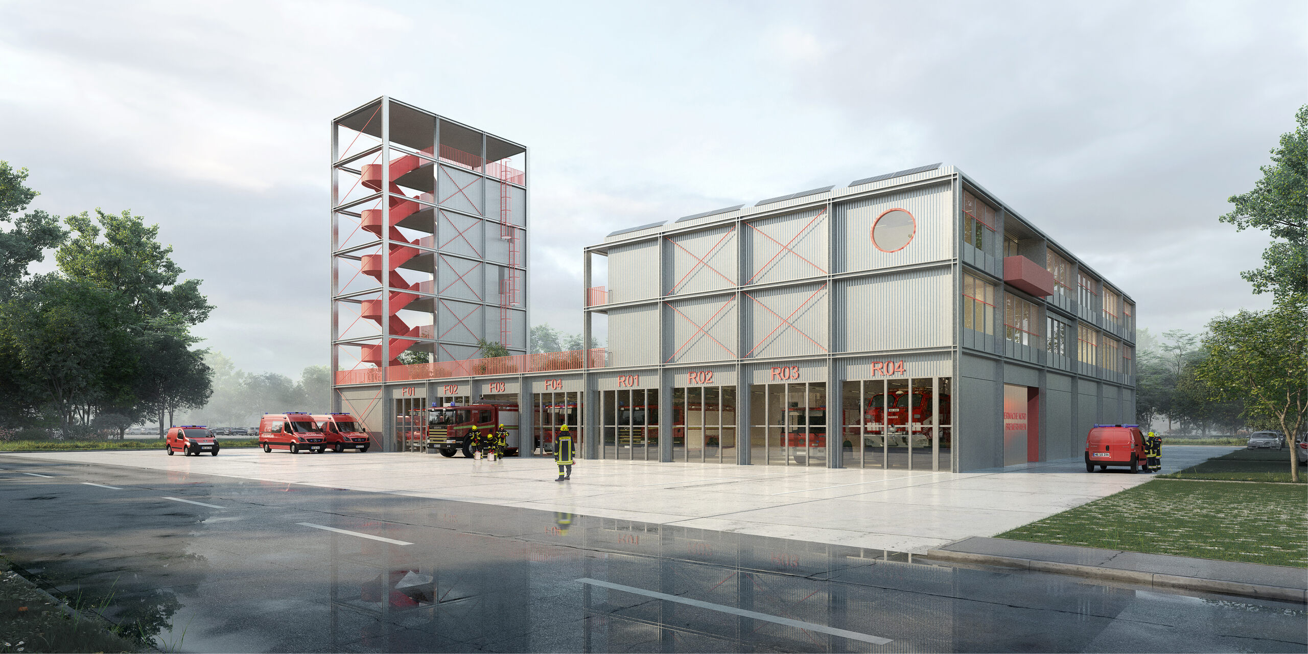 Die Stadt Bremerhaven lobt einen Wettbewerb für den Neubau der Feuer- und Rettungswache Nord am Hafen der Stadt aus. Für die unterschiedlichen Nutzungen des Neubaus wird eine einfache, flexible Gebäudestruktur entwickelt. Innerhalb des Gebäudes sorgen kurze Wegeverbindungen für einen schnellen Einsatz. Baukörperform und Fassadenstruktur spiegeln die innere Organisation und die dynamischen Prozesse der Feuerwehr und des Rettungsdienstes wider. Das Gebäude bildet einerseits das vorliegende Raumprogramm ab, andererseits kann die Gebäudestruktur flexibel auf sich ändernde Vorgaben reagieren. Die Konstruktion und Materialität orientiert sich zum einen an der industriellen Umgebung und des Hafencharms, die klare Rasterung und Ausfachung durch Trapezbleche unterliegen jedoch vor allem der Nutzung des Gebäudes.