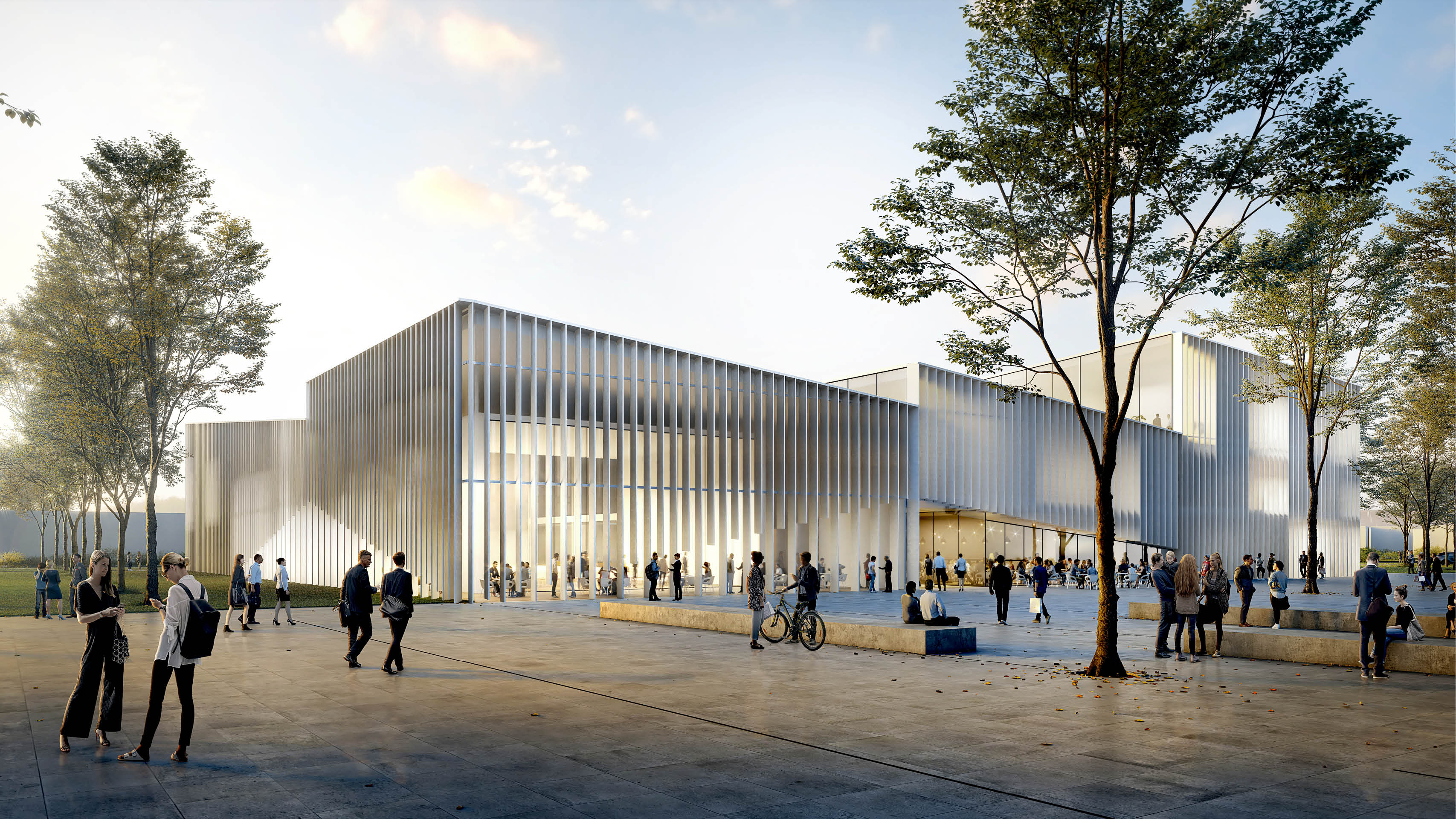Entwurfsbausteinen: der bestehenden aufgewerteten Eishalle, des neuen FORUM-Gebäudes mit