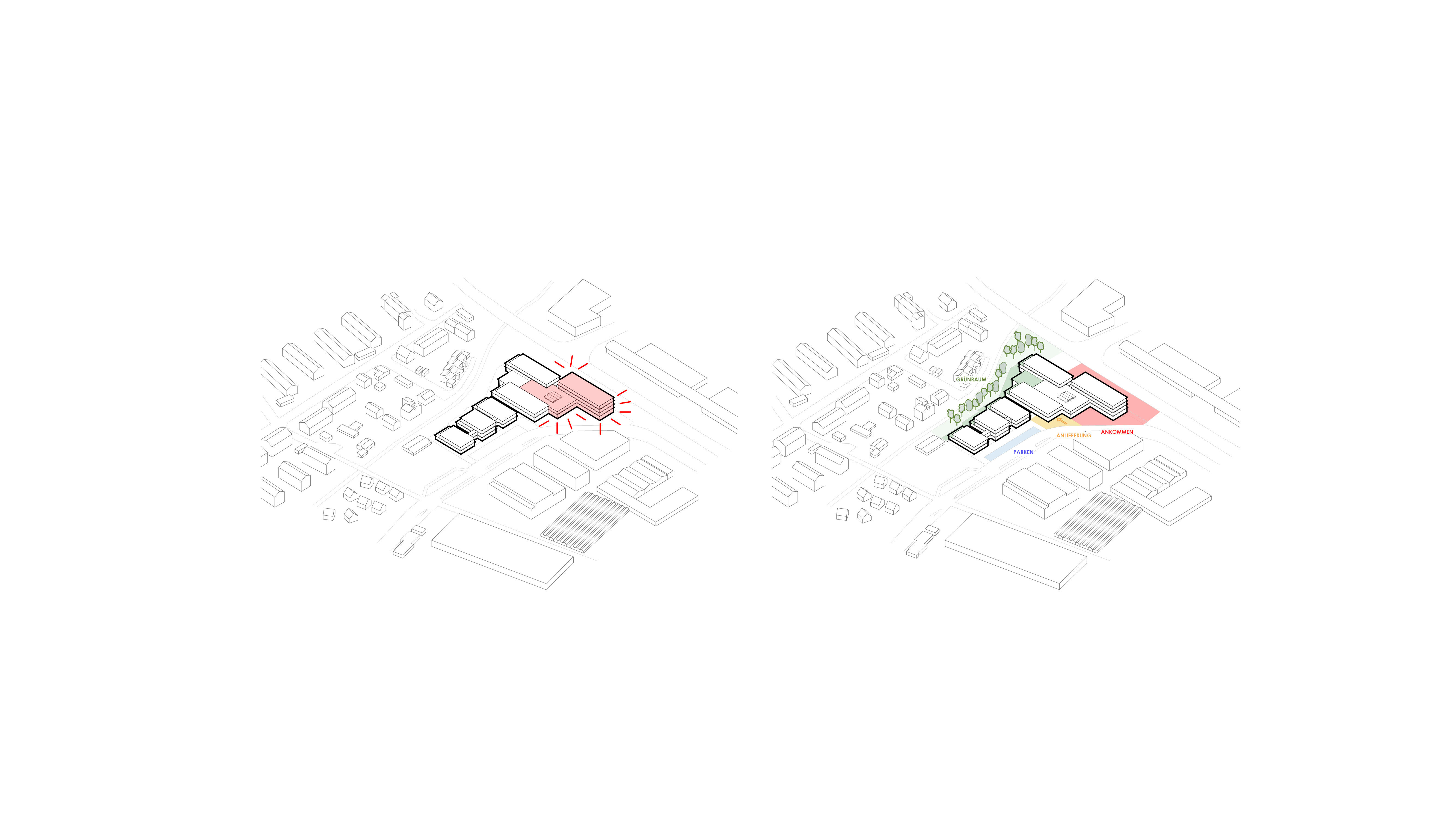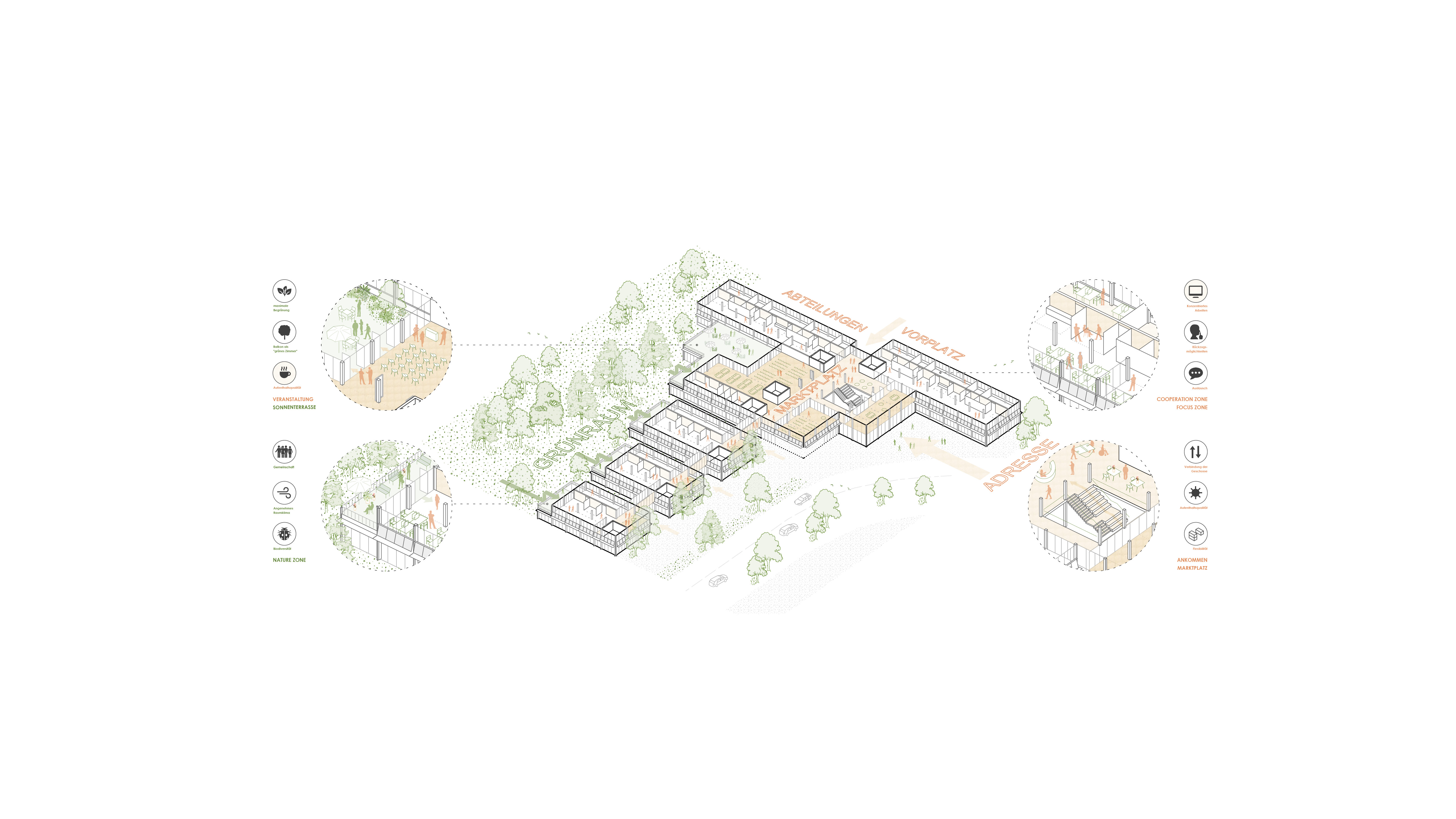 Der Entwurf von Steimle Architekten verzahnt die Gebäudestruktur mit der Landschaft. Die Kammartige Gebäudestruktur zeigt sich als gegliederte, differenzierte Volumina, die die Maßstäblichkeit der Umgebung aufnehmen und in zeitgemäßer Sprache interpretieren.