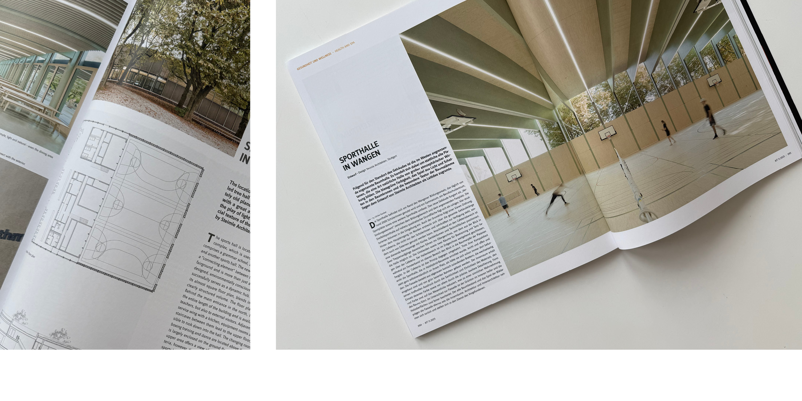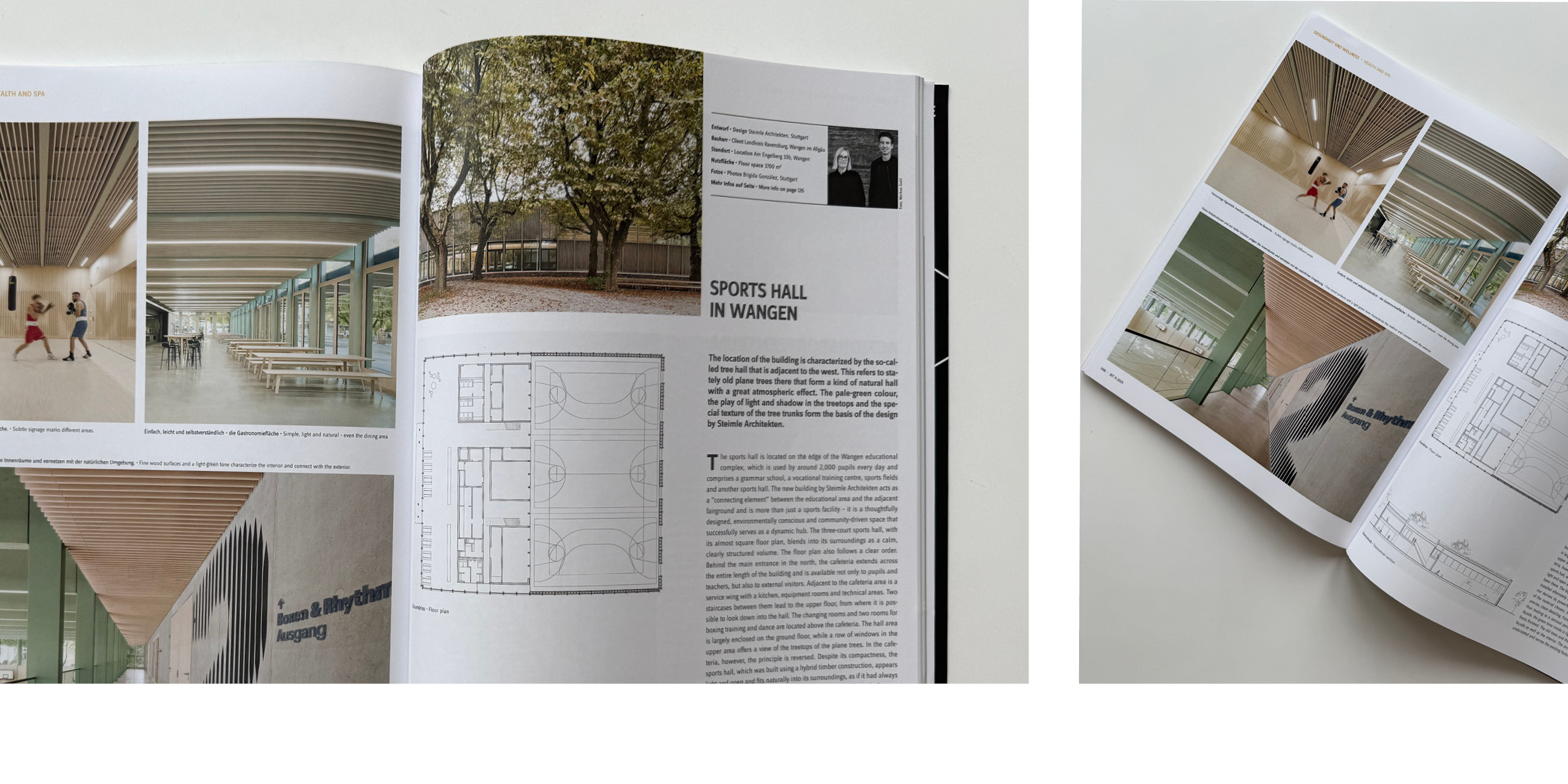 "Prägend für den Standort des Gebäudes ist die im Westen angrenzende sogenannte Baumhalle. Es handelt sich dabei um stattliche alte Plantanen, die eine Art natürliche Halle von großer atmosphärischer Wirkung bilden. Die blassgrüne Farbigkeit, das Spiel aus Licht und Schatten in den Baumkronen und die besondere Textur der Baumstämme liegen dem Entwurf von Steimle Architekten als Leitidee zugrunde." beschreibt Ulrike Kunkel in Ihrem Beitrag über die Sporthalle Wangen im AIT Magazin, die ganz unter dem Motto Gesundheit und Wellness, Health und Spa steht.
