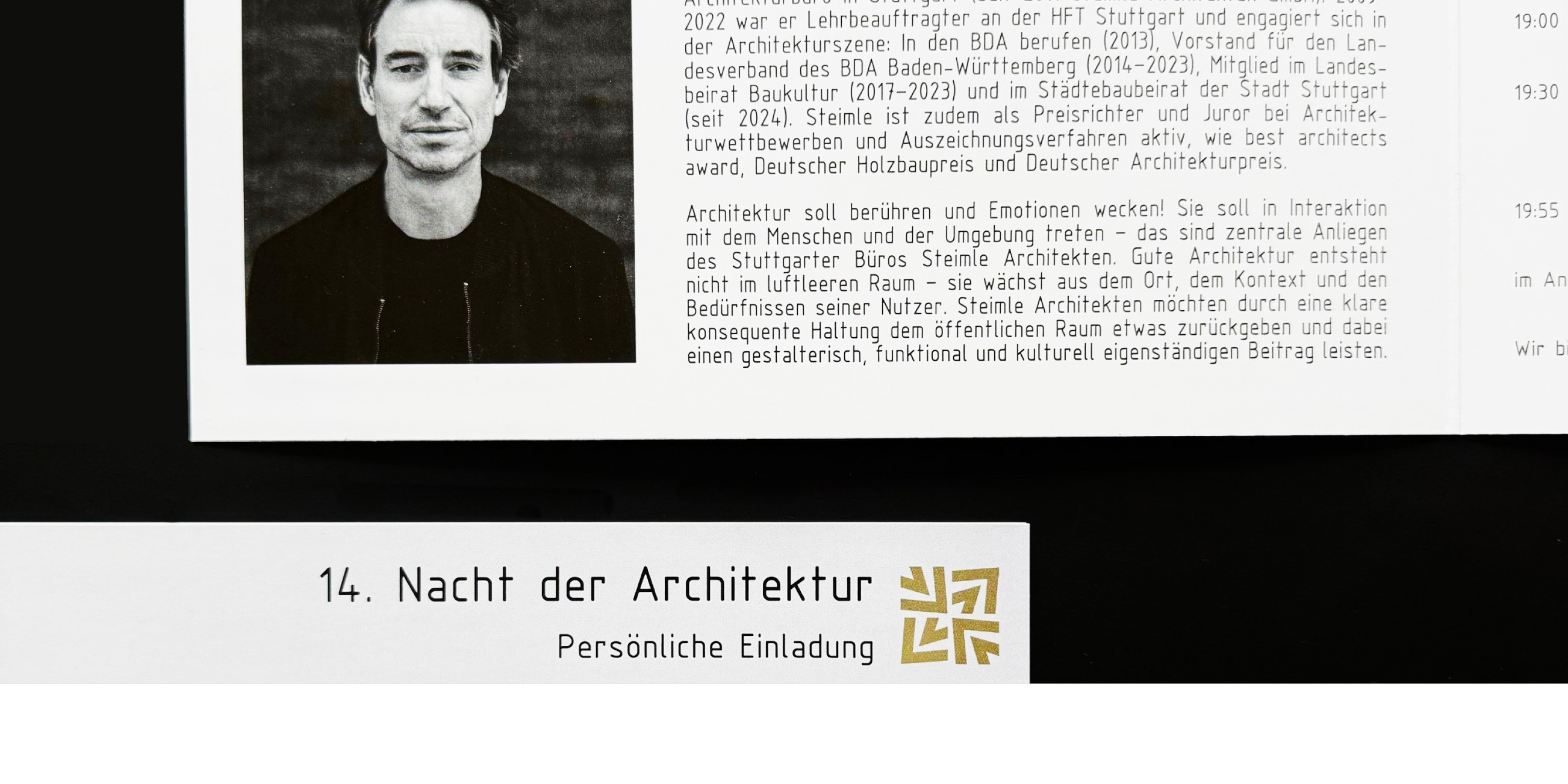 Am Freitag, 21.November findet die 14.Nacht der Architektur in der Kunsthalle Göppingen statt. Thomas Steimle ist als diesjähriger Referent geladen und gibt einen Werkbericht über die Projekte des Büros. Arbeiten zwischen den Herausforderungen unserer Zeit, Nachhaltigkeit, konsequenter Haltung und eigenständigen Bauwerken, die dem öffentlichen Raum etwas zurück geben.