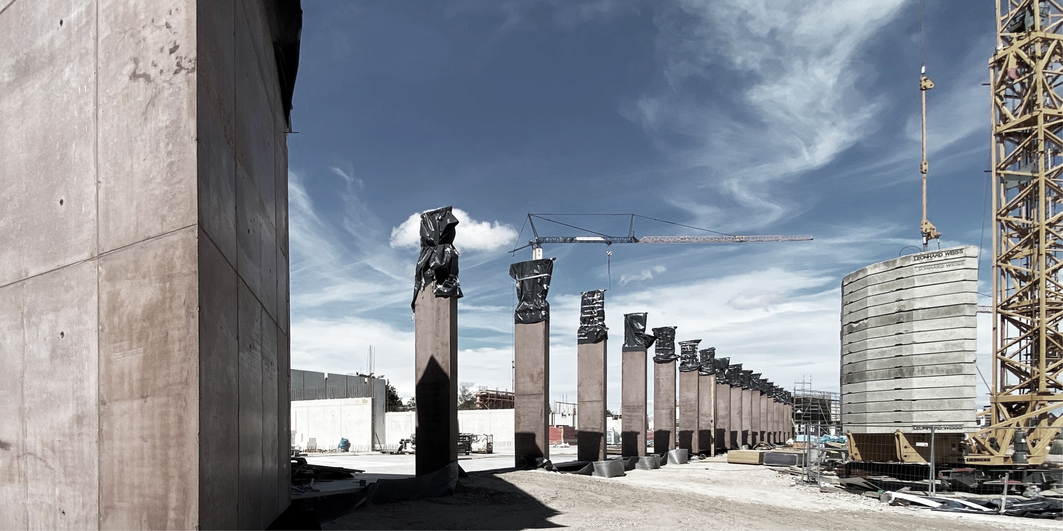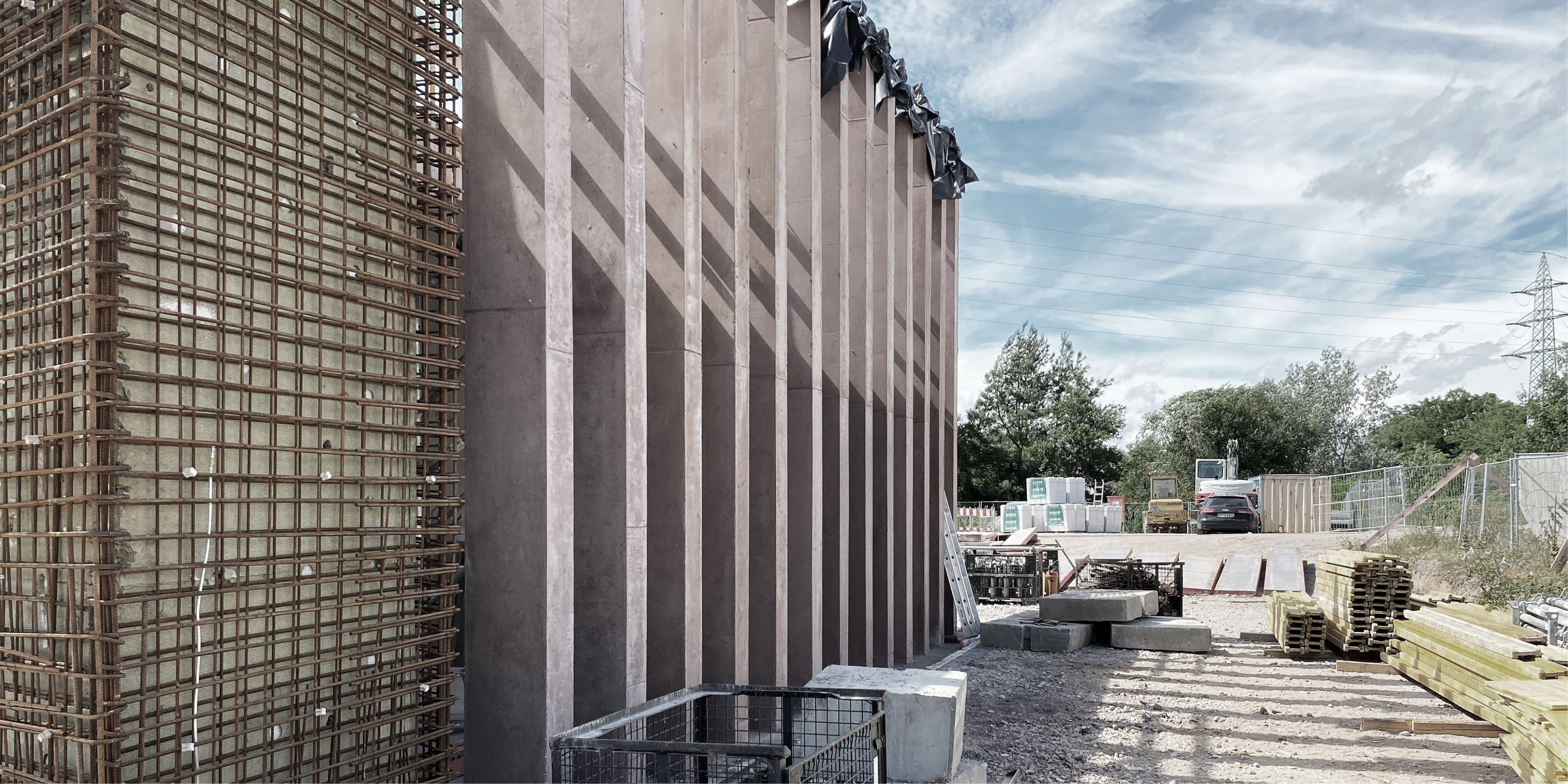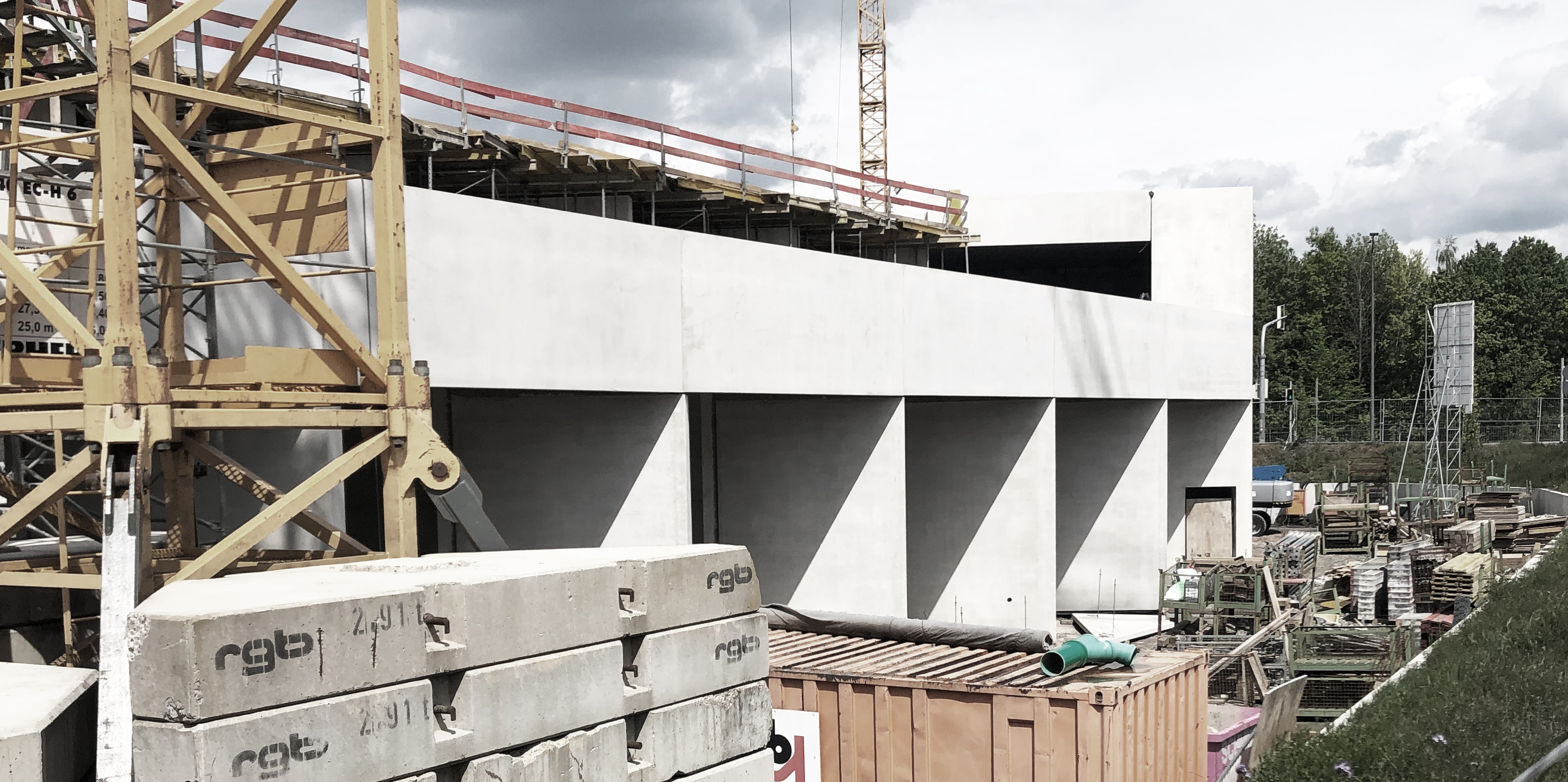 Die Sichtbetonfassade steht bereits, dank der Bauweise der Außenwände als Sandwichkonstruktion.