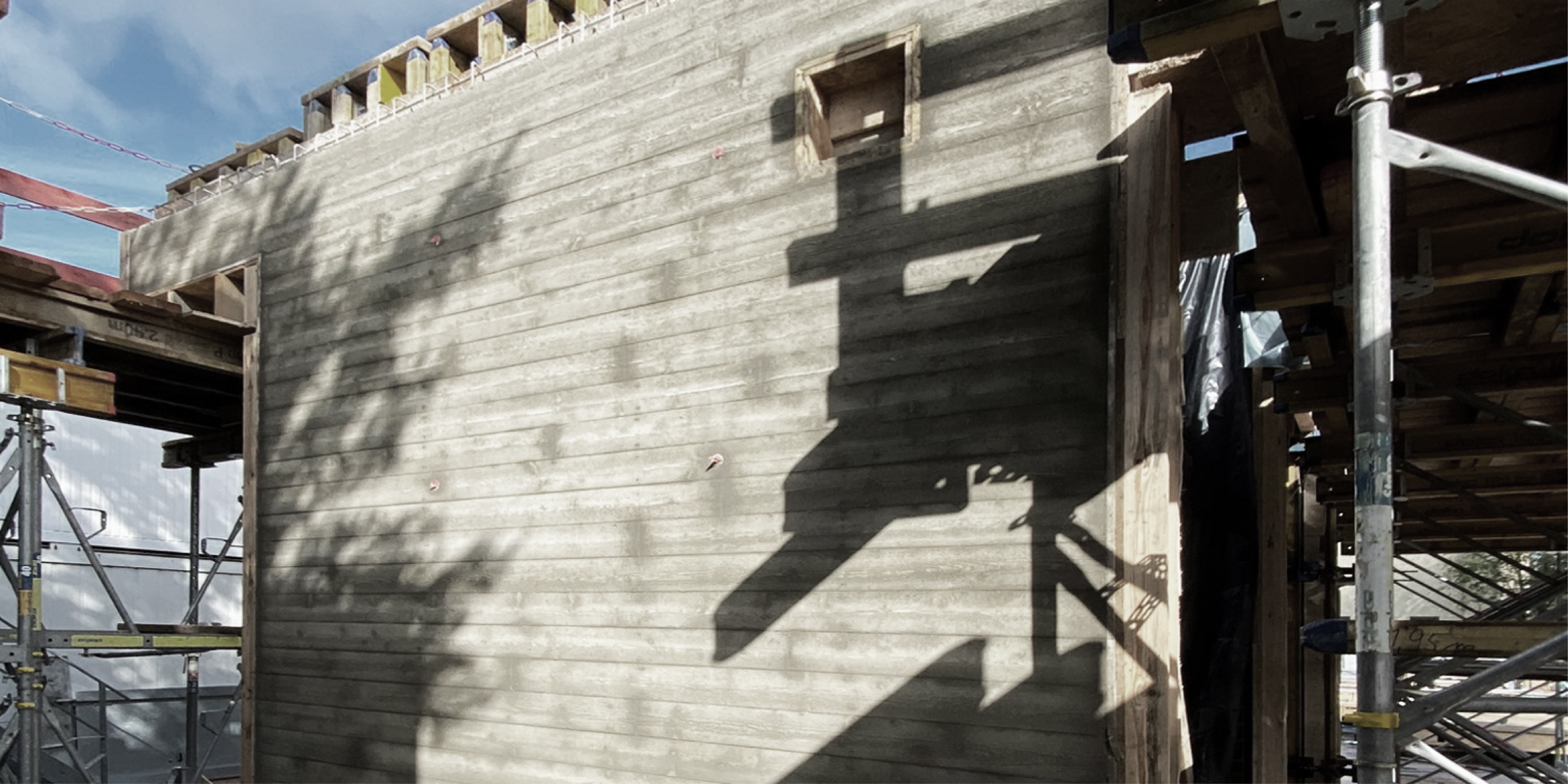 Die erste Ortbetonwand ist ausgeschalt und lässt die schöne Bretterstruktur erkennen.