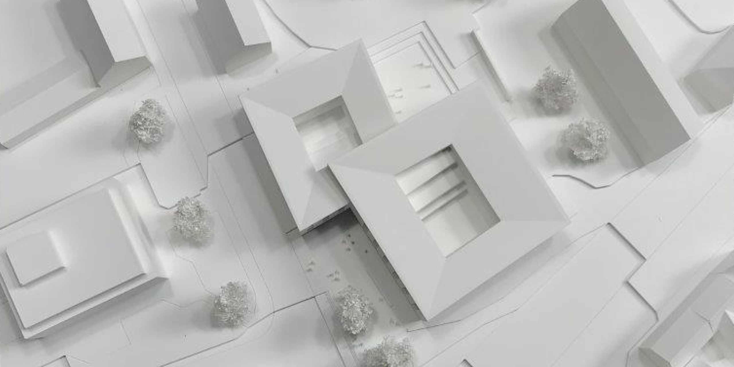 "Mit zwei gegeneinander versetzten und ineinander verschränkten, nahezu quadratischen Baukörpern gelingt es dieser Arbeit mit einfachsten Mitteln, den komplexen städtebaulichen und funktionalen Anforderungen gerecht zu werden.