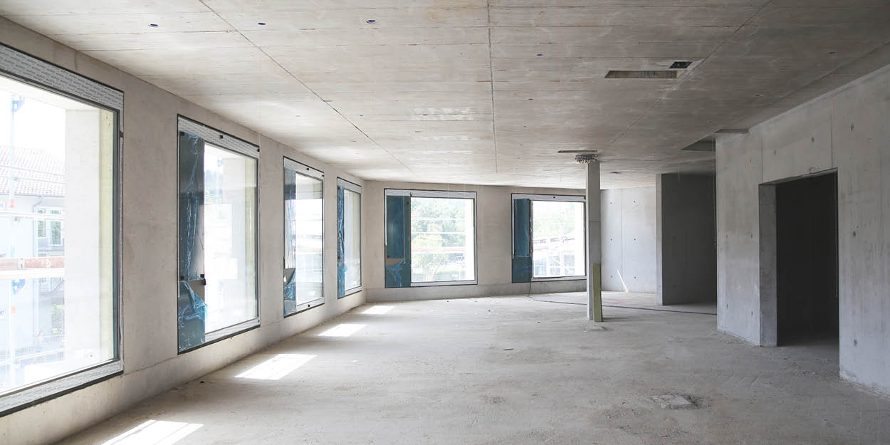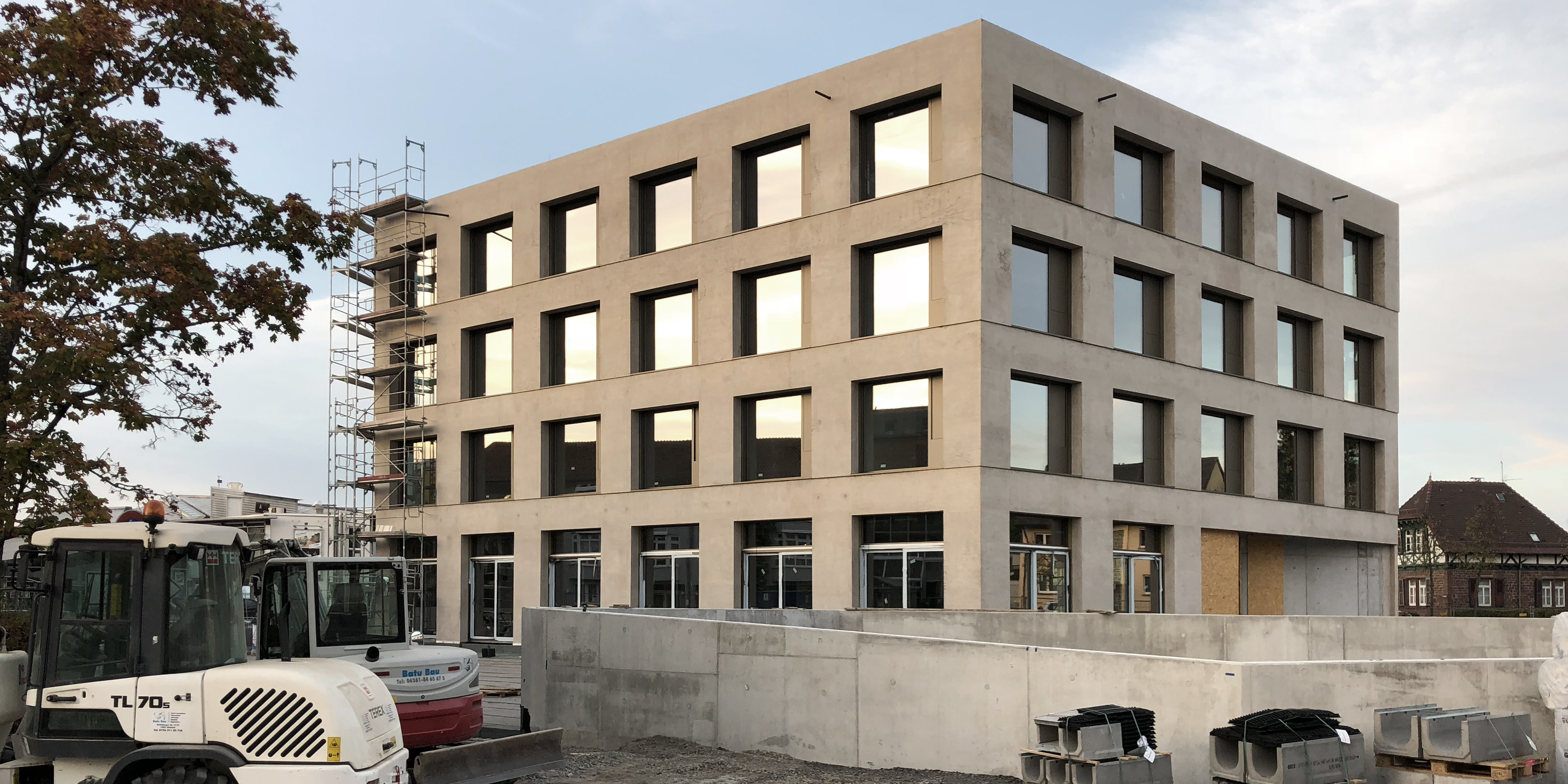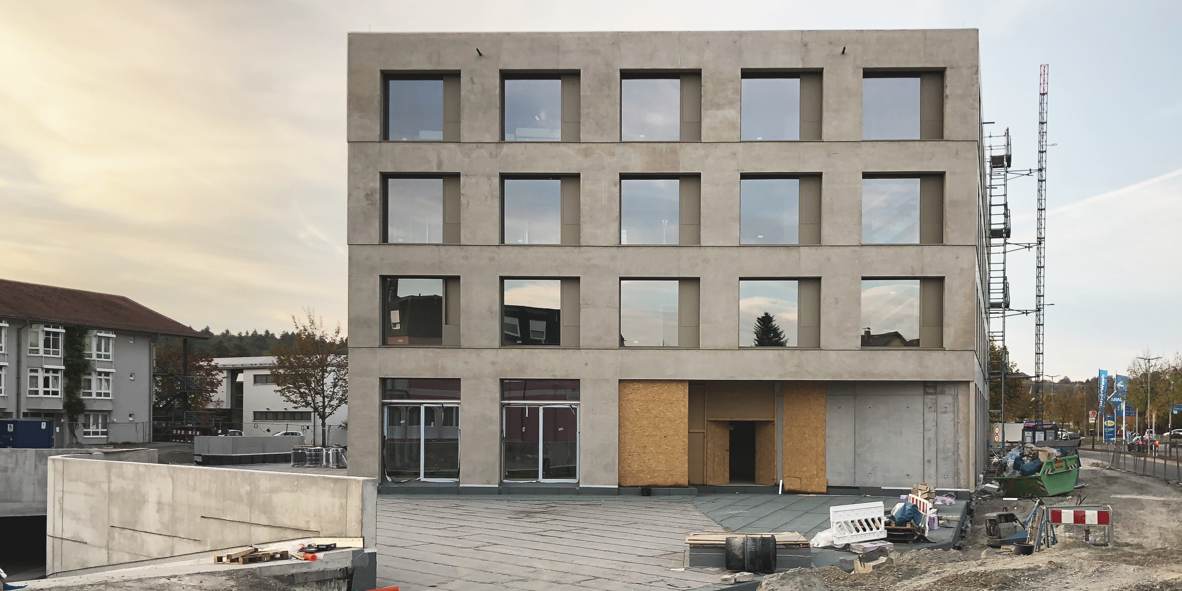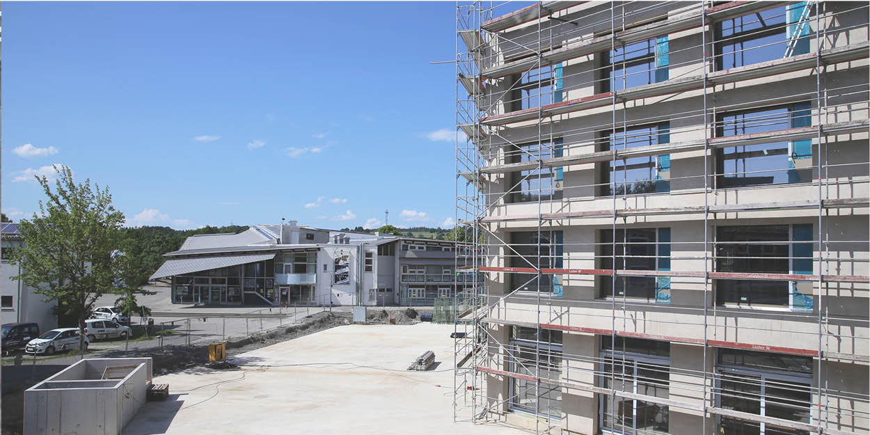 Der Rohbau ist kurz vor der Fertigstellung. Die Fassade und die die Decke des 3.Obergeschosses sind im Bau.