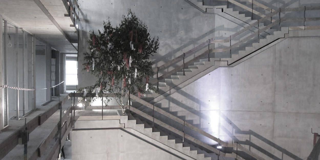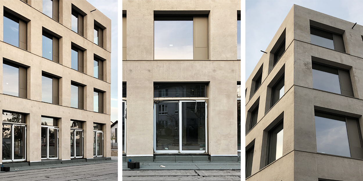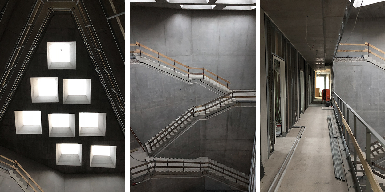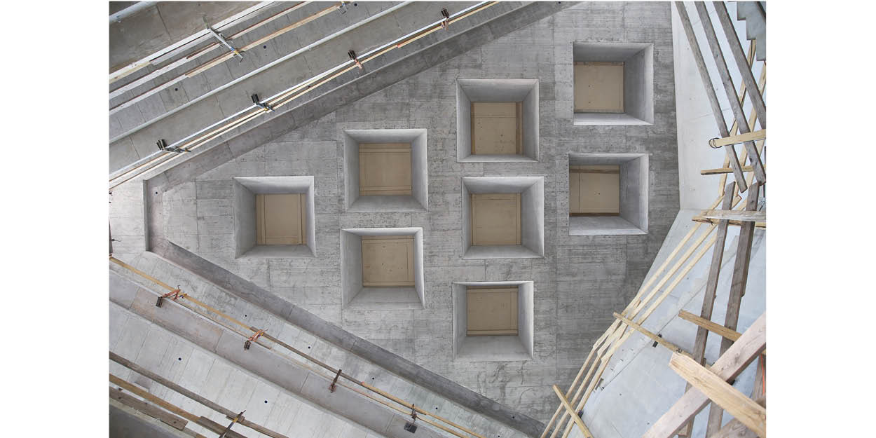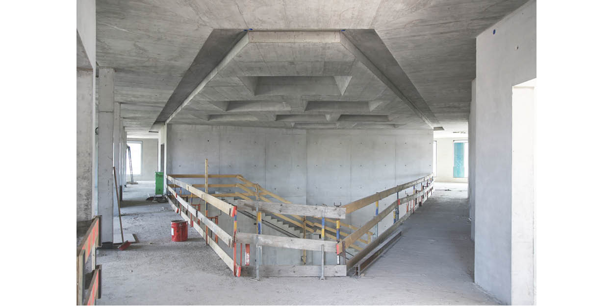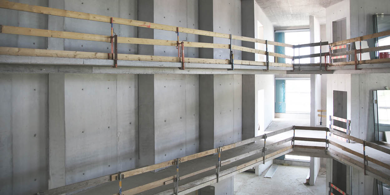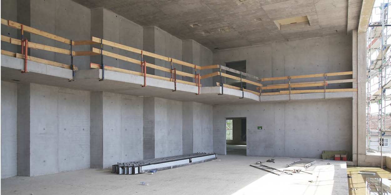 „Die Innenfassade besteht aus Sichtbeton, das heißt, so wie sie jetzt zu sehen ist, wird sie es auch im fertigen Gebäude sein. Extra heller Zement, gebrochener Kalkschotter und die Zugabe von speziellen Sanden bewirken, dass der Beton ein gleichmäßiges Sandsteinfarbenes Aussehen erhält“, erläutert Steimle weiter.