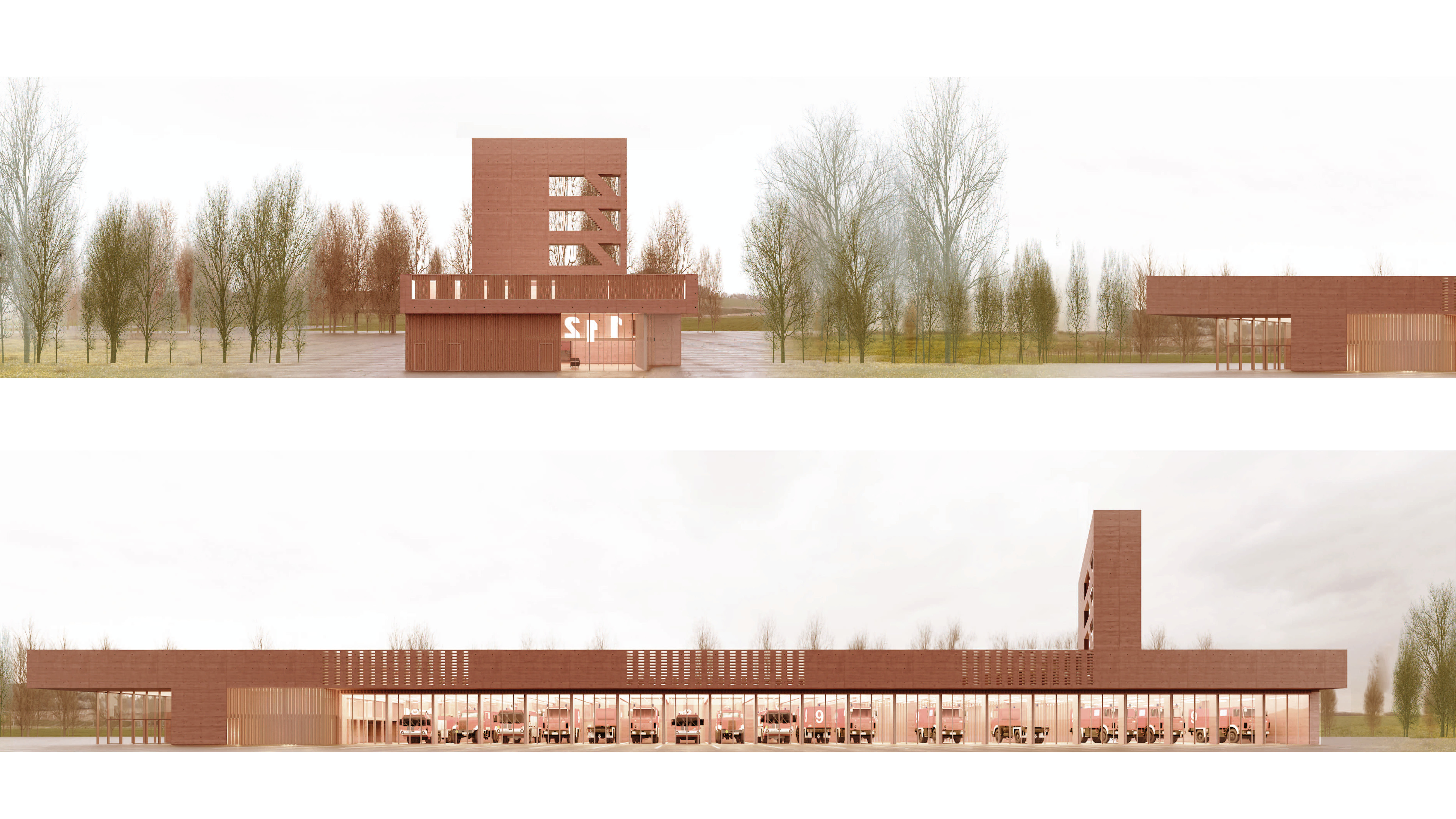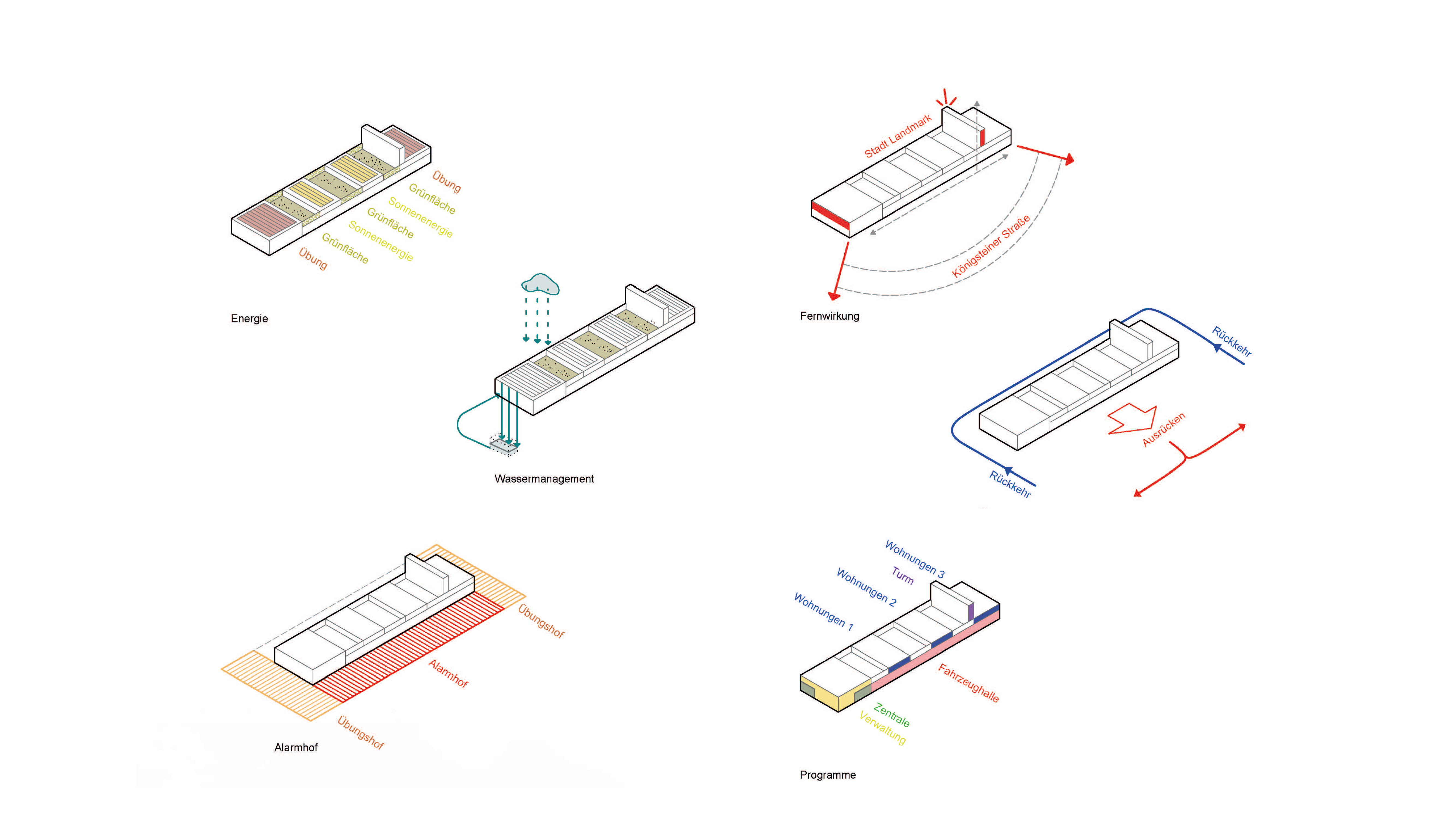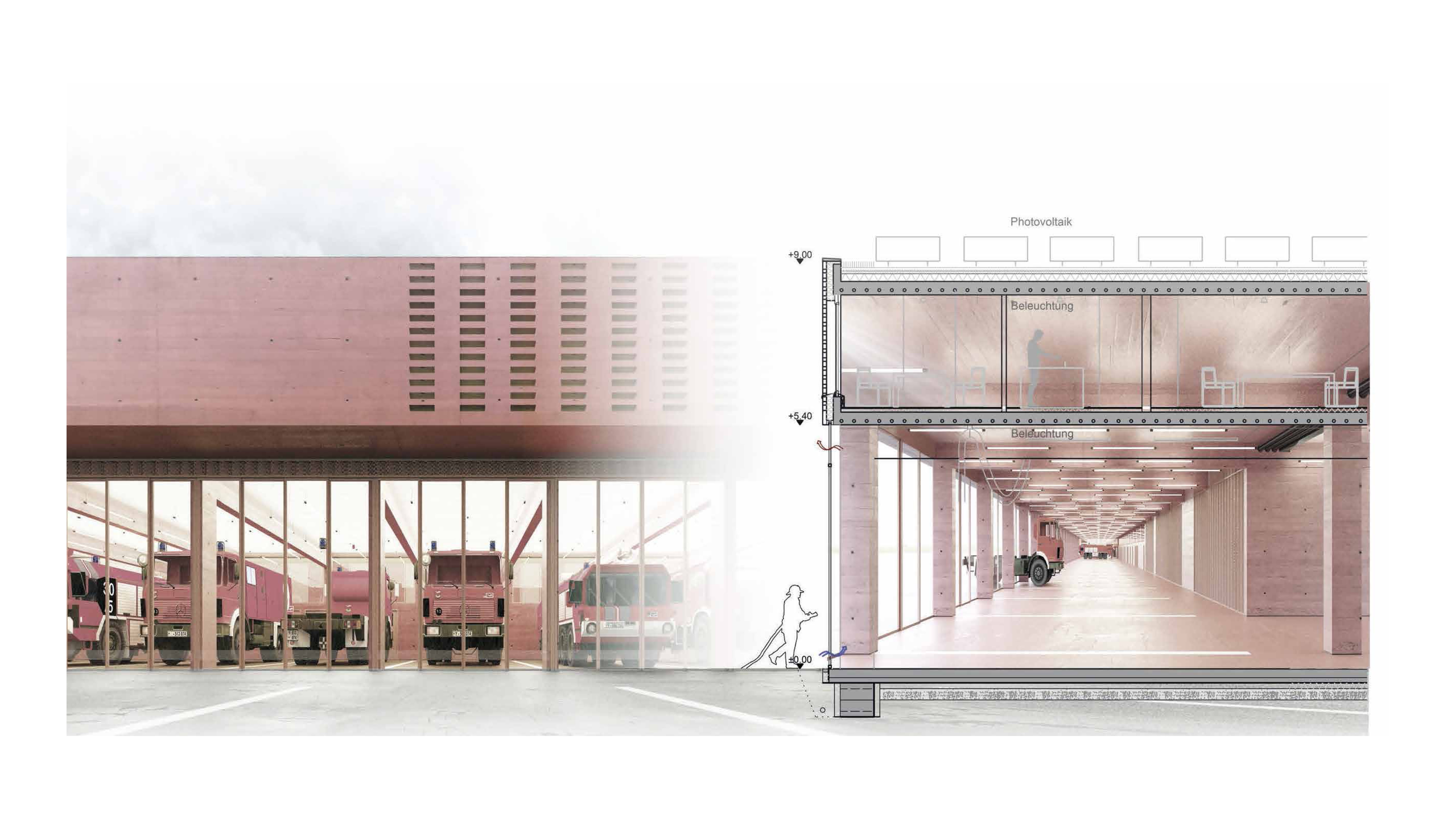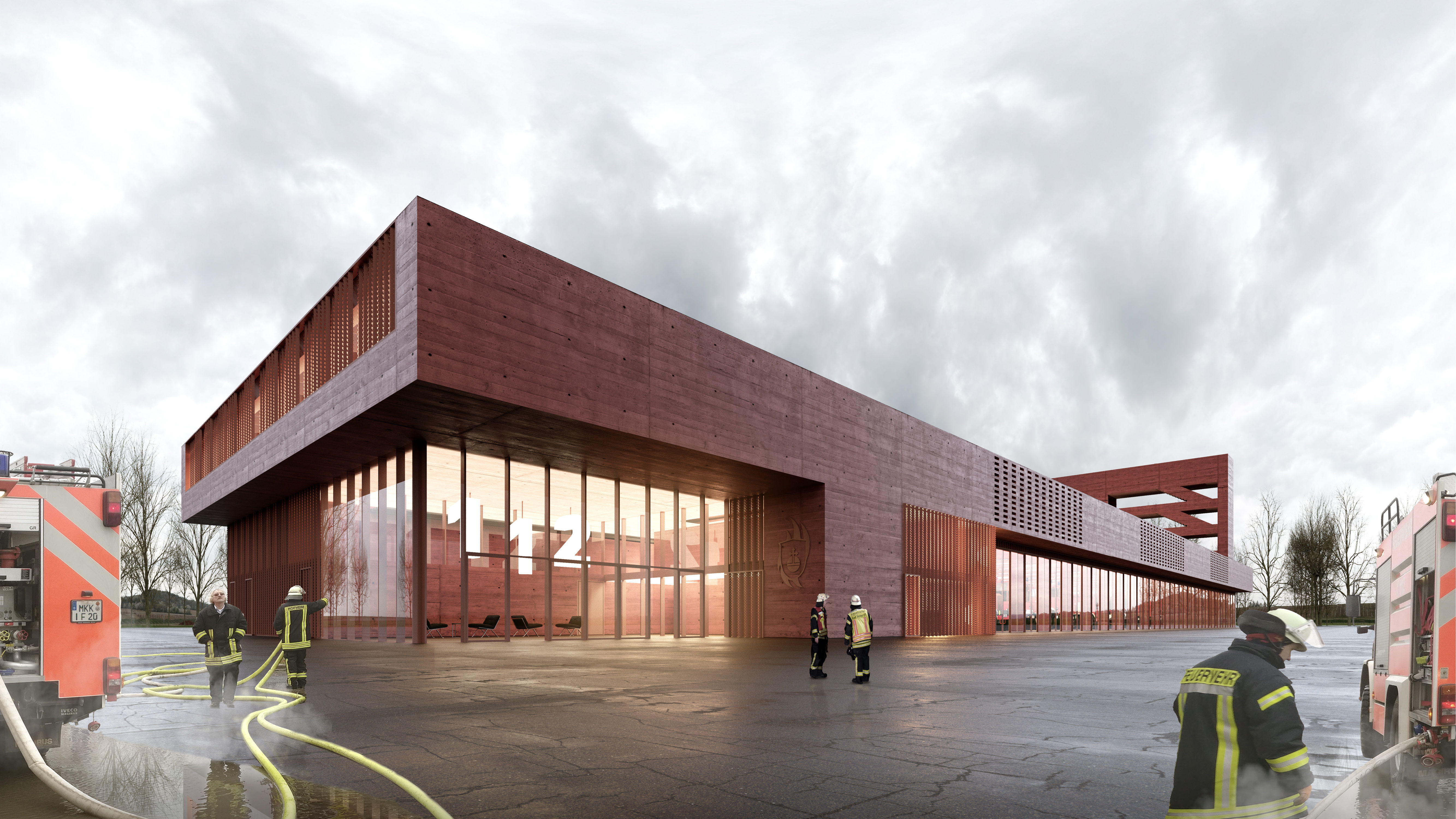 "Der Entwurf besticht durch eine moderne und klare Formensprache, die als Feuerwehr eindeutig erkennbar und im Stadtraum hervorgehoben ist. Der eindeutige und großzügige Eingangsbereich, der prägnante Treppenturm sowie die zur Hauptstrasse angeordnete Fahrzeughalle machen den Standort bereit aus der Ferne kenntlich. Die Differenzierung zwischen gläserner Fahrzeughalle und den darüberliegenden geschlossenen Fassaden bildet einen spannungsvollen Kontrast im städtischen Kontext. Die Platzierung des Baukörpers gliedert das Grundstück sinnvoll und berücksichtigt auch die geplanten Fuß- Radwegeverbindungen entlang der Bahn. Insgesamt zeichnet sich das Gebäude durch eine hohe Funktionalität, kurze Wege und sehr gute Abläufe aus. Der Eingang ist von den Parkplätzen aus schnell erreichbar.