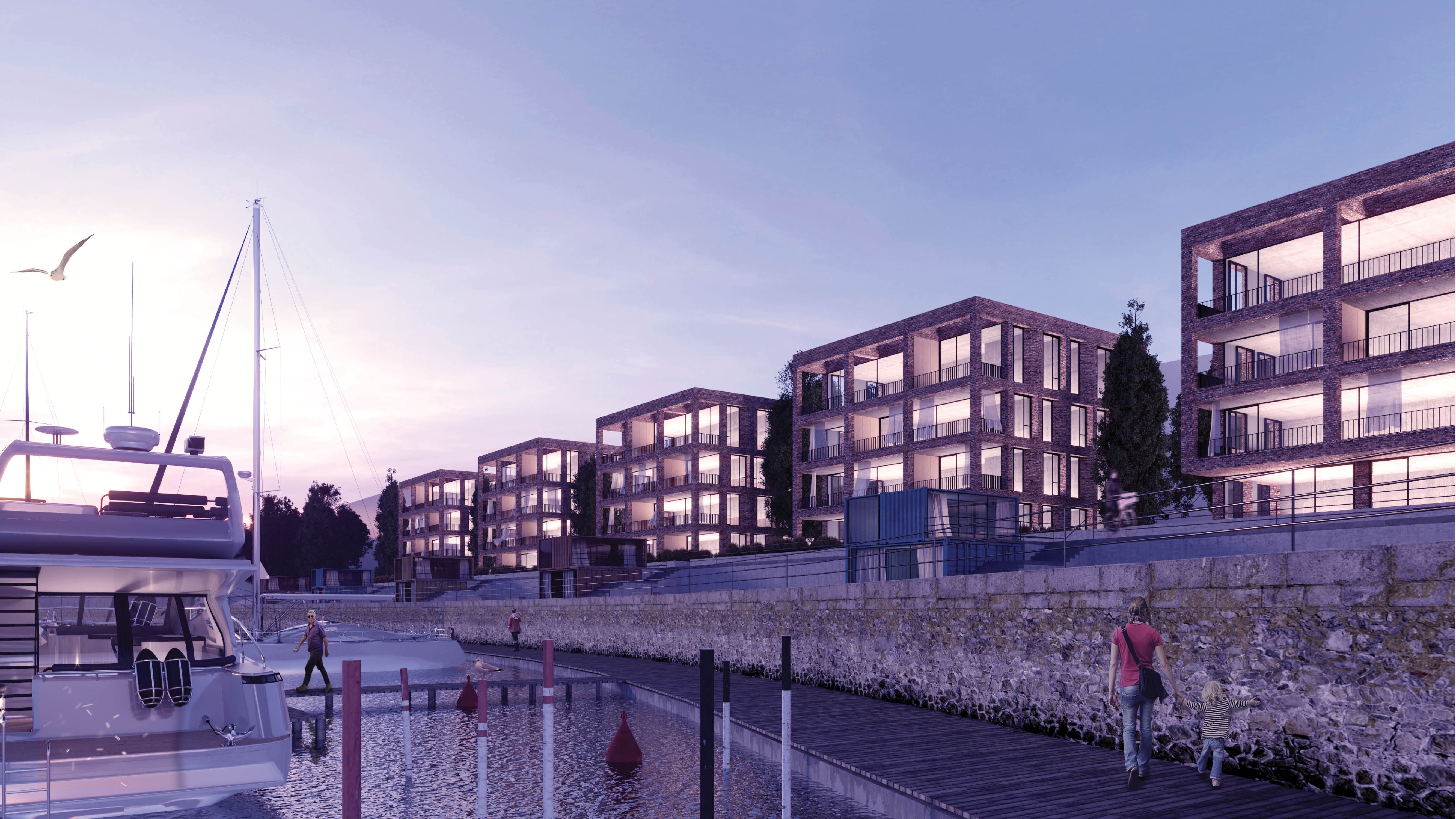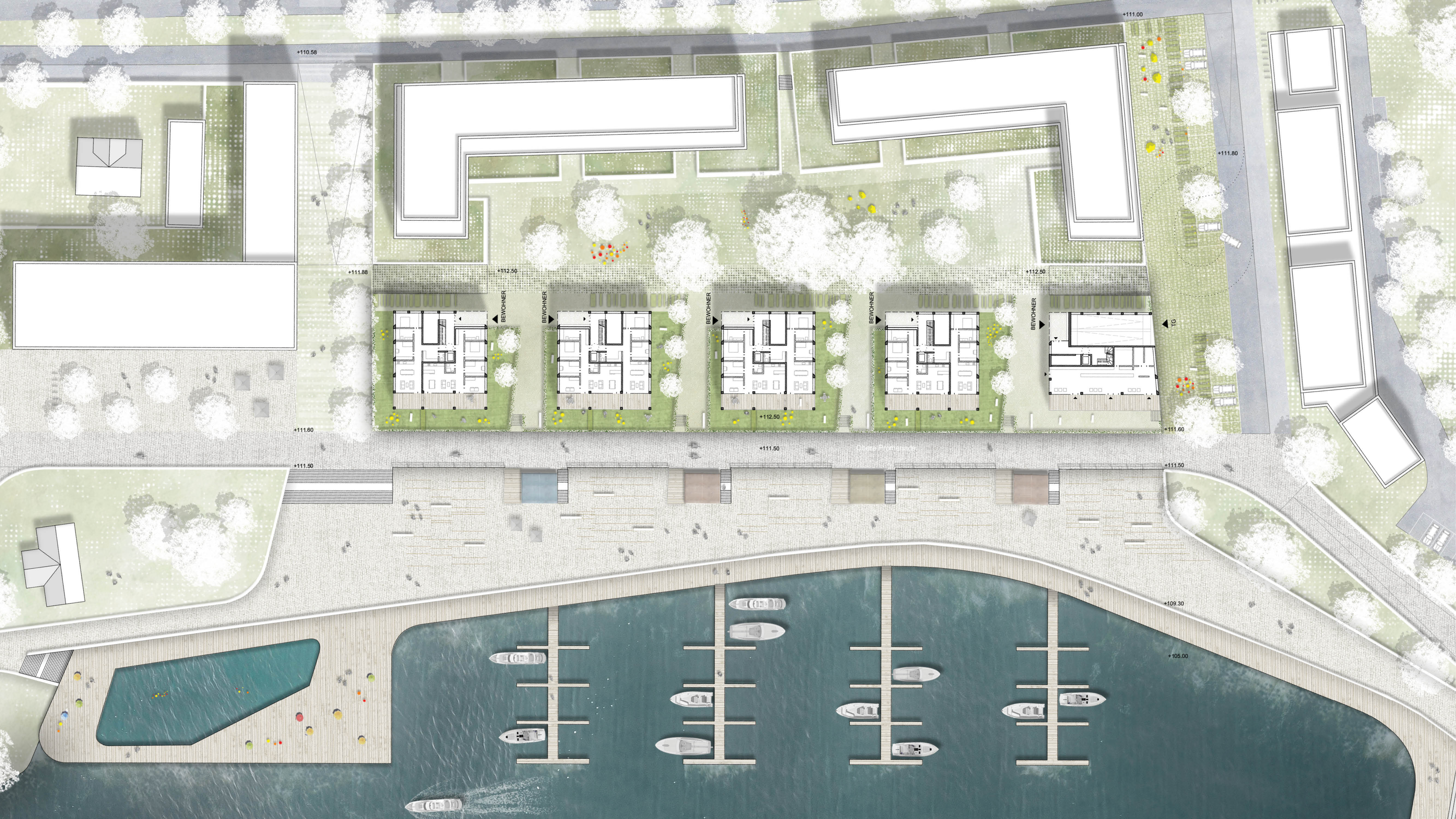 Hierbei verleiht die gewählte architektonische Form des Kubus' den Gebäuden ein Gesicht nach allen vier Seiten hin. Sie lösen auf diese Weise die komplexe städtebauliche Situation, denn so zeigen sich die Gebäude in ihrer bauliche Präsenz sowohl zur Hafenpromenade als auch zum Quartiersinneren.