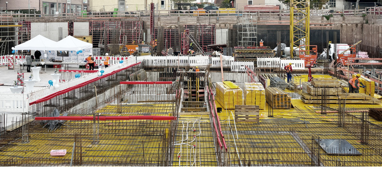 Auf der rechten Seite der Baustelle laufen die Rohbauarbeiten in vollem Gange, während sich auf der linken Seite ein Blasorchester mit Baustellenhelmen einstimmt. Das ist das Bild, dass einen am Montagmorgen, am Tag der Grundsteinlegung in Gunzenhausen auf der Baustelle erwartet hat.