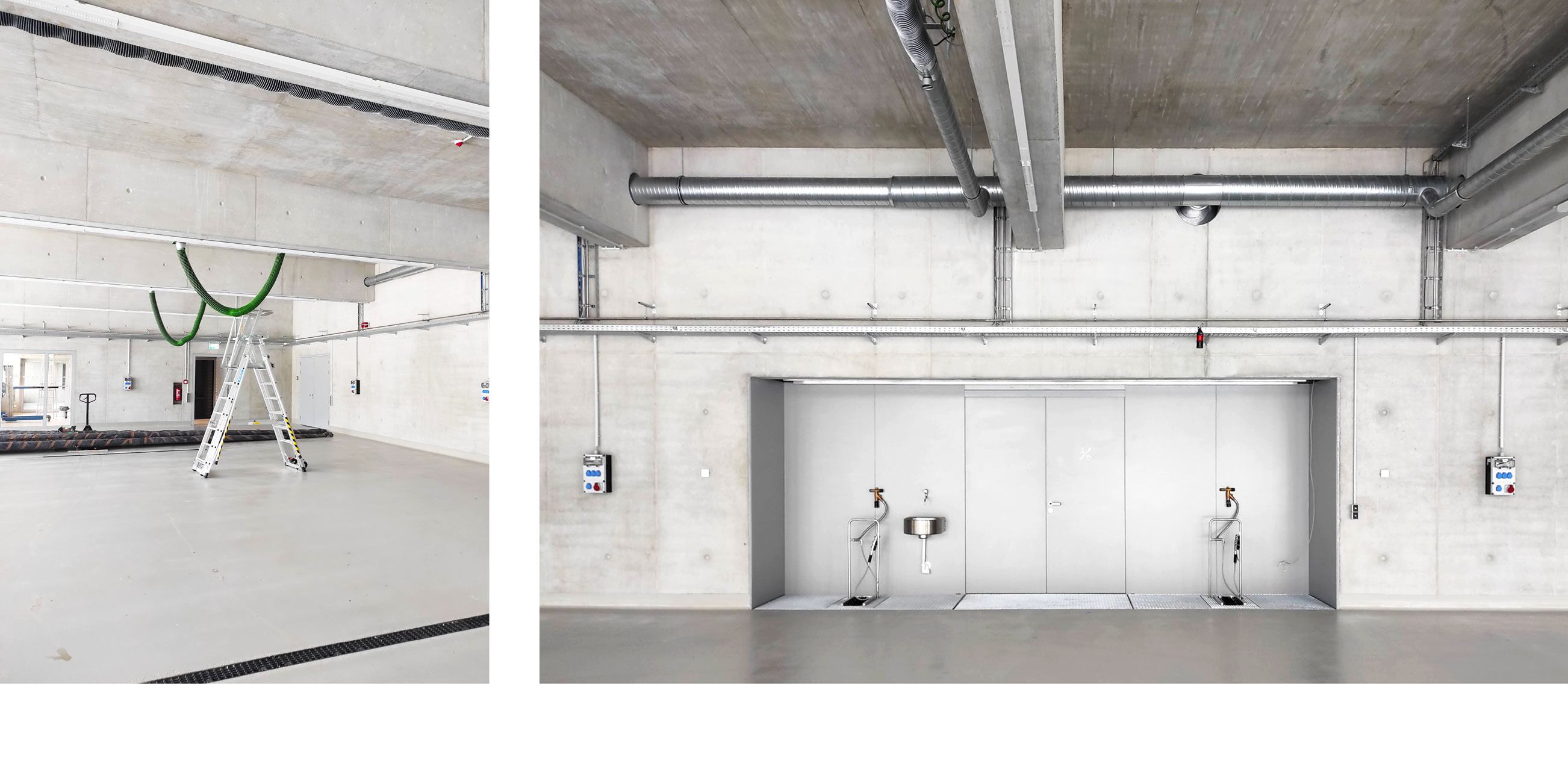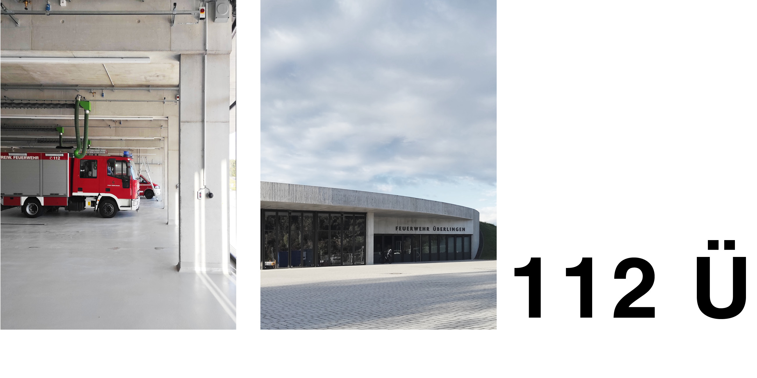 In Überlingen am Bodensee beziehen so langsam die Fahrzeuge der Feuerwehr ihr neues Gebäude. Im Inneren sind Seminarräume und Stiefelwaschanlage bereits fertig für den Einzug. Der Feuerwehrturm und die Aussenanlagen sind noch in der Umsetzung. Der klare, schlichte Baukörper aus Beton schiebt sich aber bereits in den dahinterliegenden Hang. Das formale, runde Vordach öffnet das Gebäude mit einer einladenden Geste und gibt Schutz bei Arbeiten im Freien.