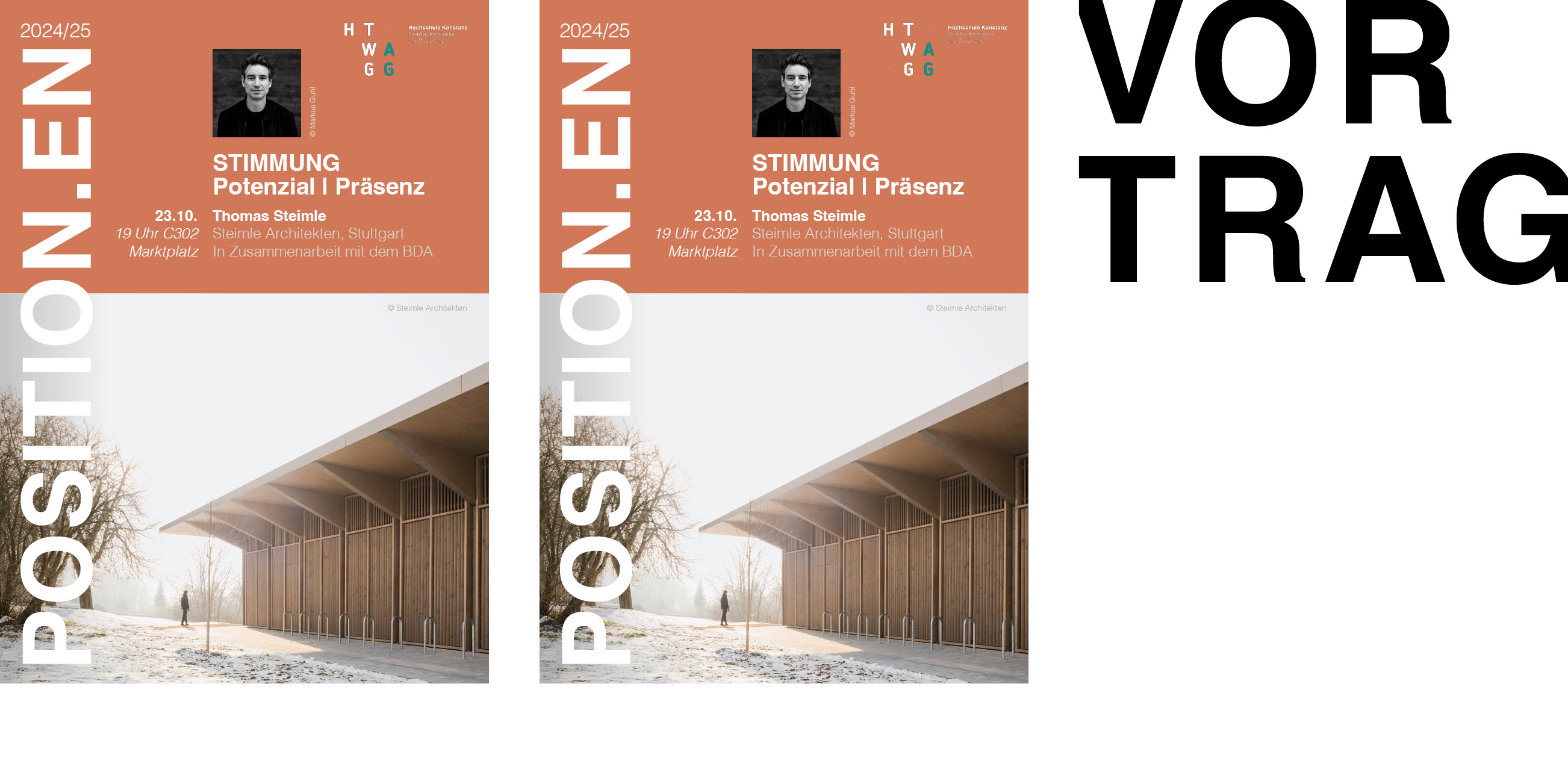 Am 23.10.2024 lädt die HTWG Konstanz zum Vortrag von Thomas Steimle (Steimle Architekten, Stuttgart). Um 19 Uhr geht es unter dem Leitbild : "Stimmung | Potenzial und Präsenz" in der HTWG Konstanz Raum C302 - Marktplatz los. Die Veranstaltung findet in Zusammenarbeit mit dem BDA statt.