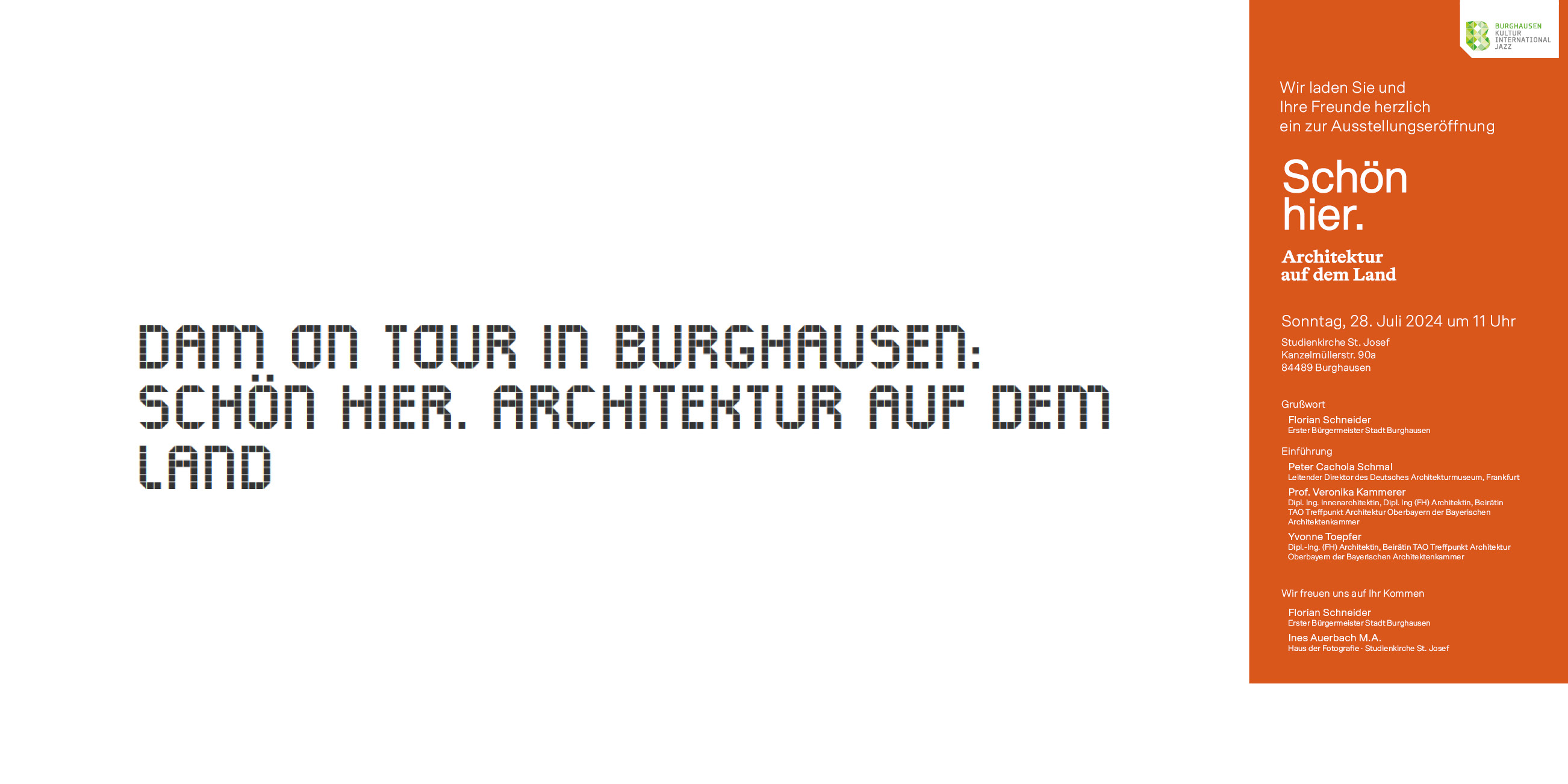 Nun ist das DAM wieder auf Tour und die Ausstellung SCHÖN HIER. ARCHITEKTUR AUF DEM LAND, macht halt in Burghausen. In der Studienkirche St.Josef ist sie vom 28.Juli bis zum 20.Oktober zu sehen.
