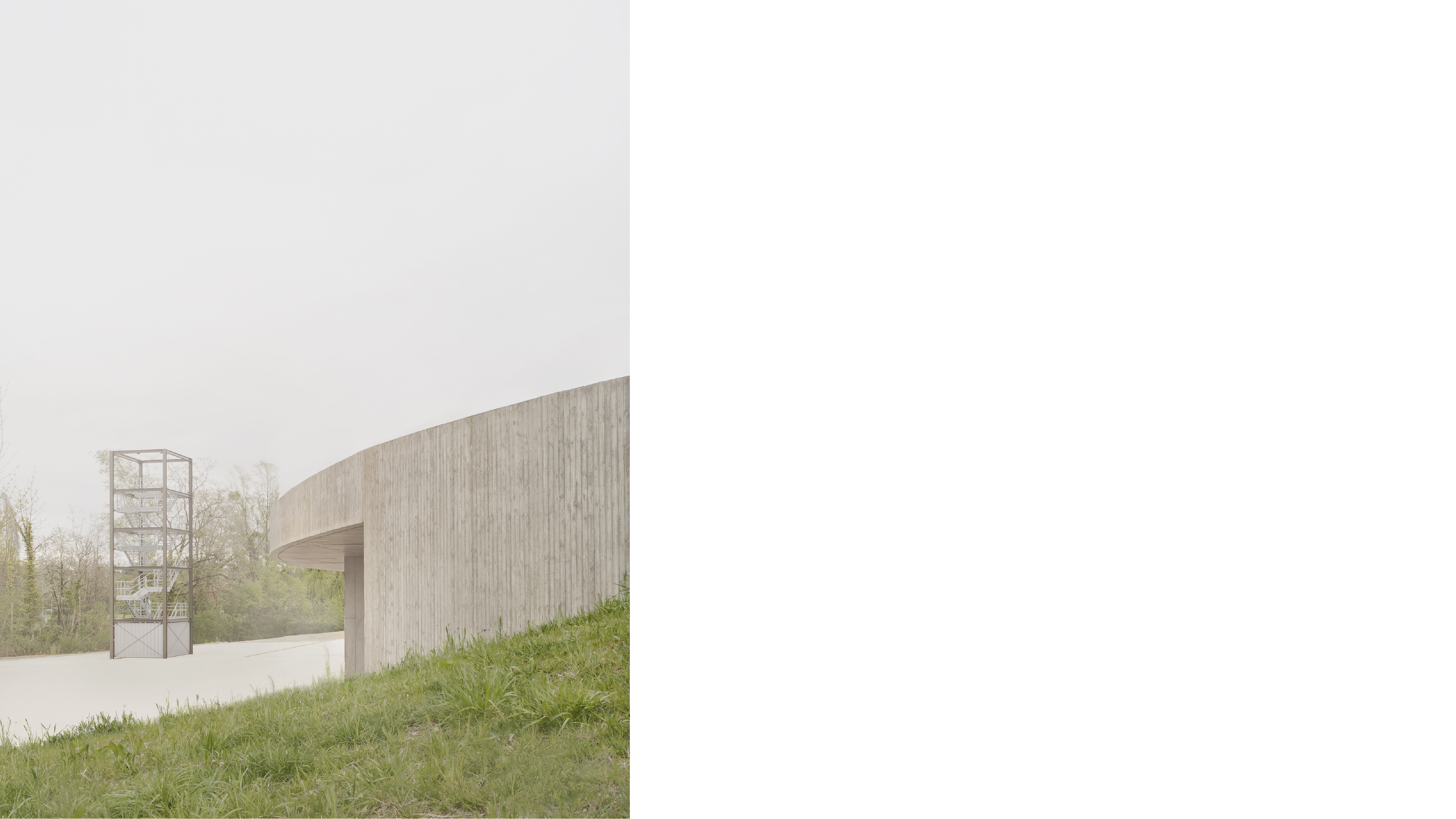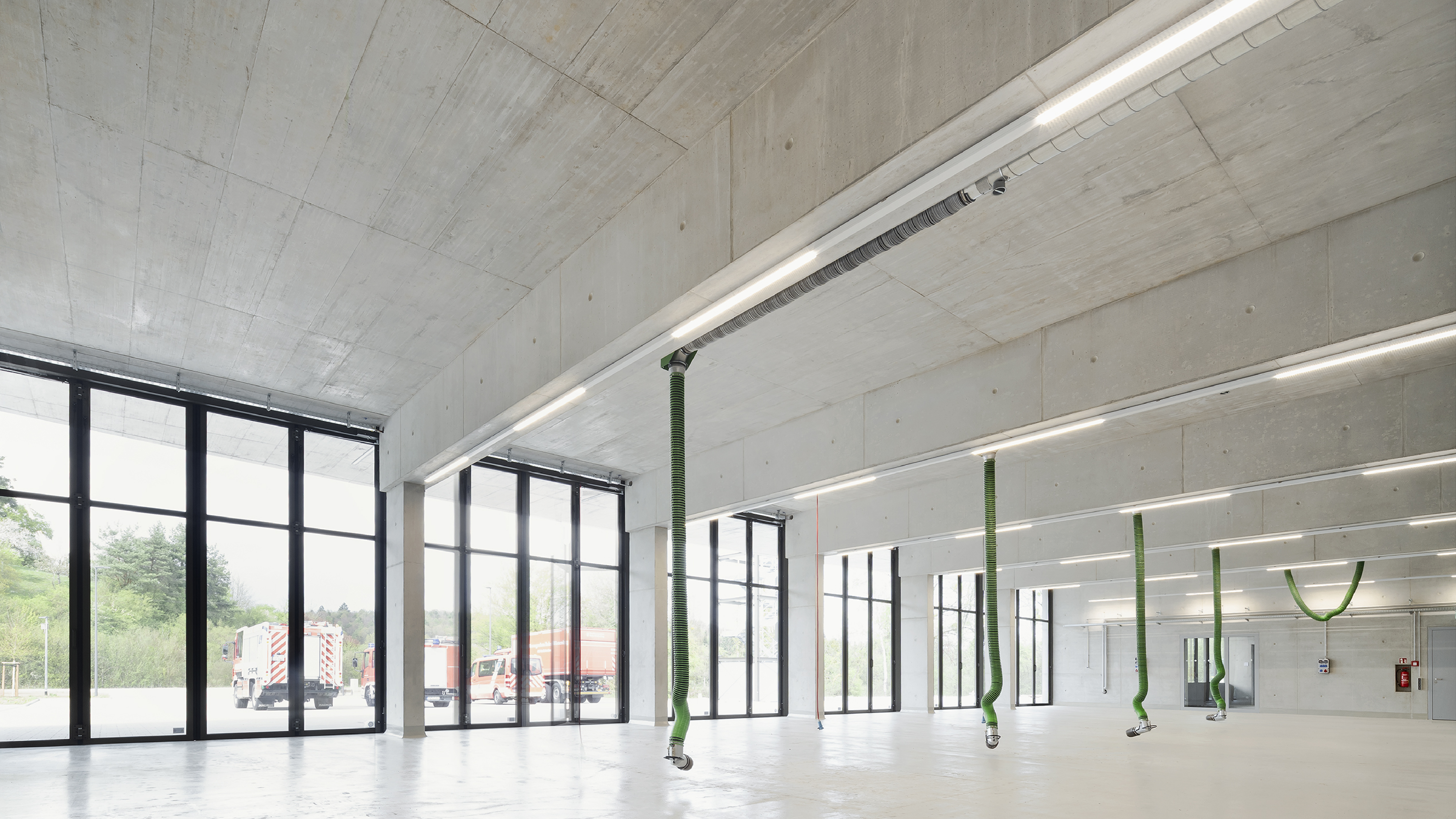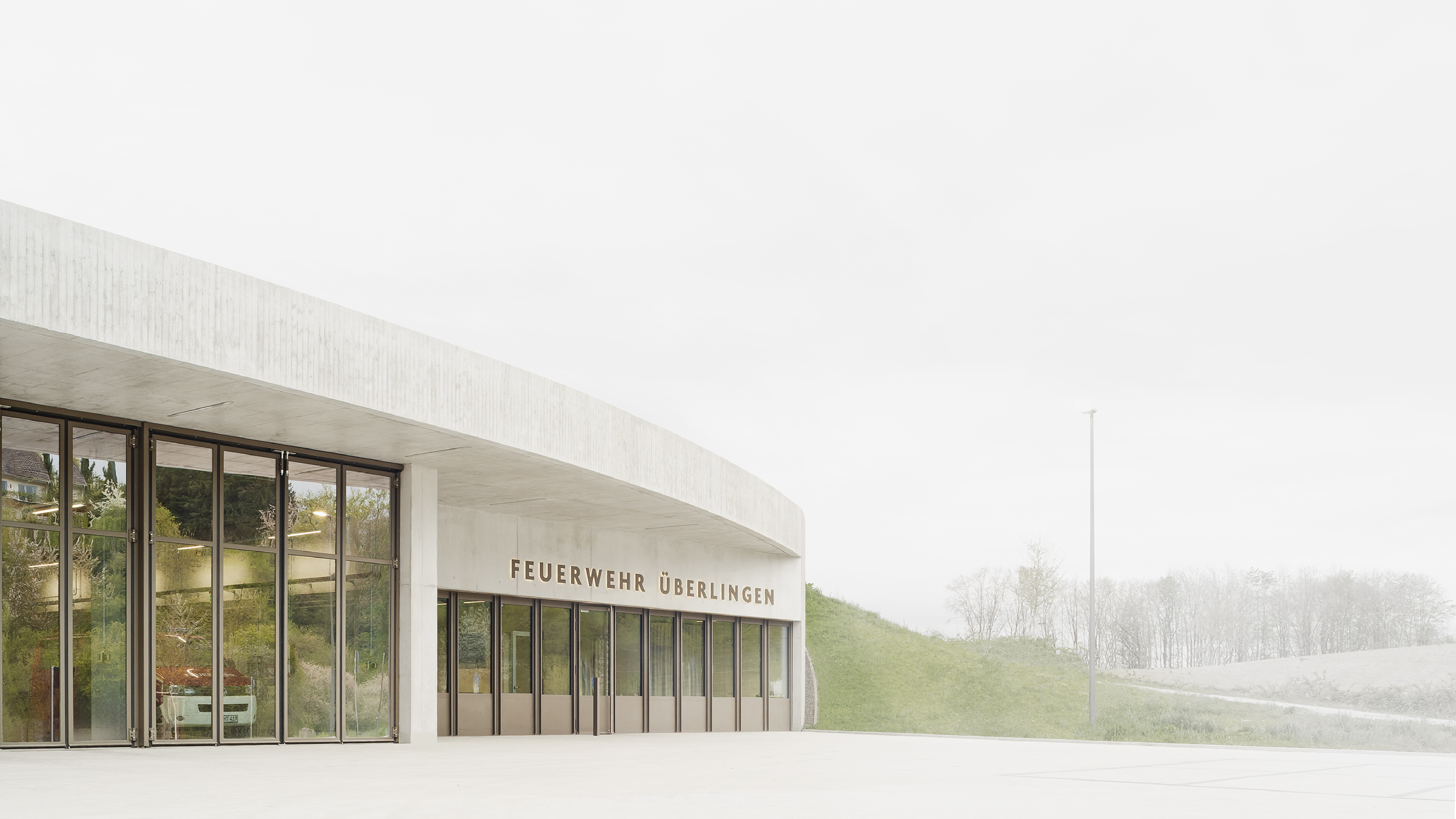 Das neue Feuerwehrgebäude erhält seinen einzigartigen Charakter durch einen sensiblen Umgang mit dem vorgefundenen Ort und die Reaktion auf die vermeintlich schwierigen Randbedingungen. Die entwickelte Gebäudetypologie formte sich als logische Folgerung aus den zahlreichen funktionalen Anforderungen einer Feuerwehr und den hohen Außenflächenbedürfnissen. Als eingeschossiger Baukörper gräbt sich das Feuerwehrgebäude in den Hang ein und geht an seinen äußeren Flanken sanft in diesen über.