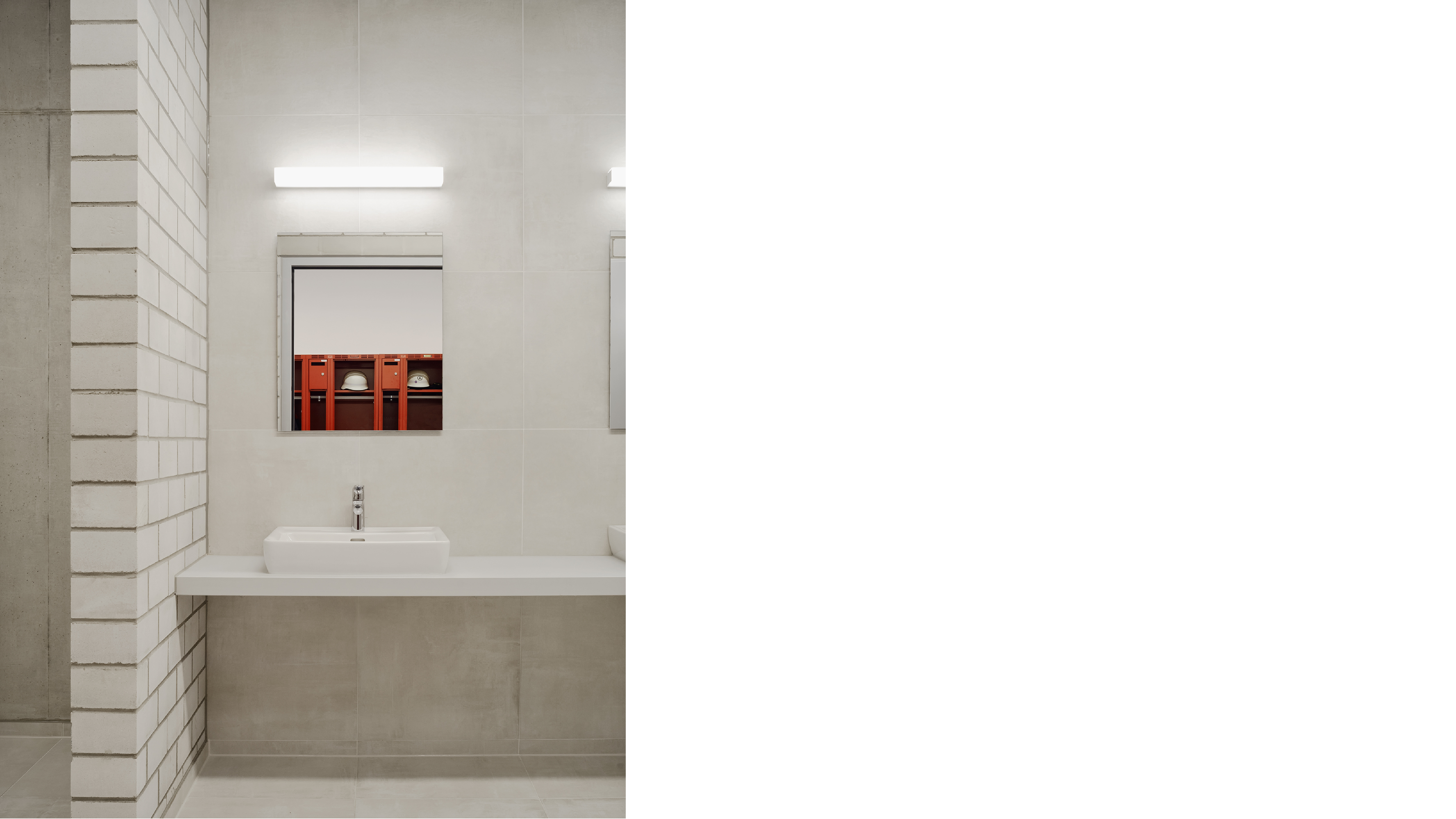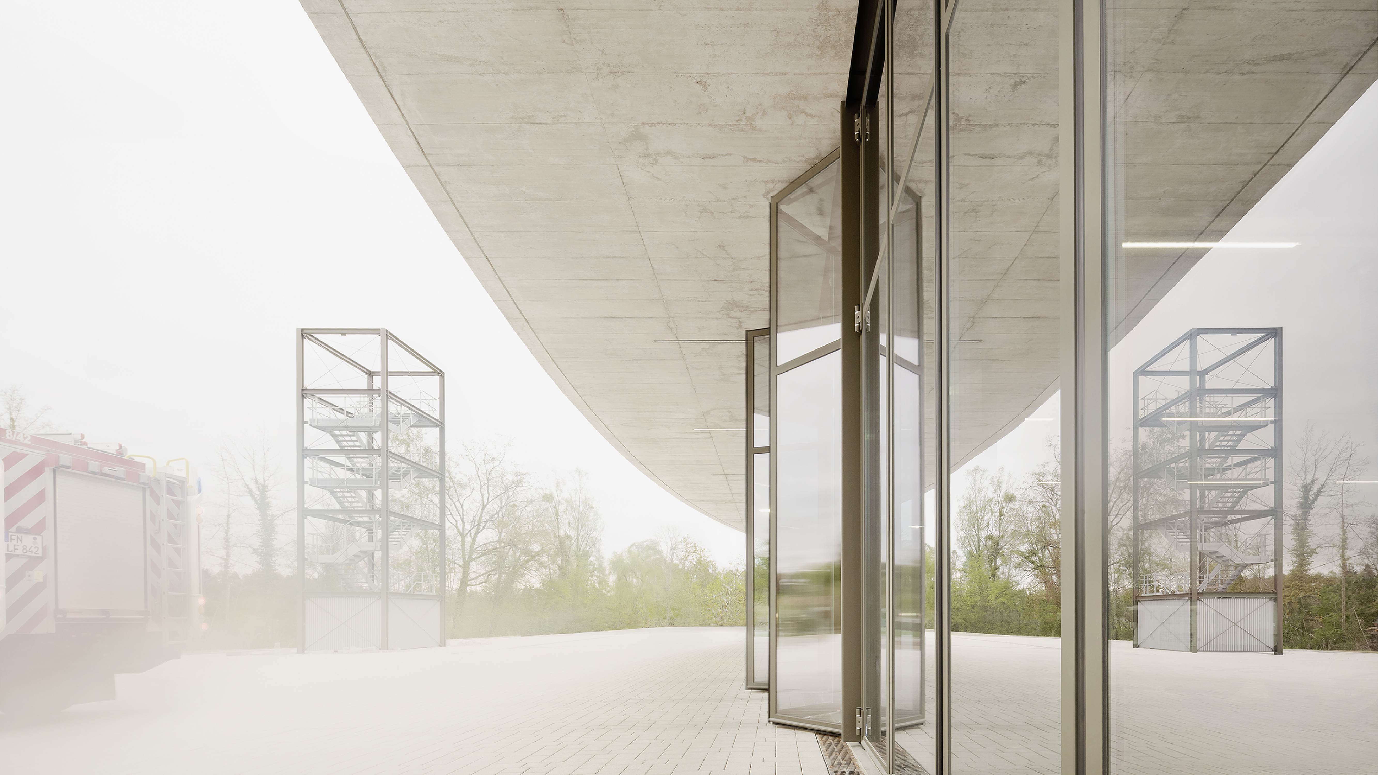 Der großzügige vorgelagerte Feuerwehrhof erfüllt durch eine klare Zonierung die Funktionen für das störungsfreie An- und Ausrücken sowie für die regelmäßig angesetzten Übungen. Auf der östlichen Hofseite bildet der Übungsturm als optische Adresse den Hochpunkt der neuen Bebauung und ist mit Blickbeziehung zum Schulungsbereich positioniert. Ist das Gebäude in erster Linie für die reibungslose und schnelle Einsatzarbeit konzipiert, so steht den Feuerwehrleuten mit dem Schulungsbereich und der vorgelagerten östlichen Hoffläche zum Weiher und Grünraum hin zusätzlich ein Ort für ihre Kammeradschaftspflege zur Verfügung.