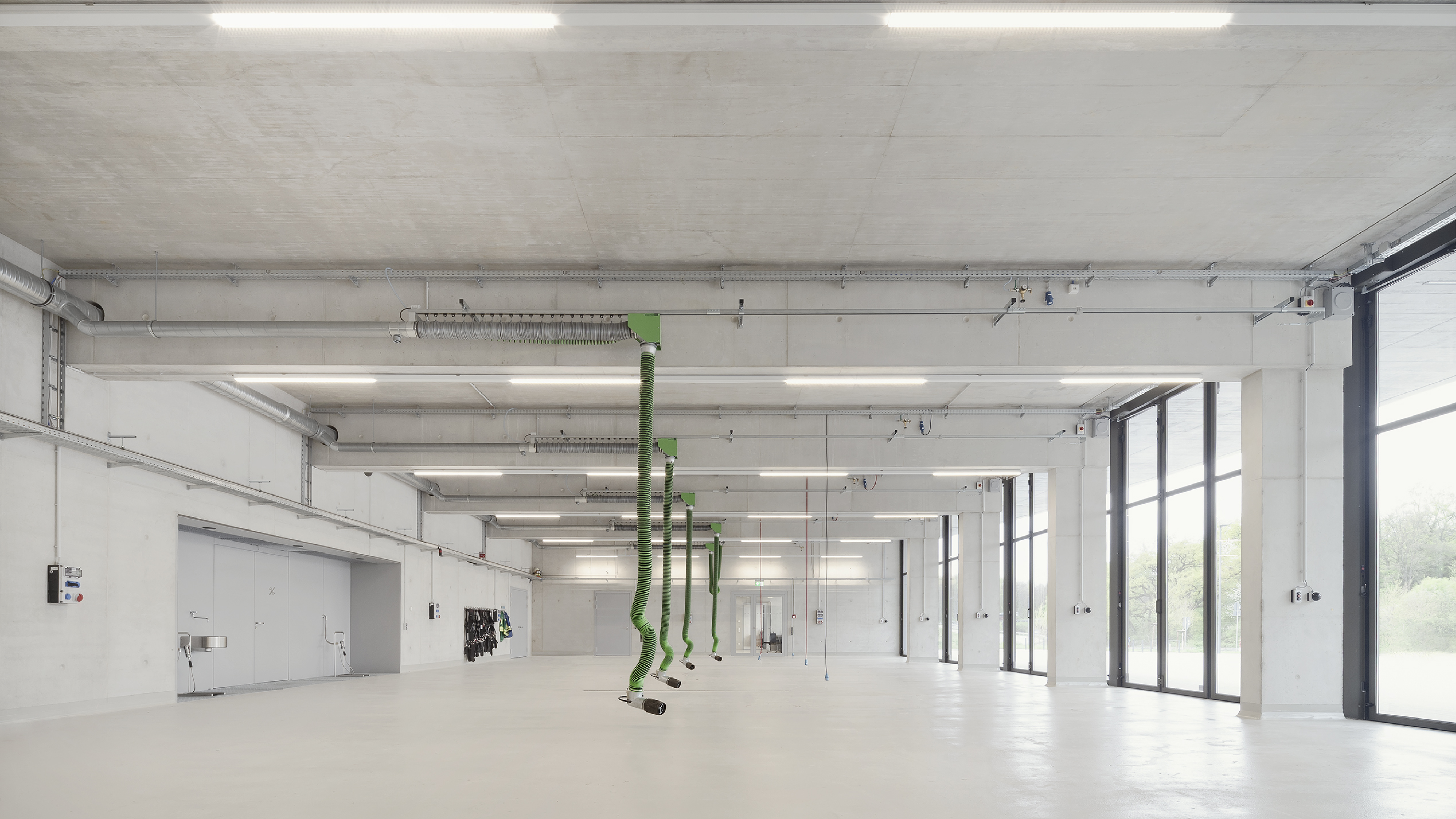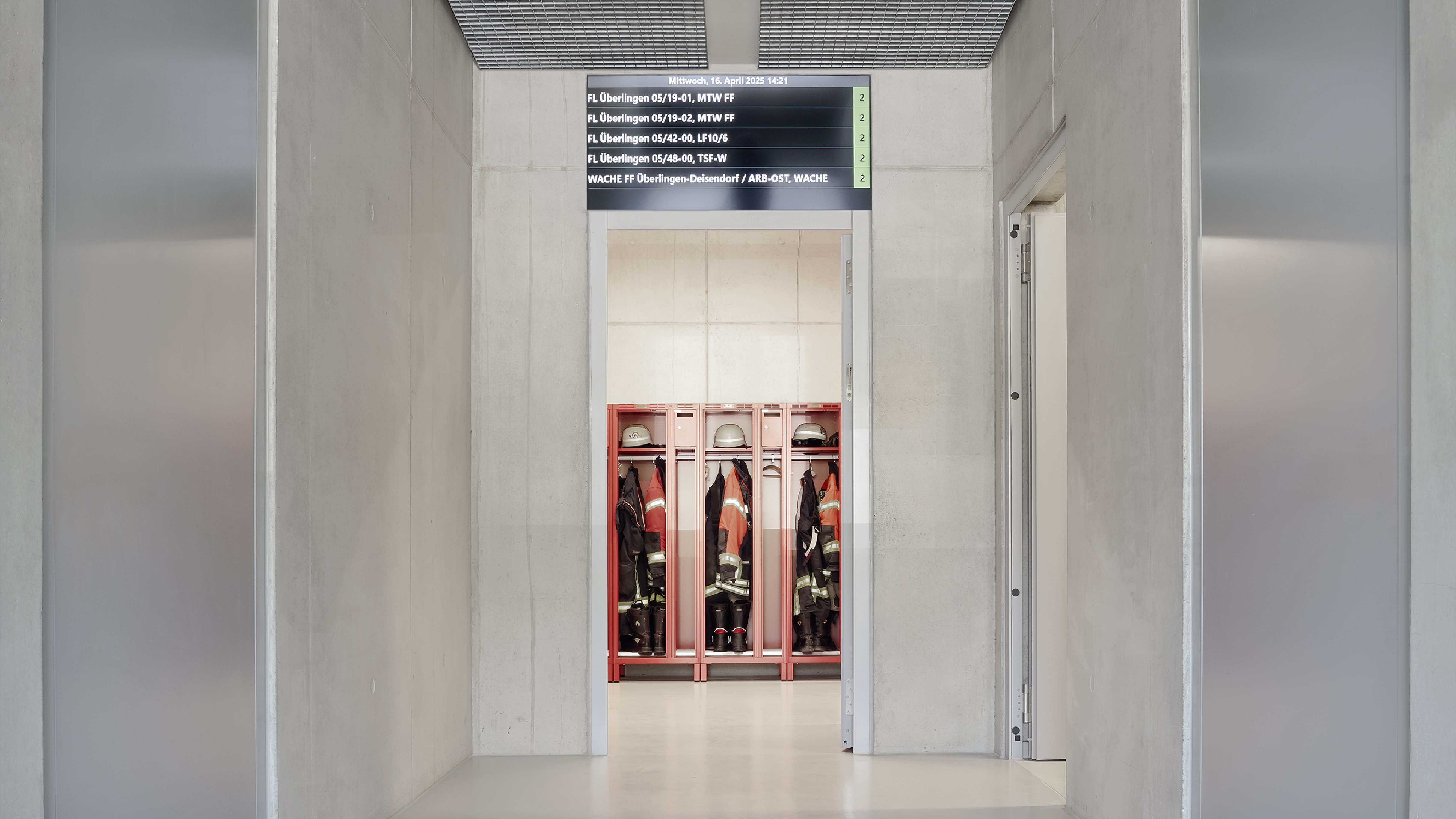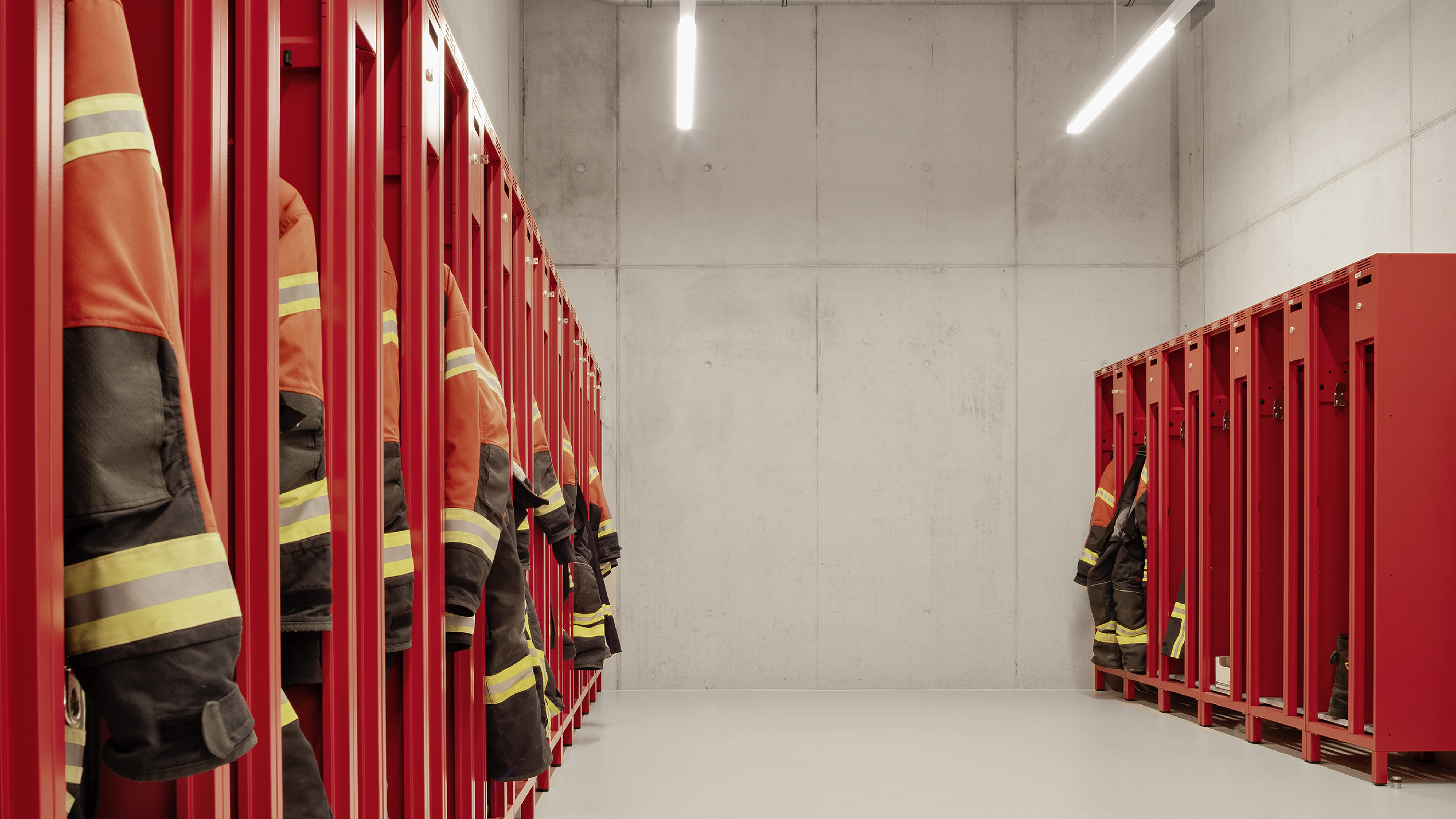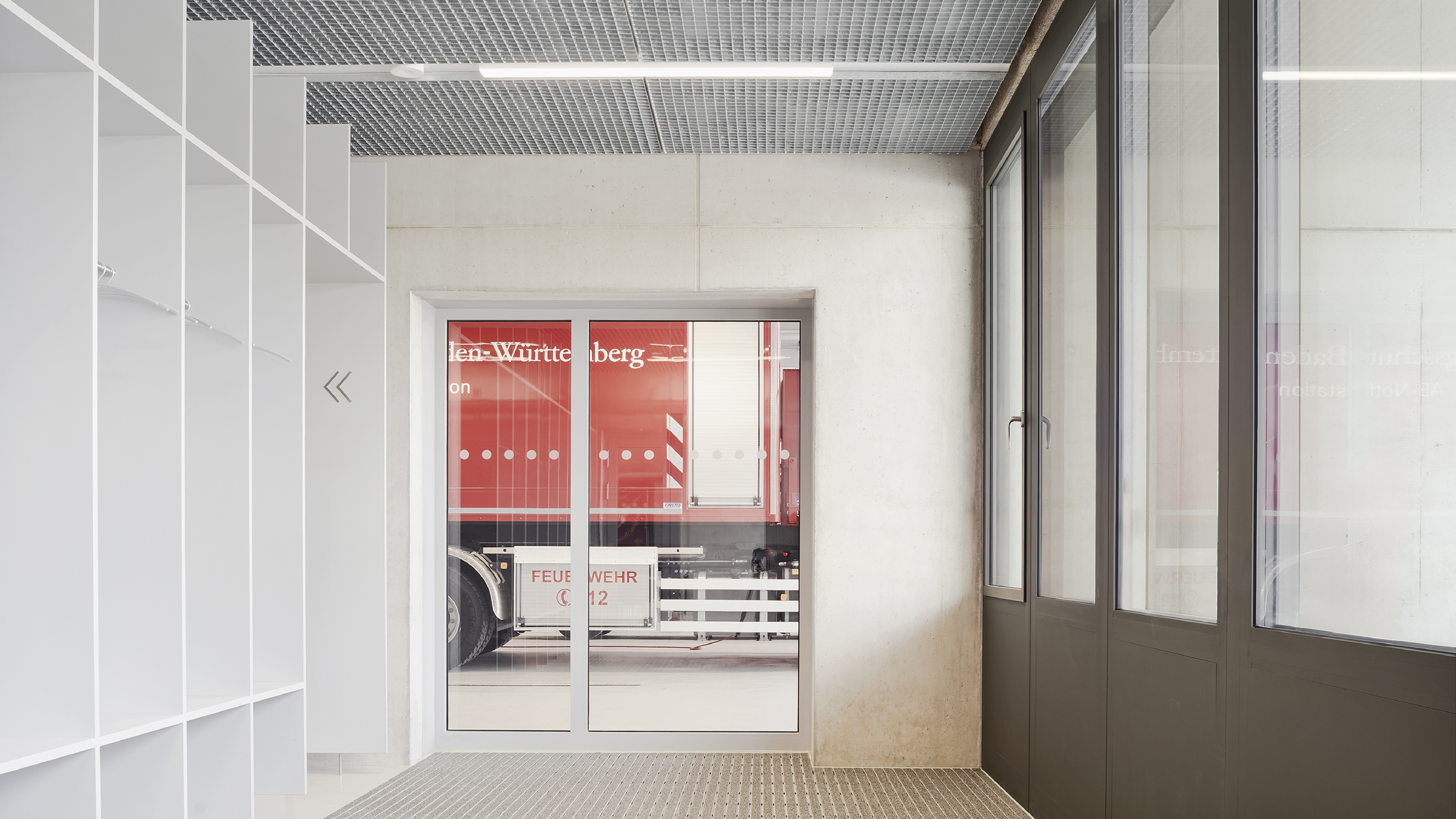 Die dynamischen Abläufe der Feuerwehr spiegeln sich in einer klaren Funktionstrennung und einer optimierten Grundrissstruktur ohne störende Kreuzungspunkte wider. Die Fahrzeughalle mit ihren sechs Stellplätzen positioniert sich zentral als Kernstück mit direkten Verbindungen in die weiteren Funktionsbereiche. Jeweils seitlich gliedern sich leicht zurückversetzt im Osten das Foyer mit dem Schulungsbereich und im Westen die Büroräume mit der Einsatzzentrale an. Über die gesamte Gebäudelänge nimmt die Nebenraumspange mit den Umkleiden, Sanitär- und Technikräumen im rückwärtigen hangseitigen Bereich ihren Platz ein.