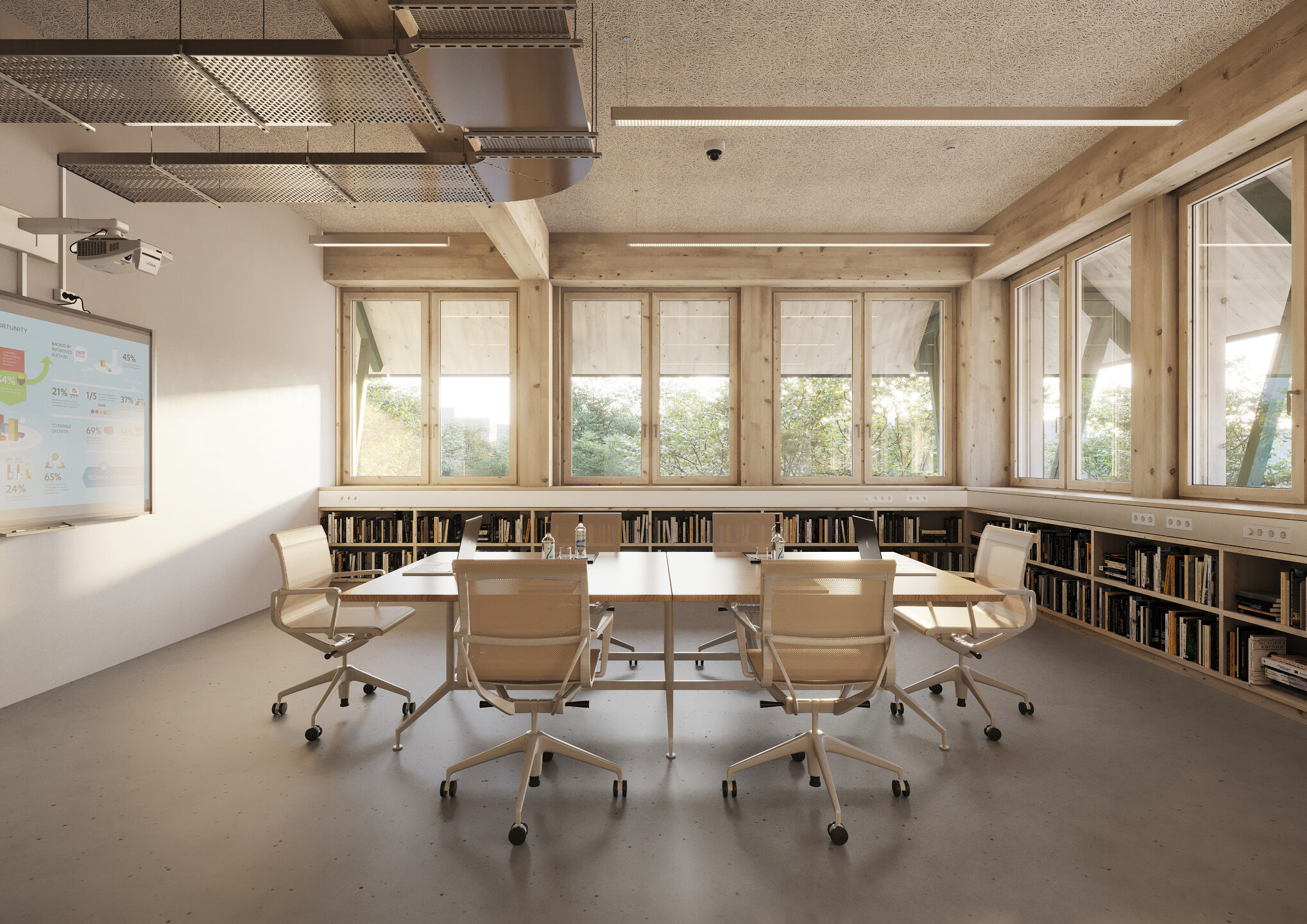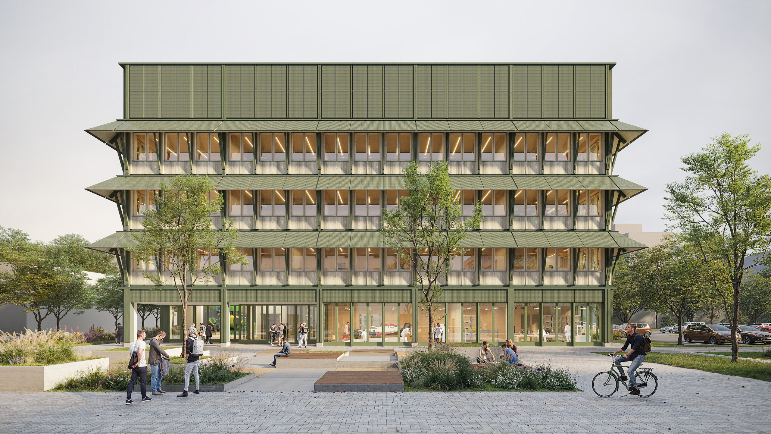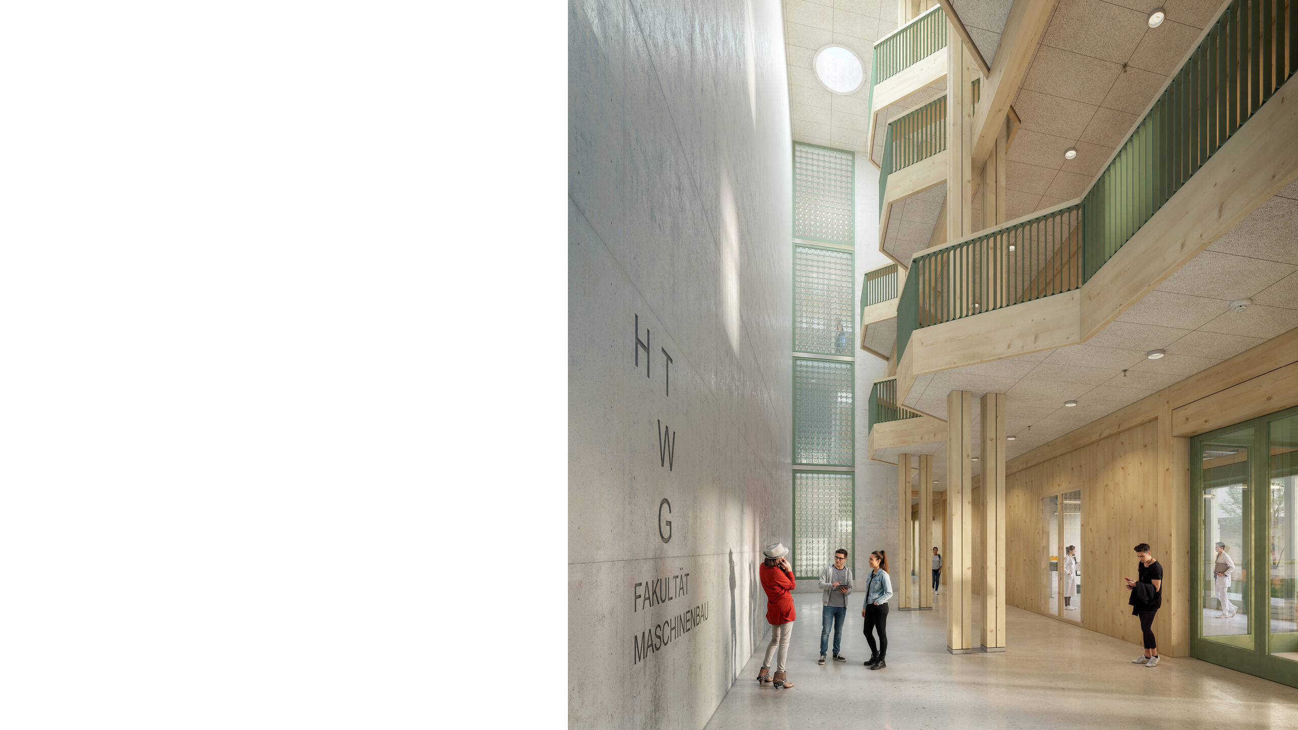Die Hochschule für Technik, Wirtschaft und Gestaltung Konstanz erweitert ihren am Rhein liegenden Campus um einen Holzbaustein. Unweit der Mündung in den Bodensee entsteht ein neues Institutsgebäude. Der Neubau beherbergt hauptsächlich Labore und Werkstätten für die Studienfächer Maschinenbau, Elektrotechnik und Informationstechnik. Neben den Lehrräumen ist außerdem die Campusversorgung sowie das Rechenzentrum der HTWG im Gebäude untergebracht. Während die technischen Räume im innenliegenden Stahlbetonkern untergebracht werden, sind die Lehrräume in den hellen Räumen an der Fassade untergebracht. Diese werden als Holzbau konstruiert. Die Organisation des Grundrisses folgt dem Ziel der Flexibilität, Übersichtlichkeit und Funktionalität und ermöglicht somit beste Vorraussetzungen für die forschenden und lehrenden Workflows.
