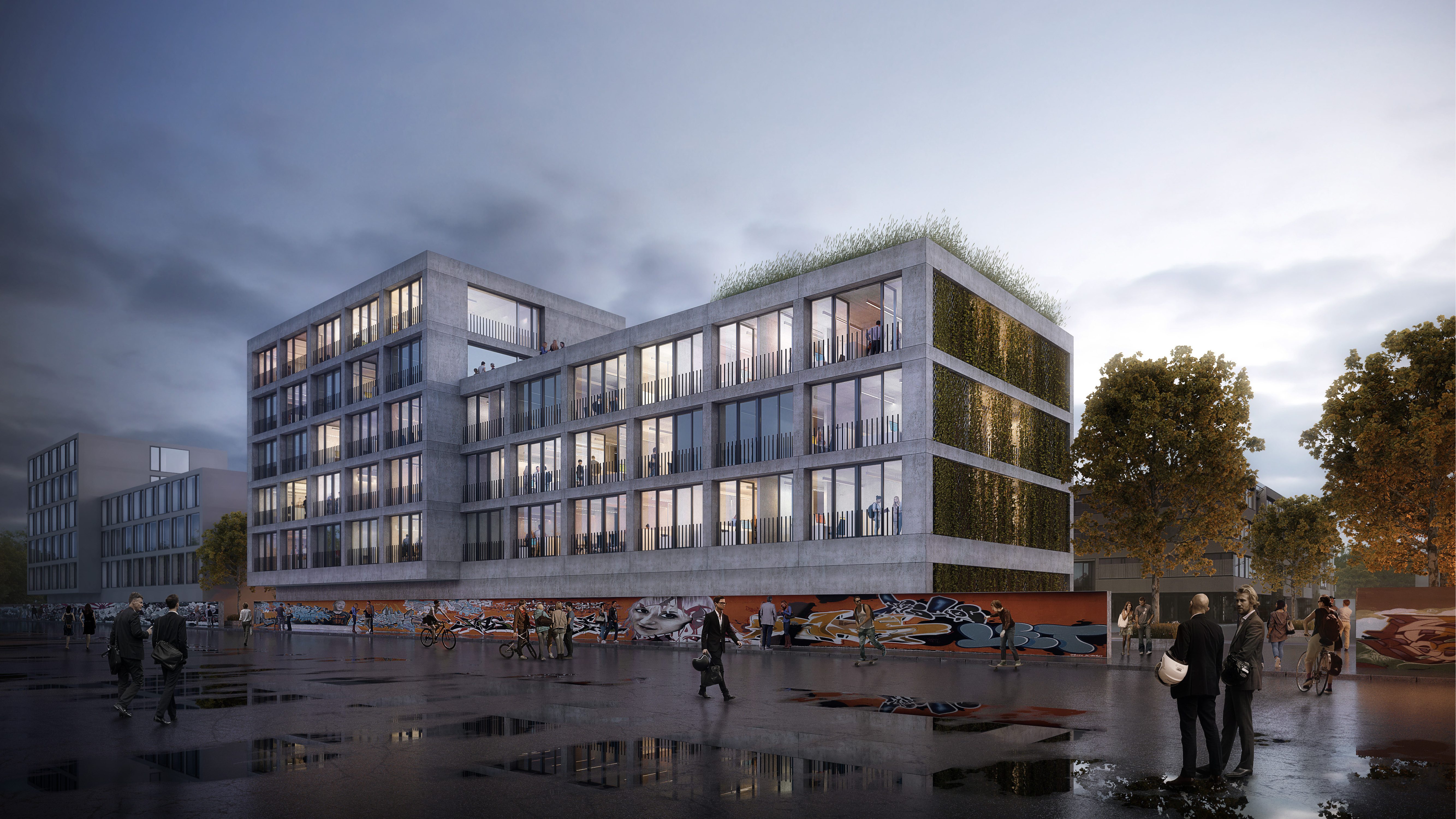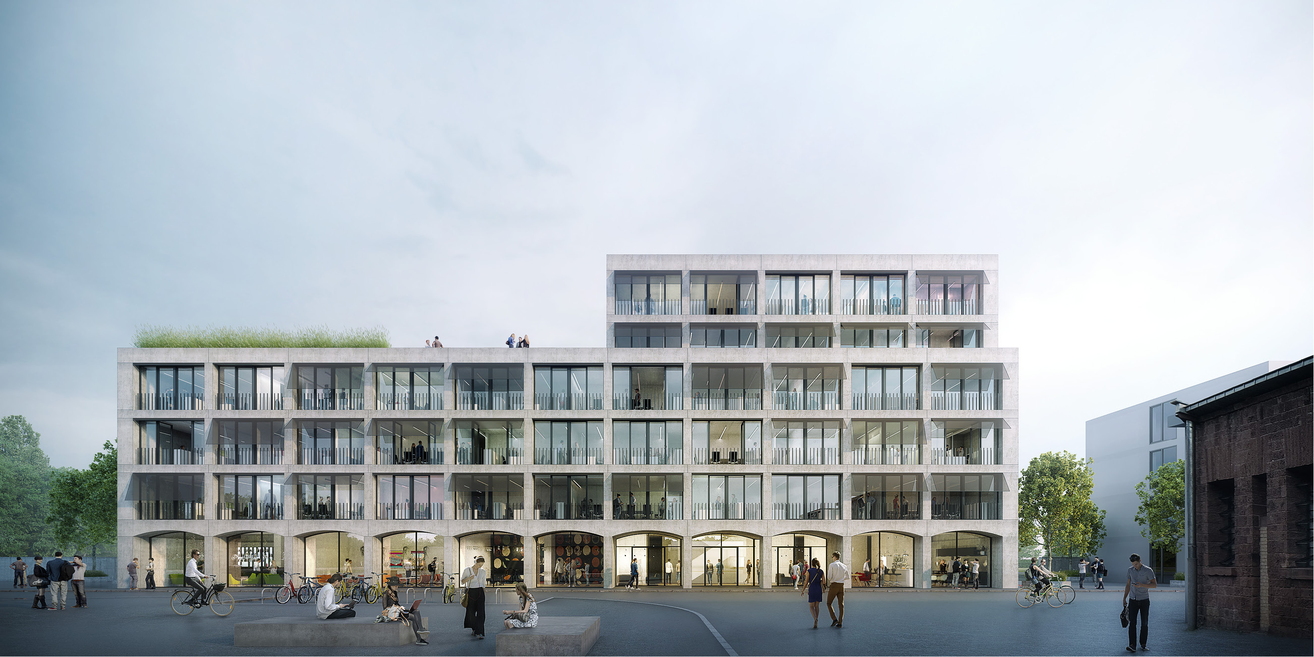 Die industrielle, loftartige Betonfassade und die besonderen Qualitäten der Architektur liegen im detailgenauen Umgang mit dem Bauvolumen.