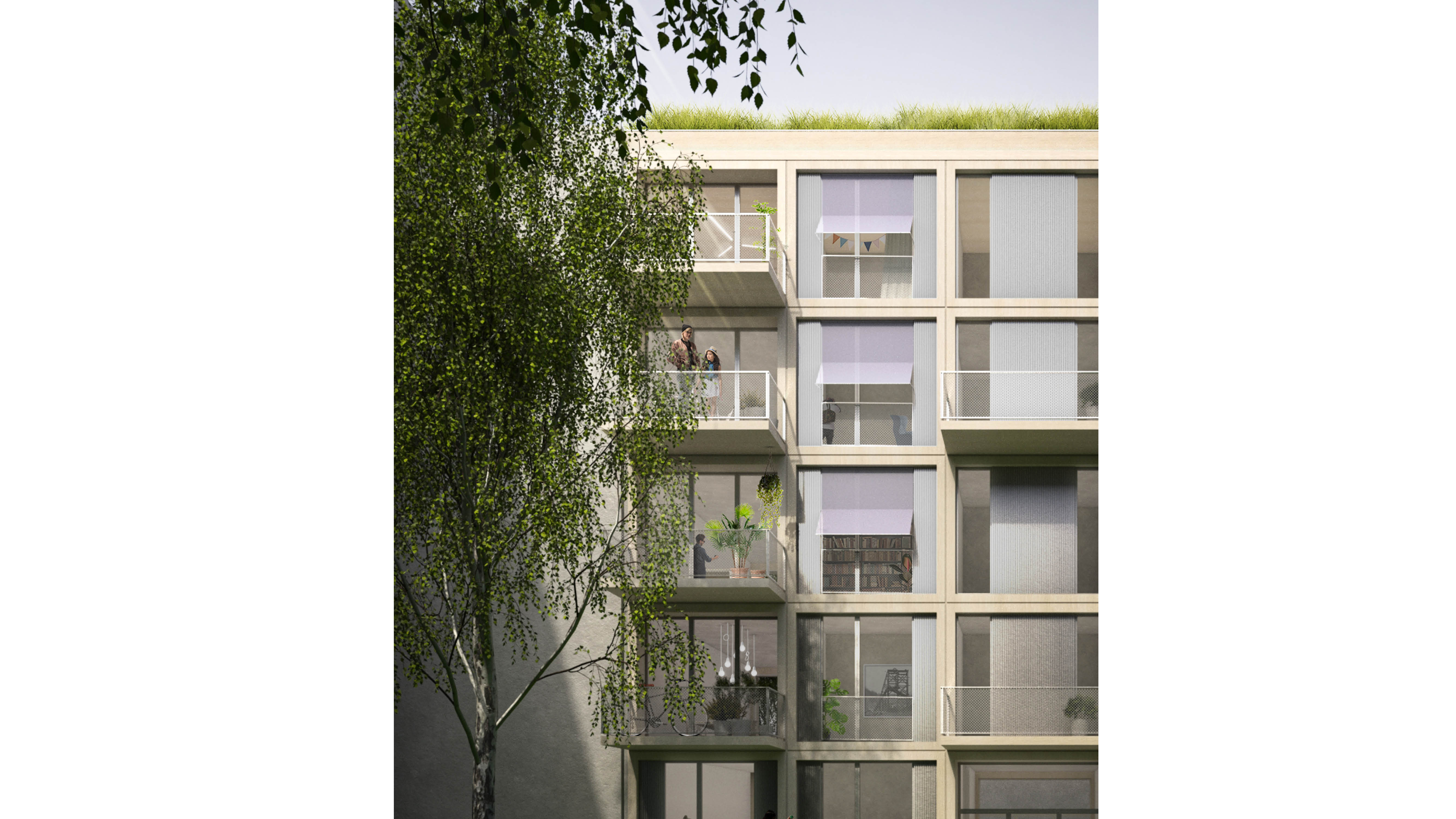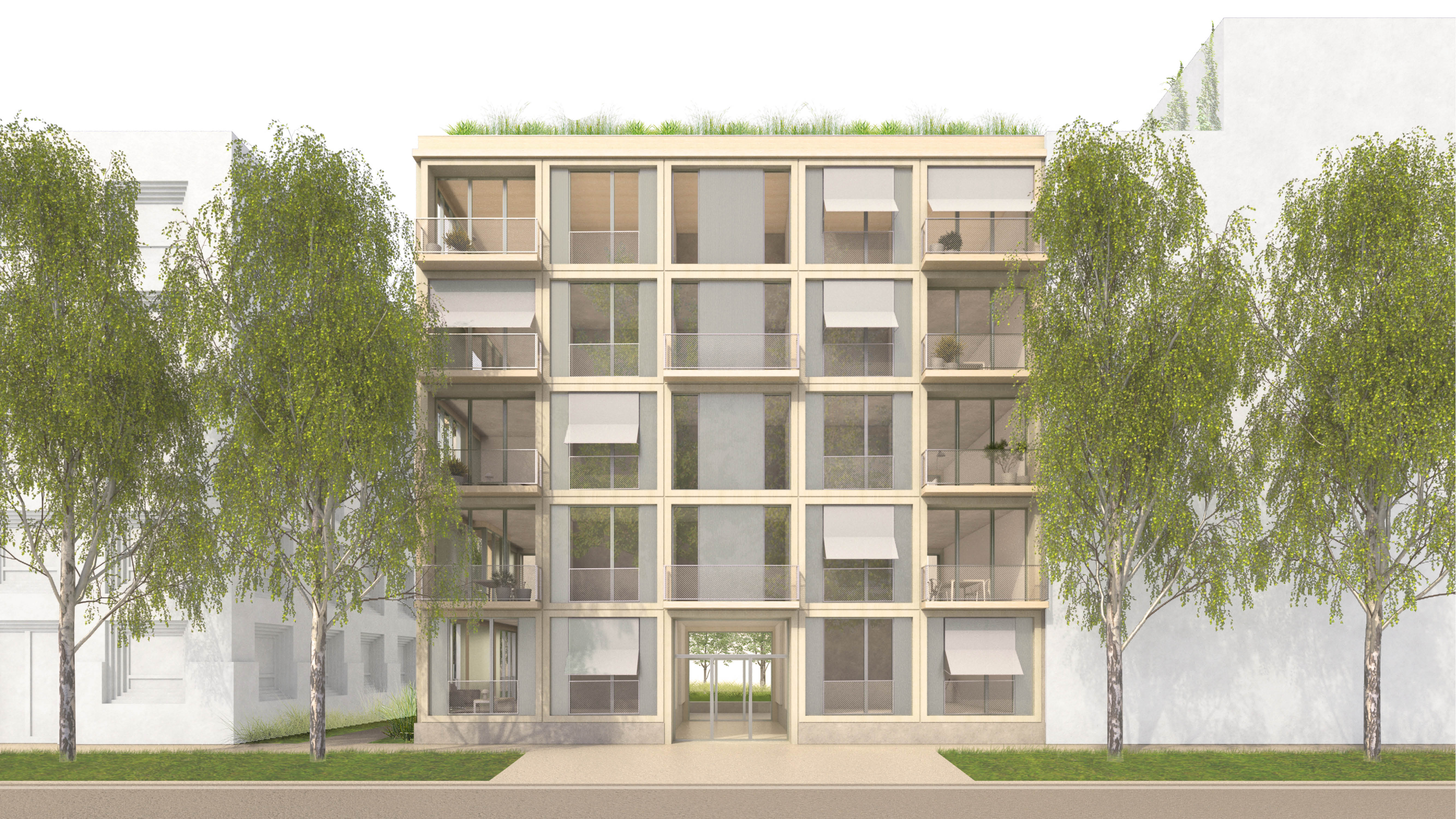 Die Lage des Gebäudes in der ruhigen Seitenstraße ermöglicht Wohnen bis ins Erdgeschoss. Die von der Stirnseite umgreifenden Wohnungen bieten hierbei eine zusätzliche Belichtungsmöglichkeit. Ein stringentes Raster zieht sich dabei um alle drei Fassadenseiten und gliedert dabei den Baukörper in Höhe, Breite und Tiefe. Durch eine modulartige Grundrissorgansiation konnen unterschiedliche Wohnformen geschaffen werden. Balkone zur Hof- und Straßenseite entwickeln sich aus dem modularen Rahmen heraus und geben insbesondere dem homogenen Straßenquerschnitt eine Plastizität und Tiefe in seiner Raumwahrnehmung.