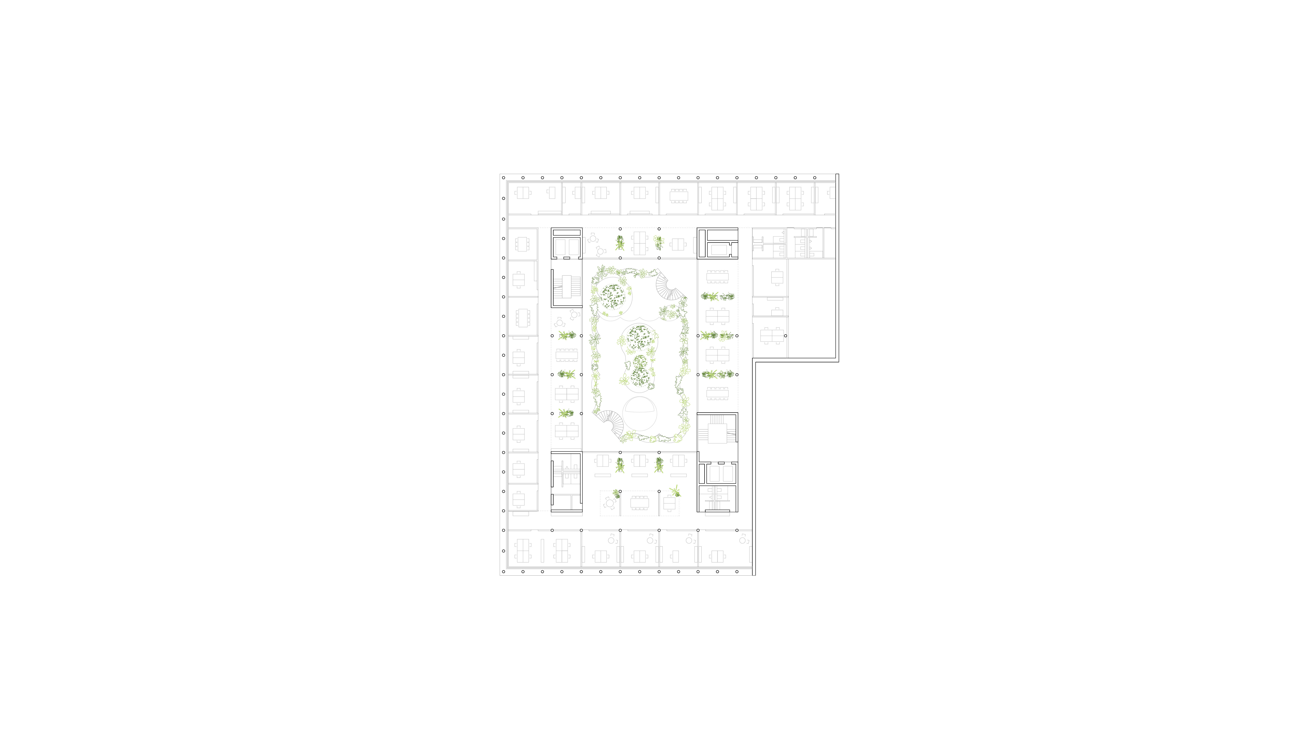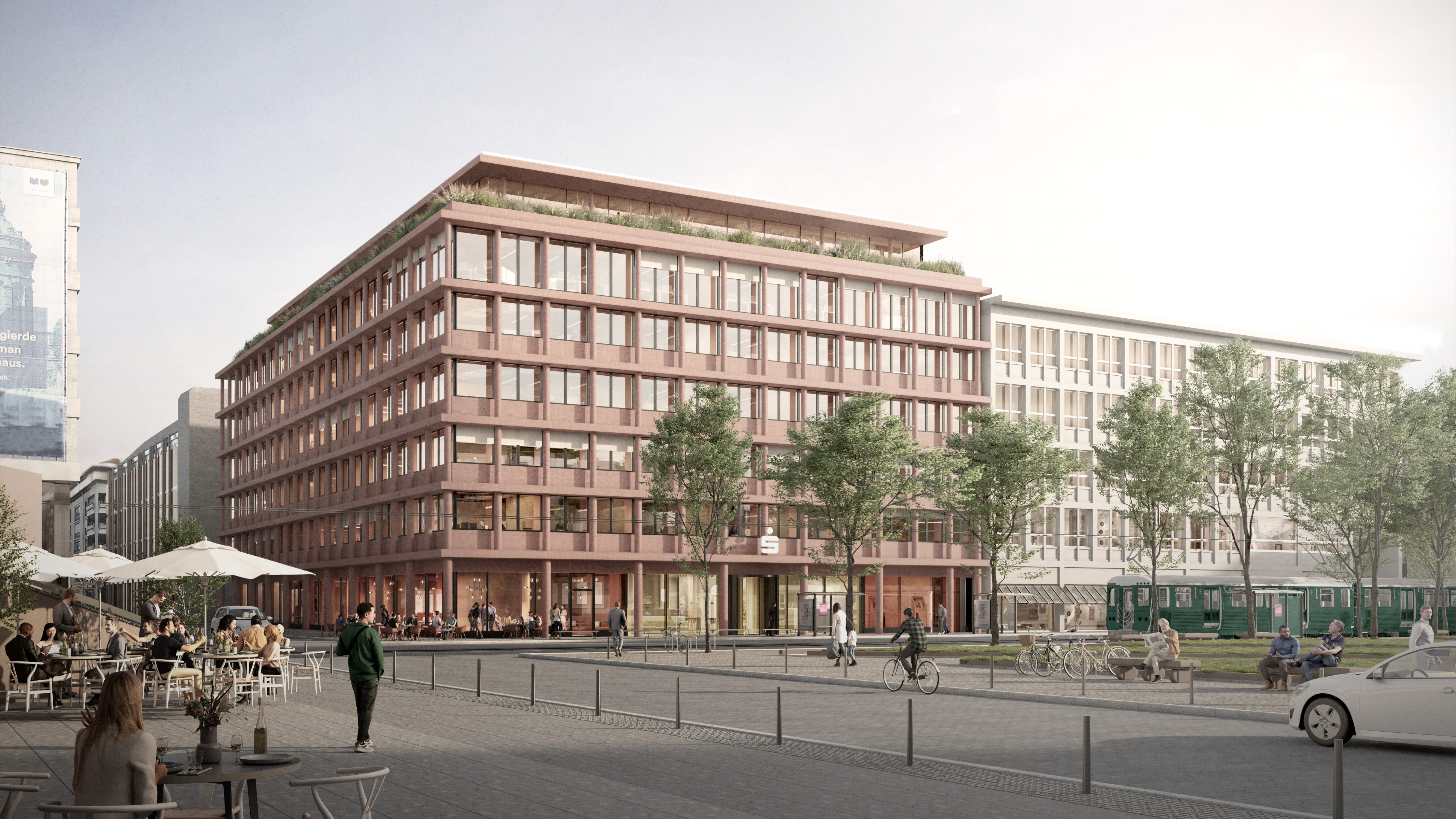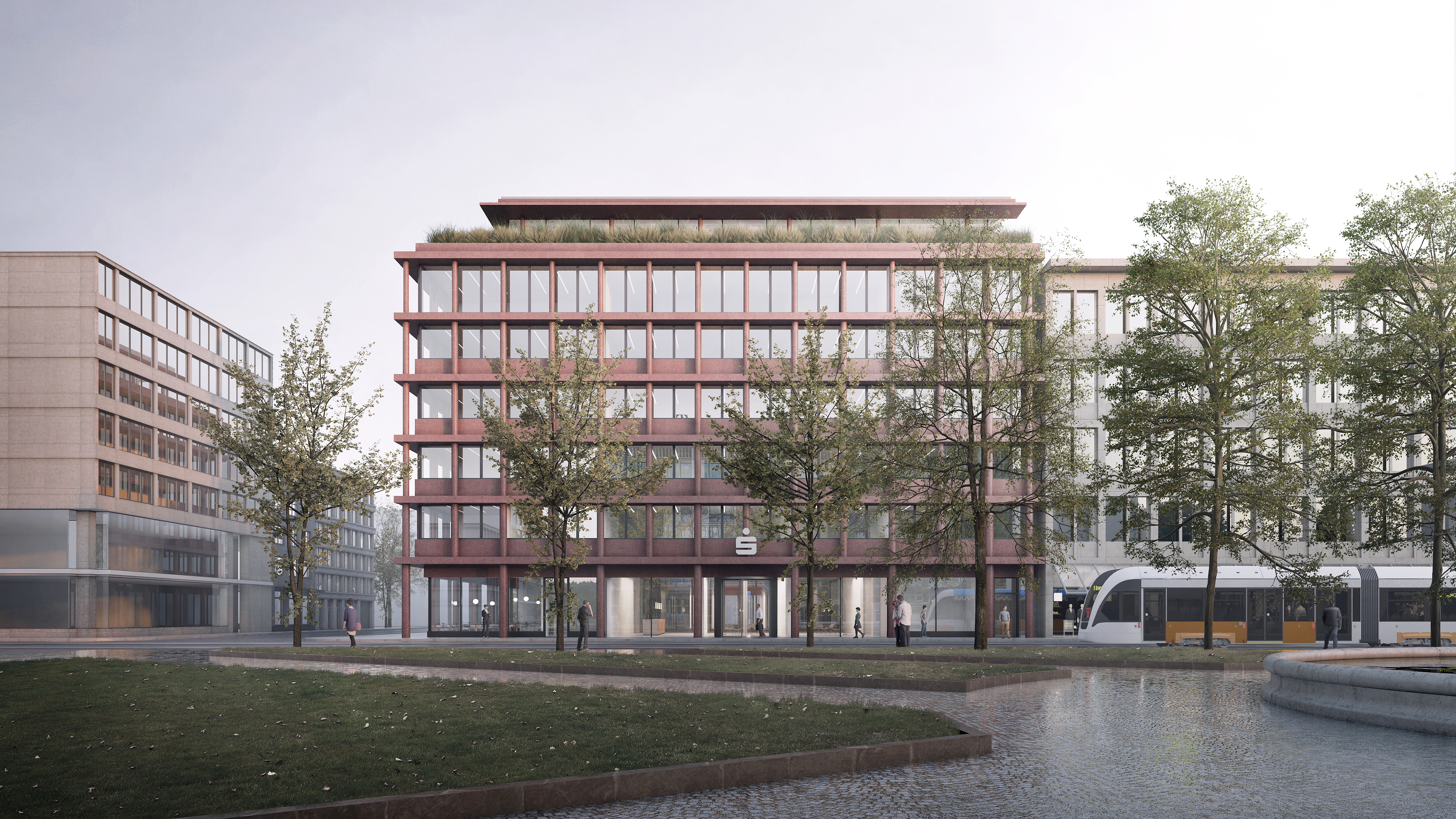 Die neue Sparkasse des Kreises Rhein-Neckar Nord liegt inmitten der Mannheimer Innenstadt am prominenten Paradeplatz. Um seiner Verortung gerecht zu werden, öffnet sich die das überhöhte Erdgeschoss zur Straße hin. Dadurch eröffnet sich bereits beim vorbeischlendern ein außergewöhnlicher Blick in das grüne Innere des Bürogebäudes. Das Prinzip der harten Schale und des weichen Kerns zeichnet sich in zwei prägnanten, grünen Höfen ab. Während das Gebäude zur Stadt hin in der roten Farbe des typischen Mannheimer-Steins erstellt wird, überrascht der Innenhof durch eine leichte, grünbewachsene Fassade mit weisen, geschwungenen Balkonen. Durch die verglasten Büros mit Austritten in die Höfe wird die faszinierende Illusion einer Oase mitten in der Stadt geweckt.