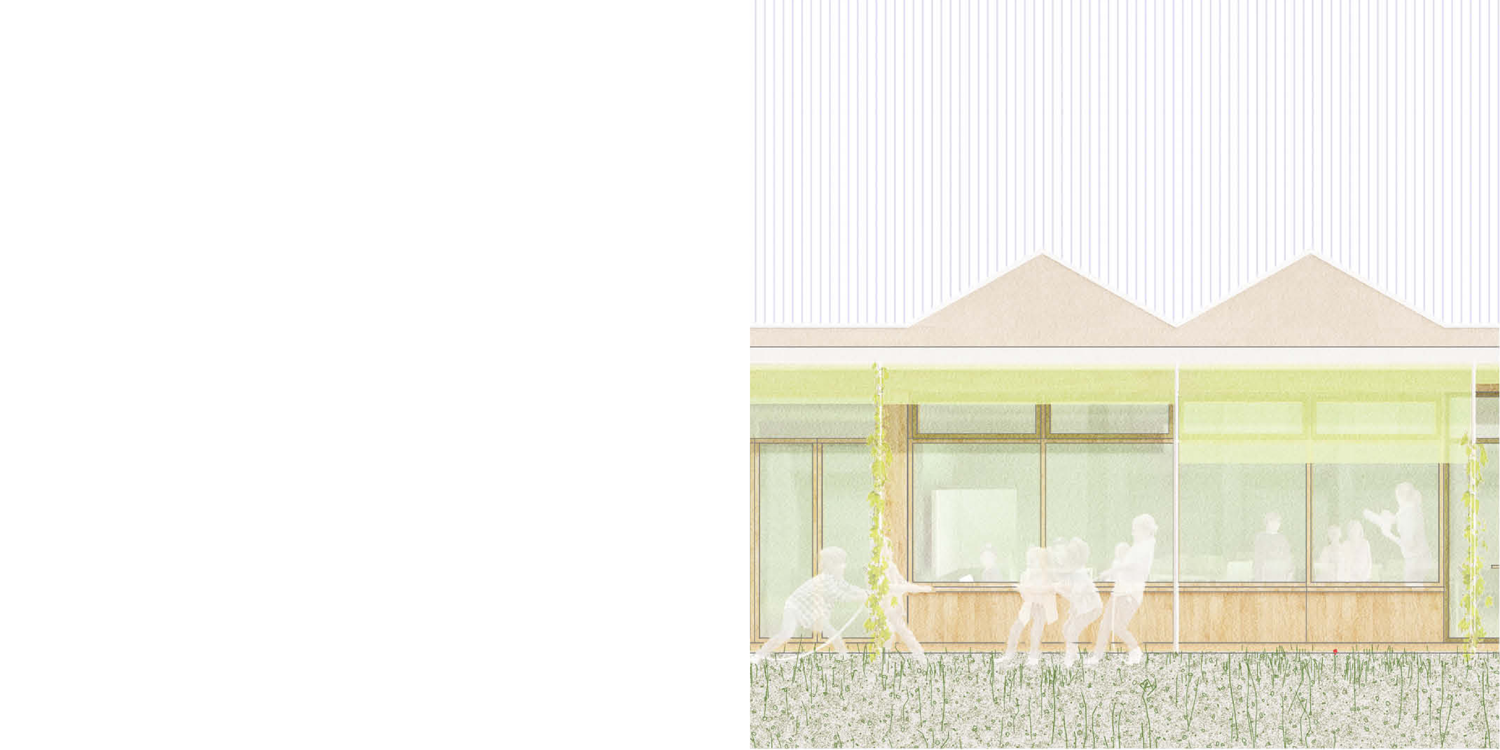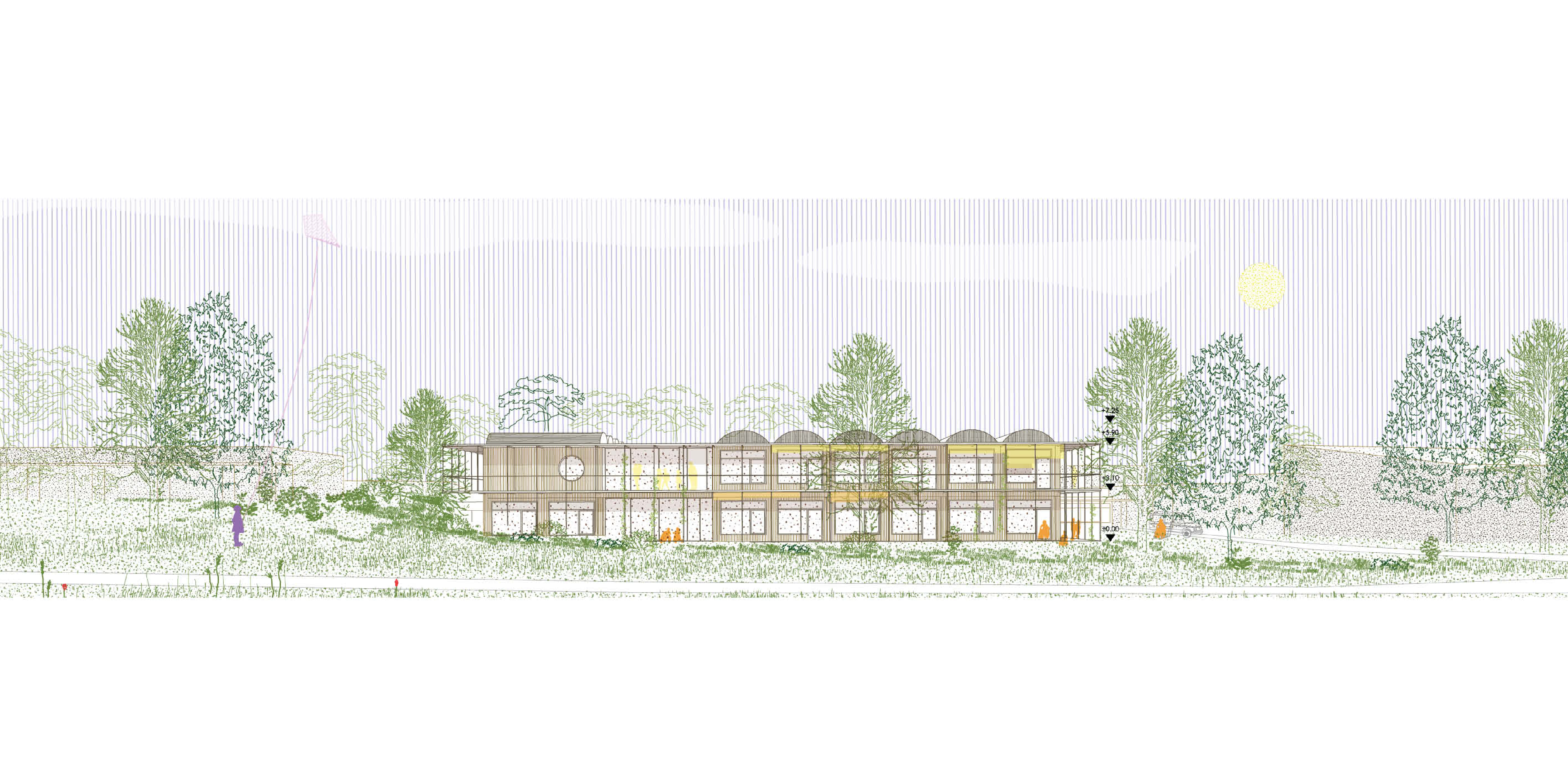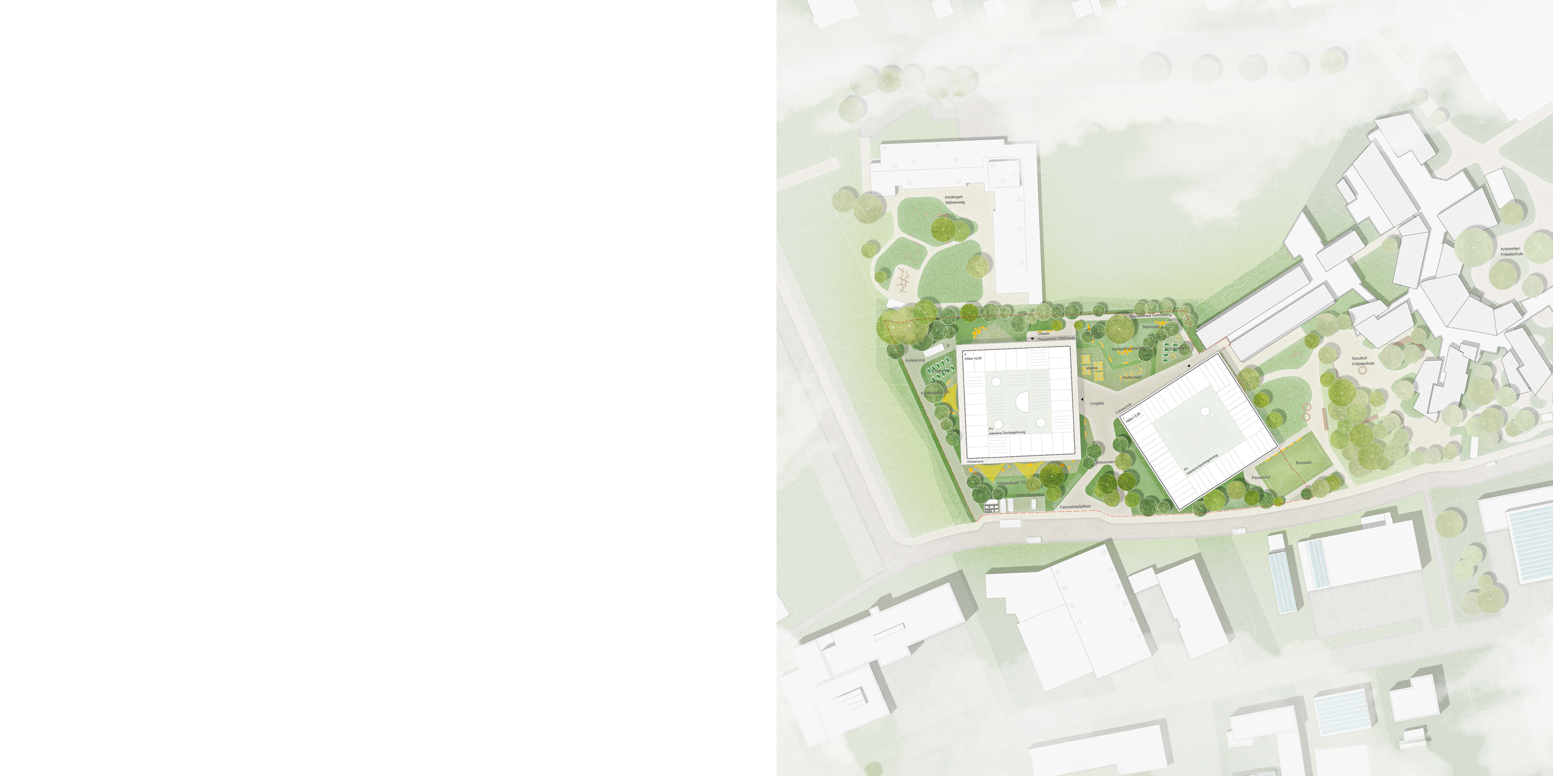 The outdoor space is characterised by a low level of surface sealing, which has a positive impact on the microclimate. The schoolyard and the open spaces of the children's centre form the central element.