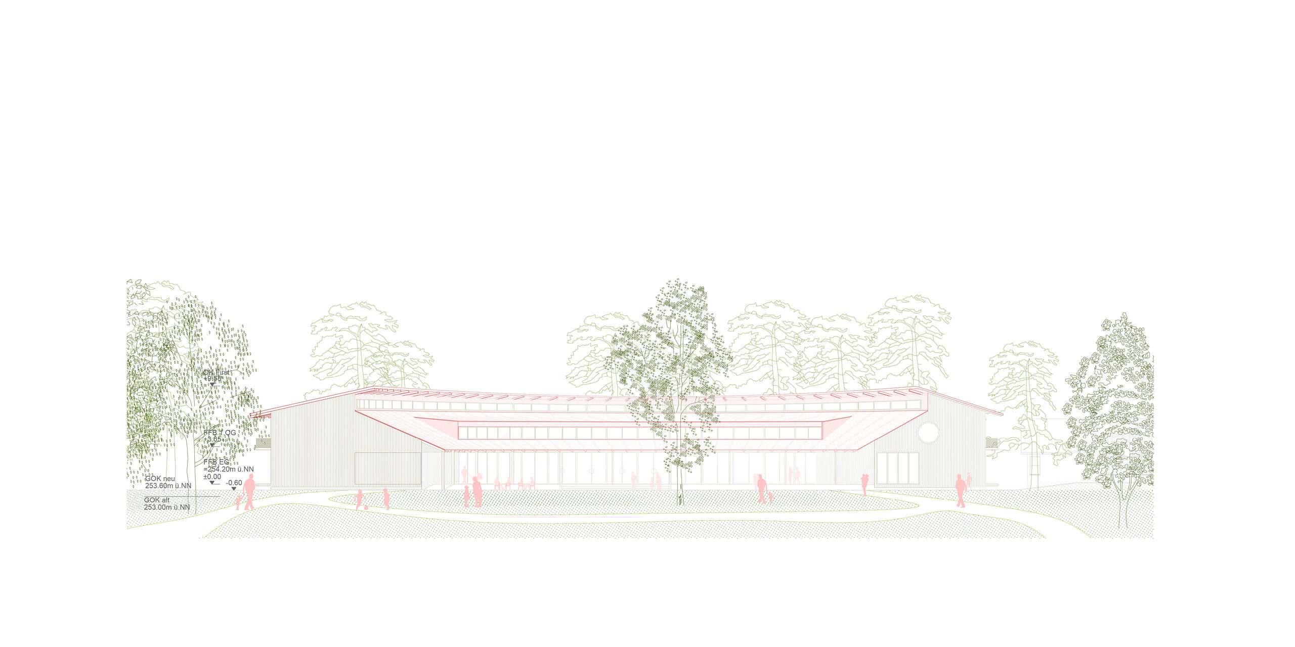 The new building honours the existing linden tree as a valuable existing tree, places it in the centre as a striking tree and encloses it protectively.