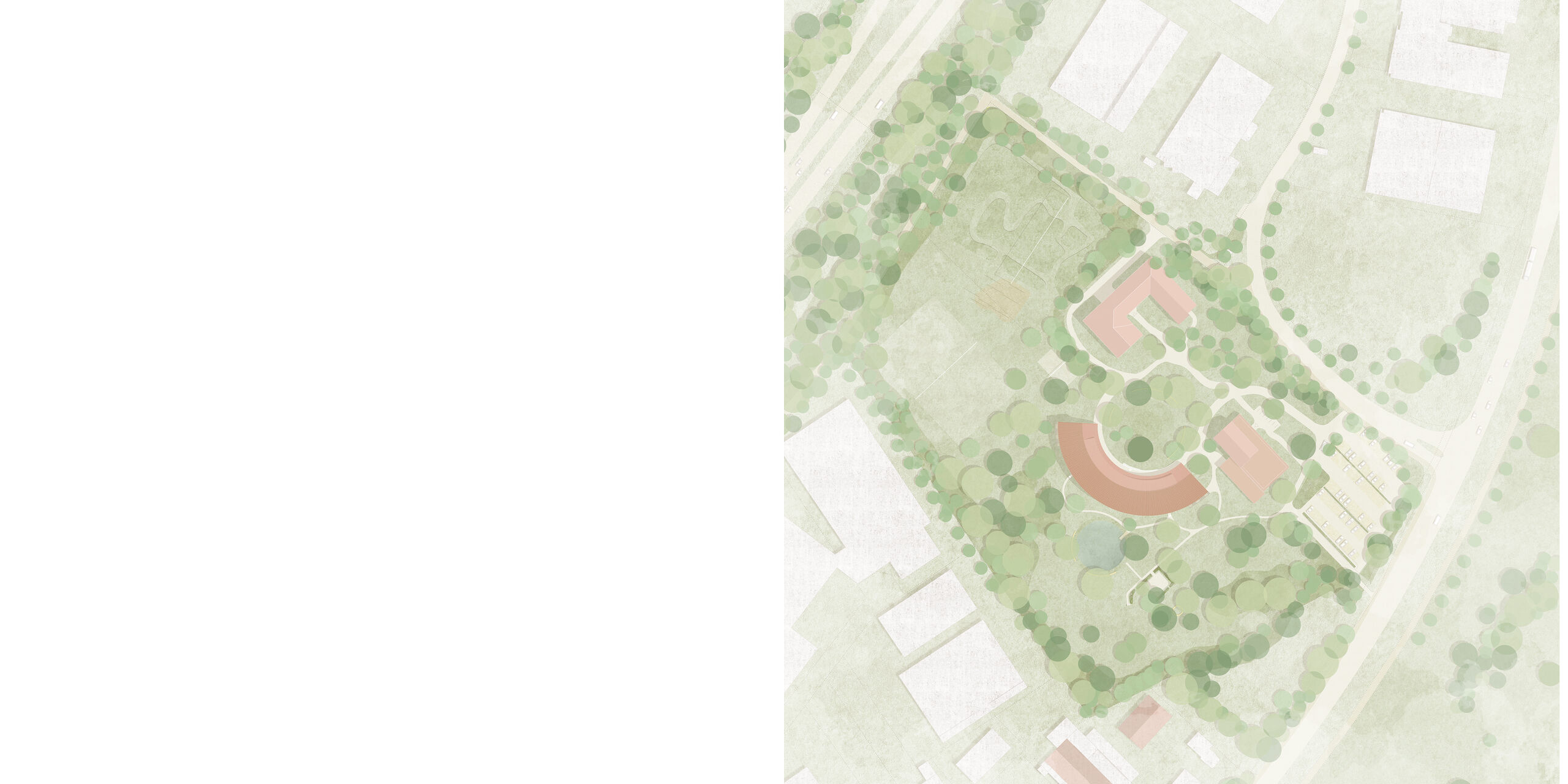 The curved shape, which presents itself as an inviting and protective gesture, shows the Episcopal Youth Welfare Office as a place of encounter and as an open community of faith on site.