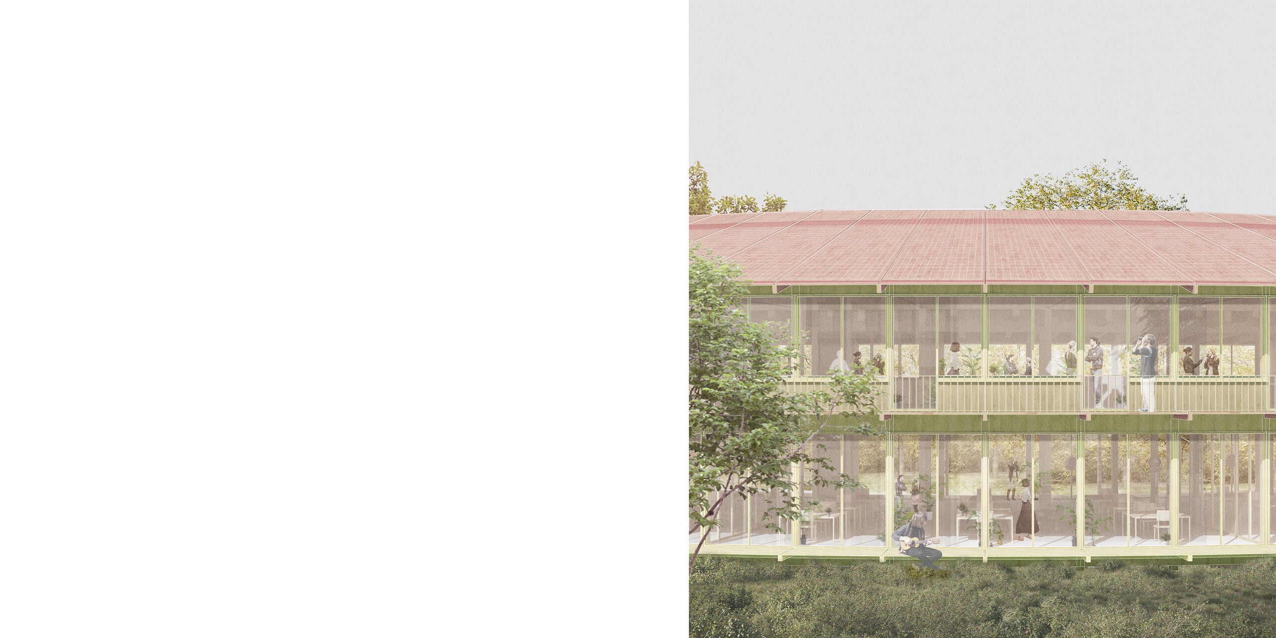 The arched shape of the new building has a harmonious and pleasant effect, offers a sheltered outdoor space and creates a flow of space.