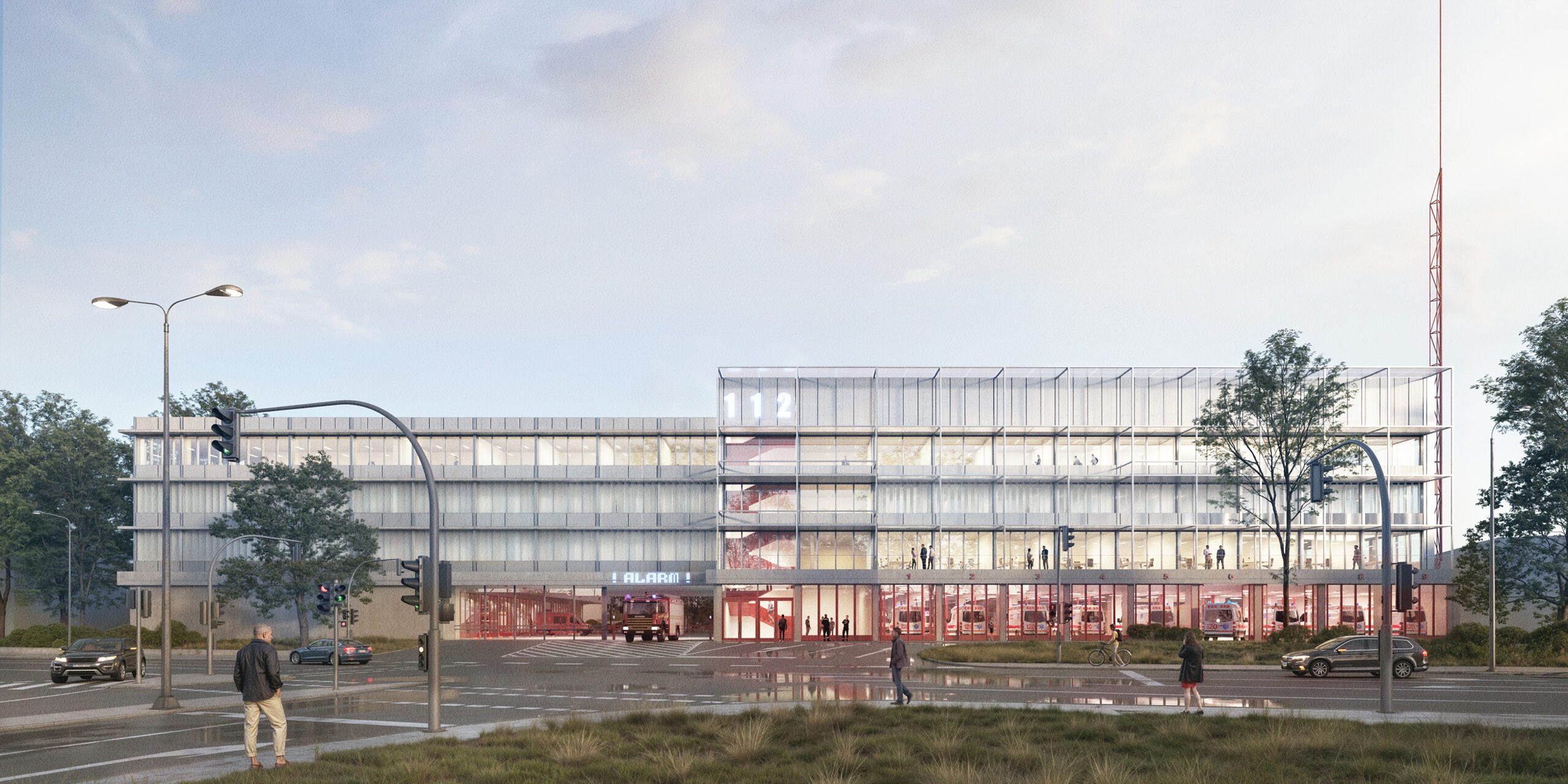 The ensemble asserts itself independently in the context and transforms the existing urban fragmentation into a clear structure. The building maximises parking space and displays its uses as a fire station, rescue station, control centre and administration building towards Lievelingsweg. Towards the motorway to the north, the training tower rises characteristically and functionally above the training yard. The low building protects the residential neighbourhood on Zeisigweg from urban development and noise. Towards Lievelingsweg, the main building is clearly recognisable as an important address in the urban space. This is emphasised by the radio antenna to the east of the control centre.