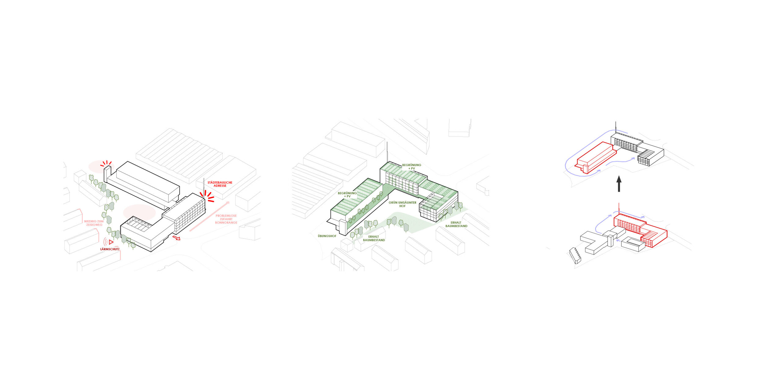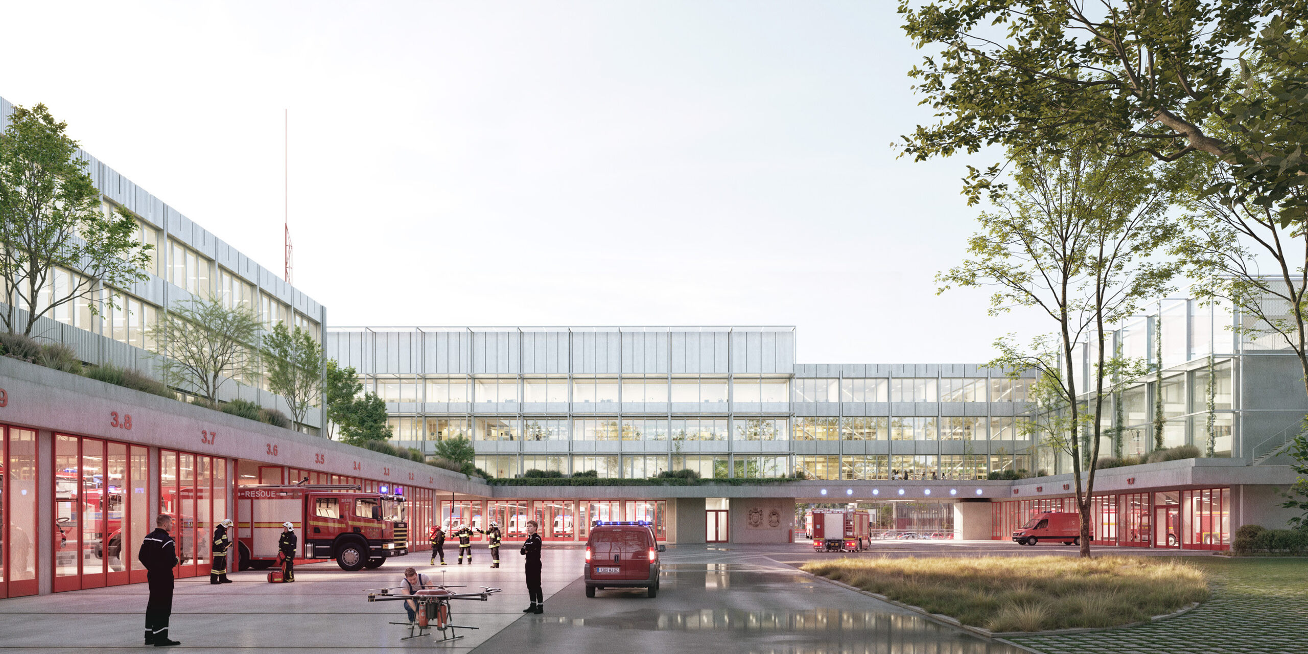 The new fire and rescue station I in Bonn consists of an ensemble of three living building blocks that form a shared courtyard. The bases of the vehicle halls enclose the alarm centre, while a green terrace on the upper floors connects the modular building sections and invites people to linger.