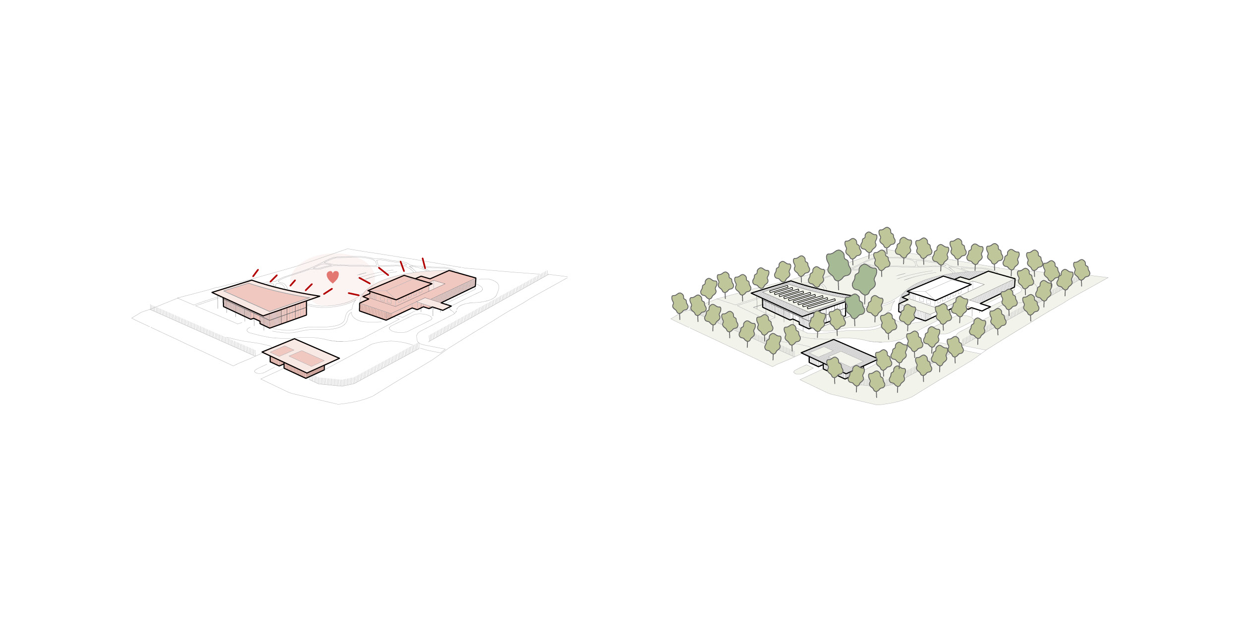 The three buildings with their distinctive roofs embrace the landscape, integrating the
