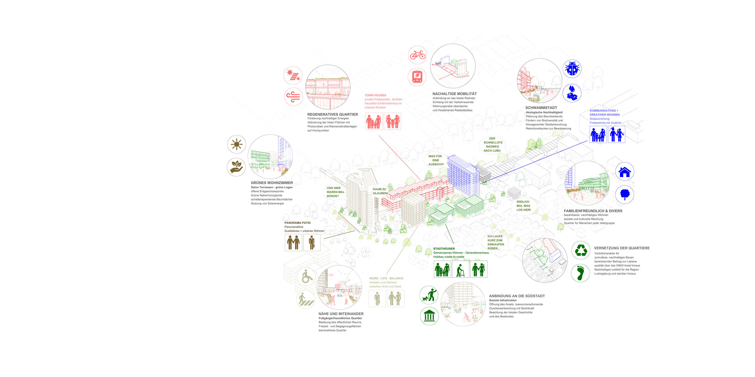 The area is primarily characterized by the tower of the W&W Group.Each of the existing building blocks has different qualities that need to be transformed into an urban living and working quarter.Steimle Architekten opted for a cautious approach to the existing buildings, particularly in view of the challenging task of sustainable construction. The gray energy of the structures is bound in the existing buildings. New buildings are added as lightweight timber constructions. The green, lively courtyard becomes a sponge city and thus combines social qualities and sustainable urban planning.