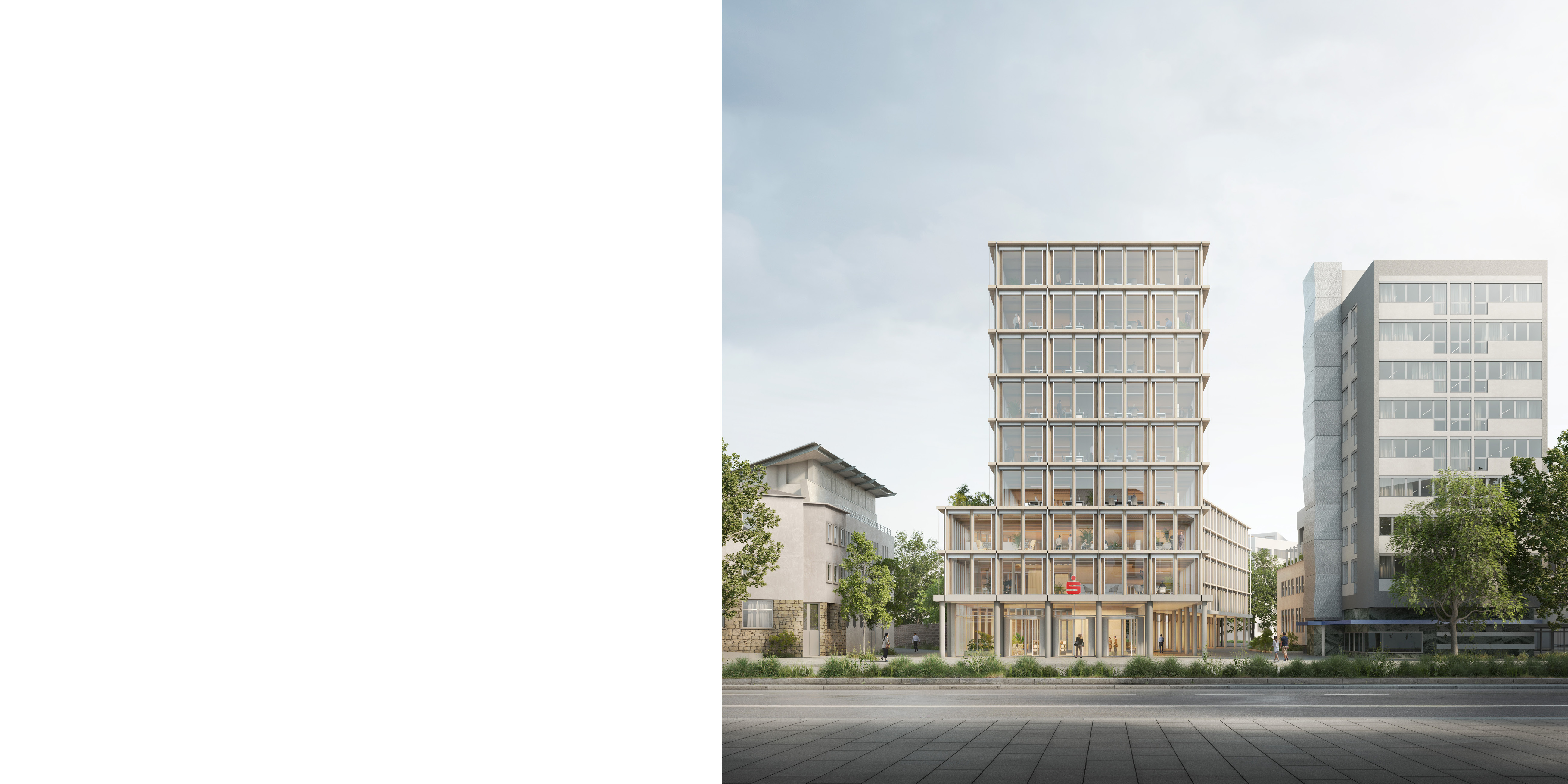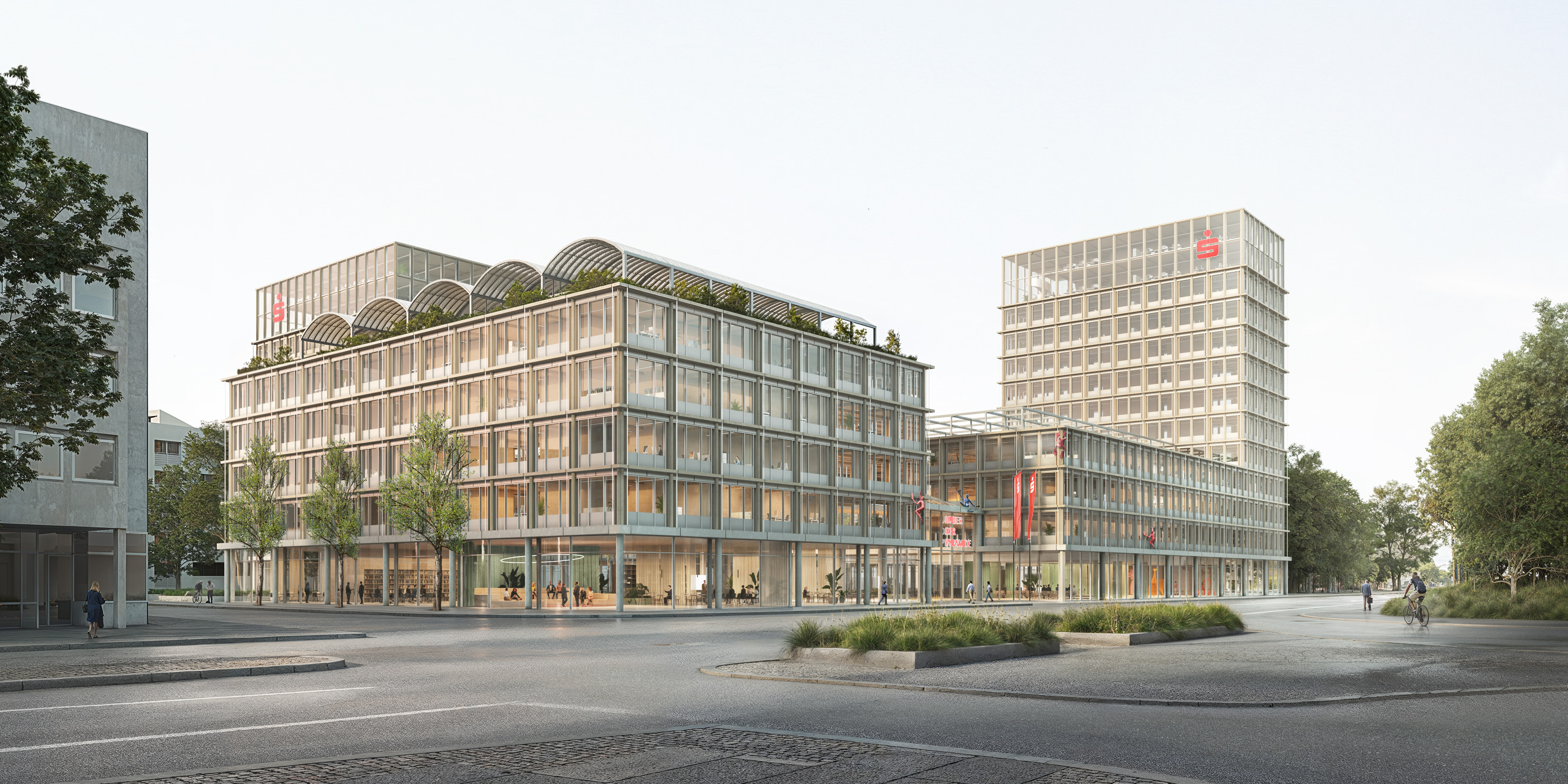 Sparkasse Heilbronn is continuing to develop its location between Wollhaus and “Allee.” With a newly acquired plot of land, the location will be divided into a consulting center and administration. Two high points form an ensemble with the Wollhaus and close off the edge of the block. A green park with winding paths and lush vegetation is being created in the inner courtyard. Arcades frame the grove like a passe-partout. This symbiosis of nature and architecture creates a peaceful retreat that offers people a place to relax and reflect amid the hustle and bustle.