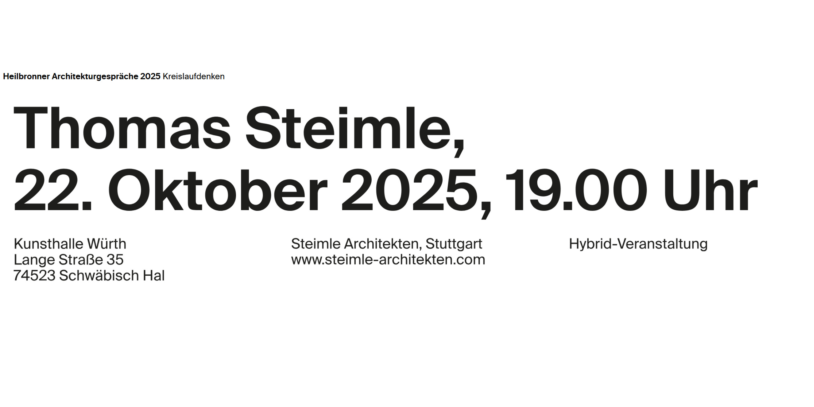 On October 22, 2025, the “Heilbronn Architecture Talks” event will take place at the Kunsthalle Würth in Schwäbisch Hall. Starting at 7 p.m., Thomas Steimle will give a lecture on circular thinking in architecture. The event is hybrid and can also be viewed online. More informations and the upcoming events are also on the website available.
