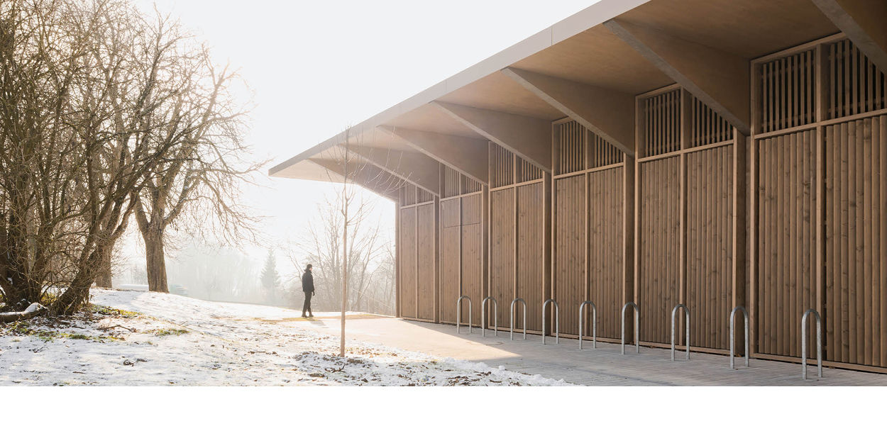 "The location of the buildingis characterized by the so-called tree hall that is adjacent to the west. This refers to stately old plane trees there that form a kind of natural hall with a great atmospheric effect. The pale-green colour, the play of light and shadow in the treetops an the special texture of the tree trunks from the basis of the design by Steimle Architekten." descrips Ulrike Kunkel in her text of the sporthall in Wangen in the AIT magazin.