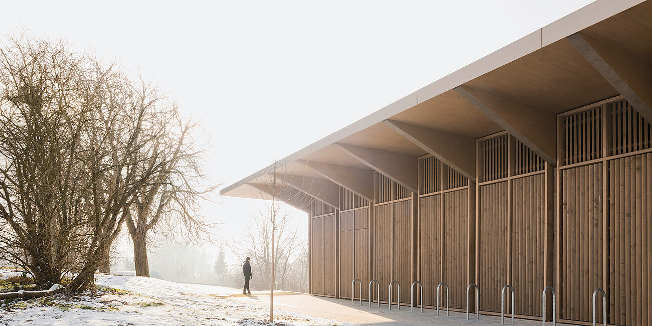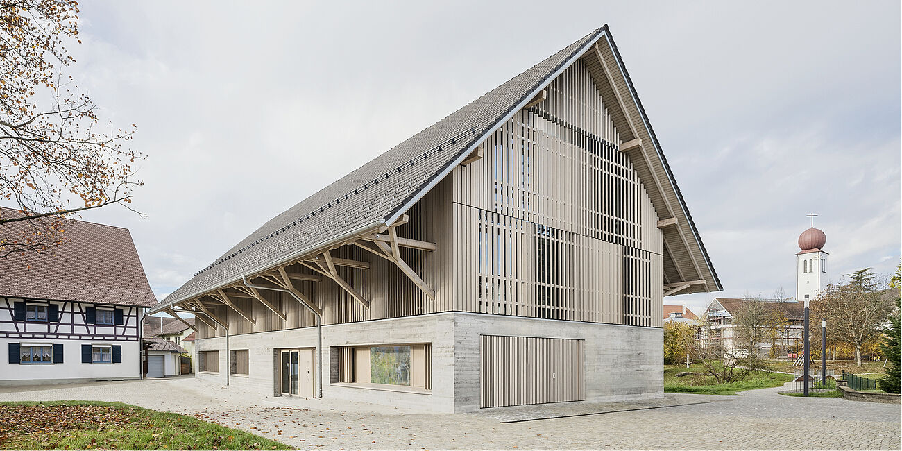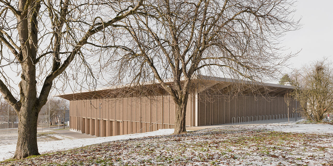 Following the fire at the old Markolfhalle in Markelfingen on Lake Constance, a new sports and multi-purpose hall was built using a timber frame construction. It not only serves schools and sports clubs, but is also intended to be a social and cultural center for the townspeople. With its cantilevered roof and uniform wooden slat façade, the building is the architectural highlight on the south-eastern edge of the town. The clear structure of the building is continued inside through the visible supporting structure. At the center of the building are the large event stage and the playing field, which can be flexibly divided by a partition curtain. The use of local spruce from regional forests underlines the concept of sustainability.