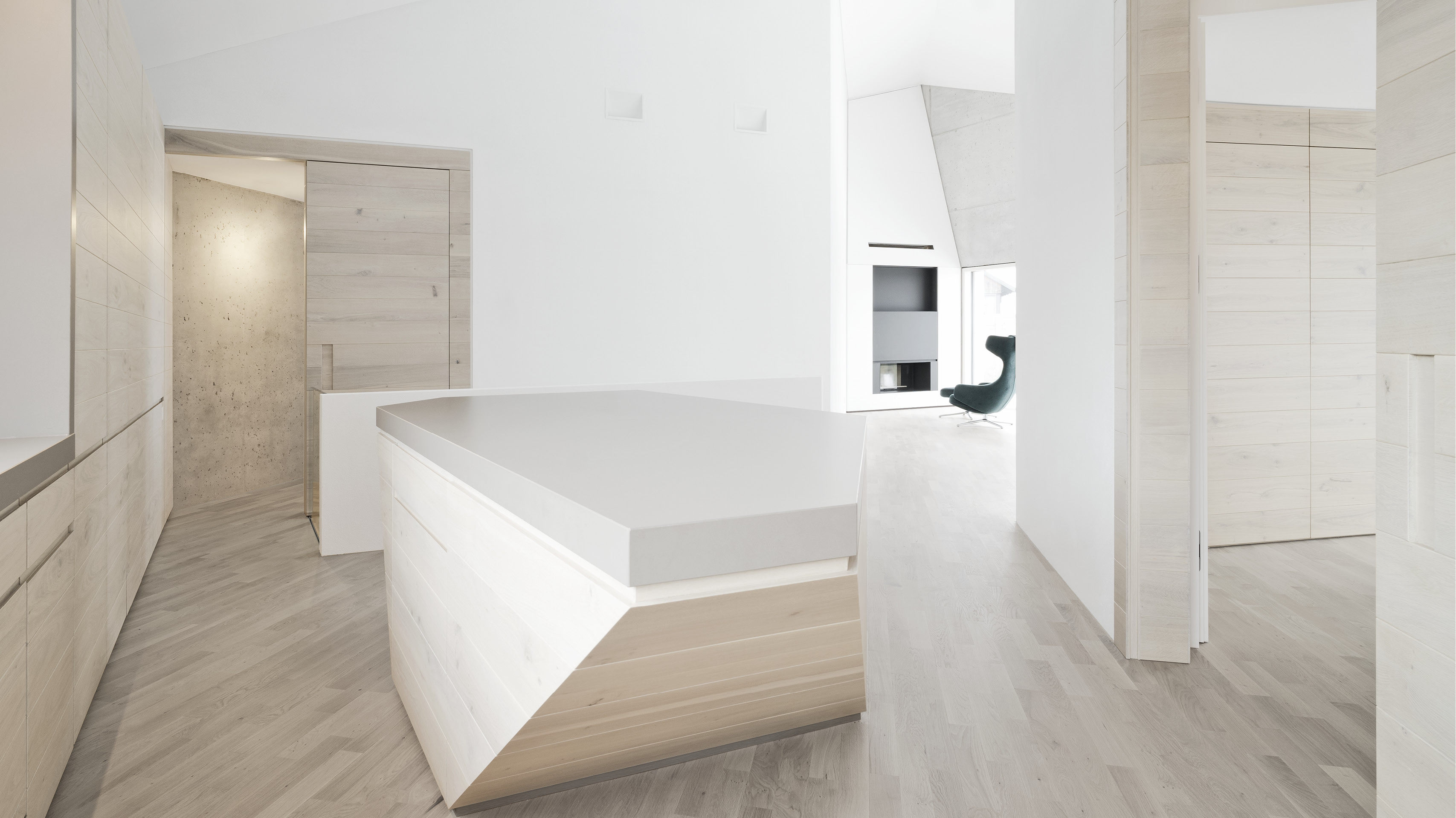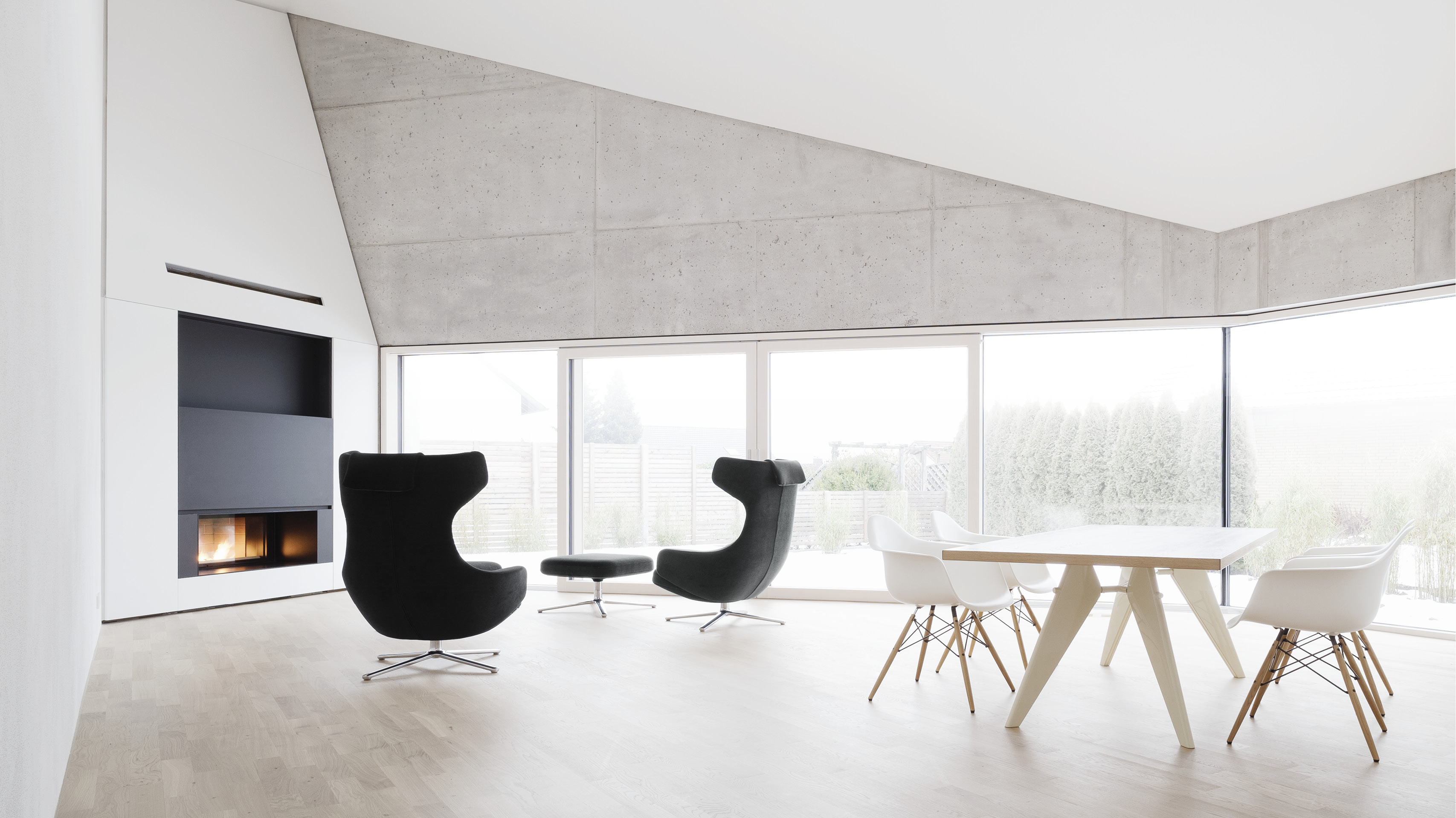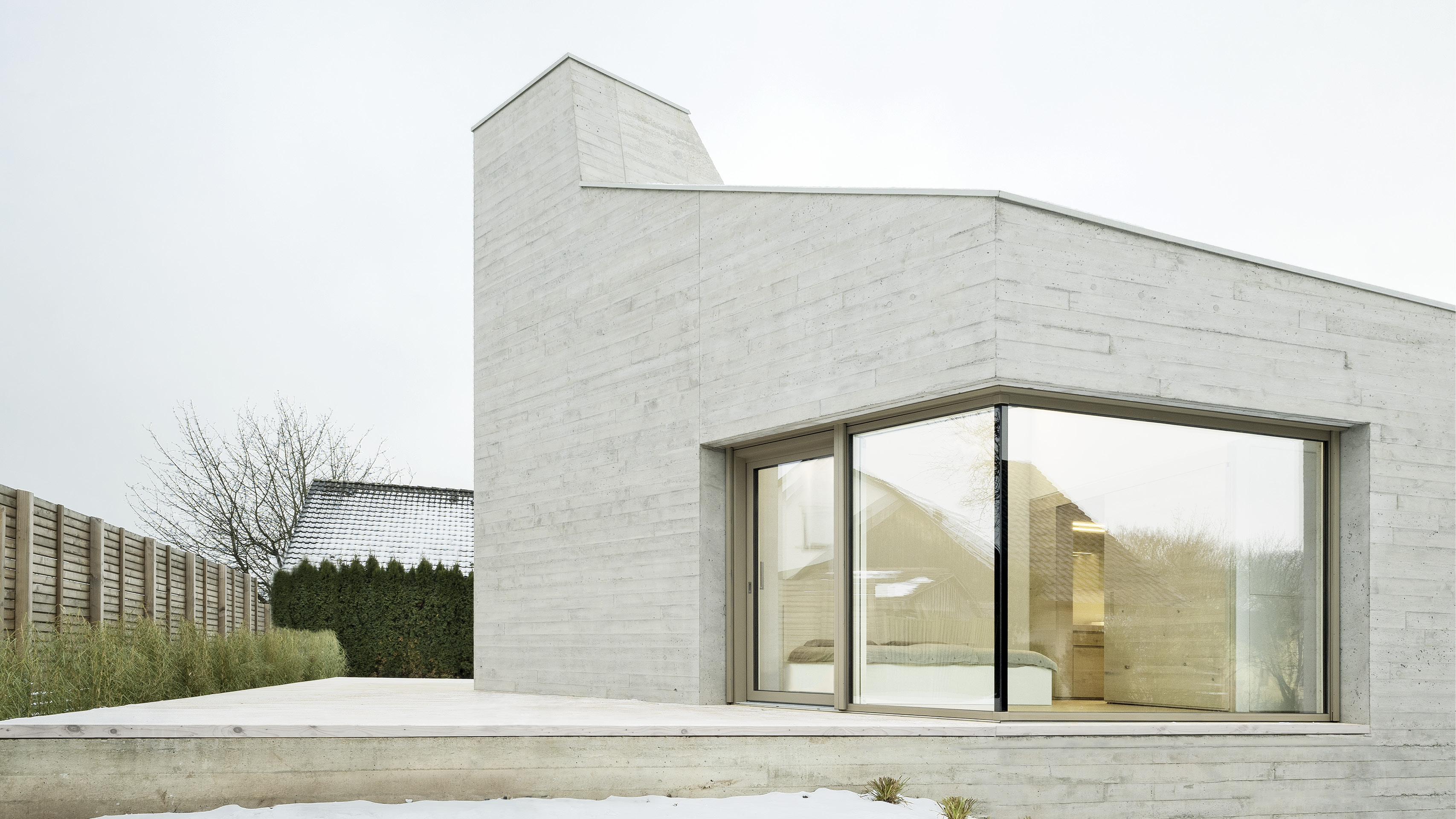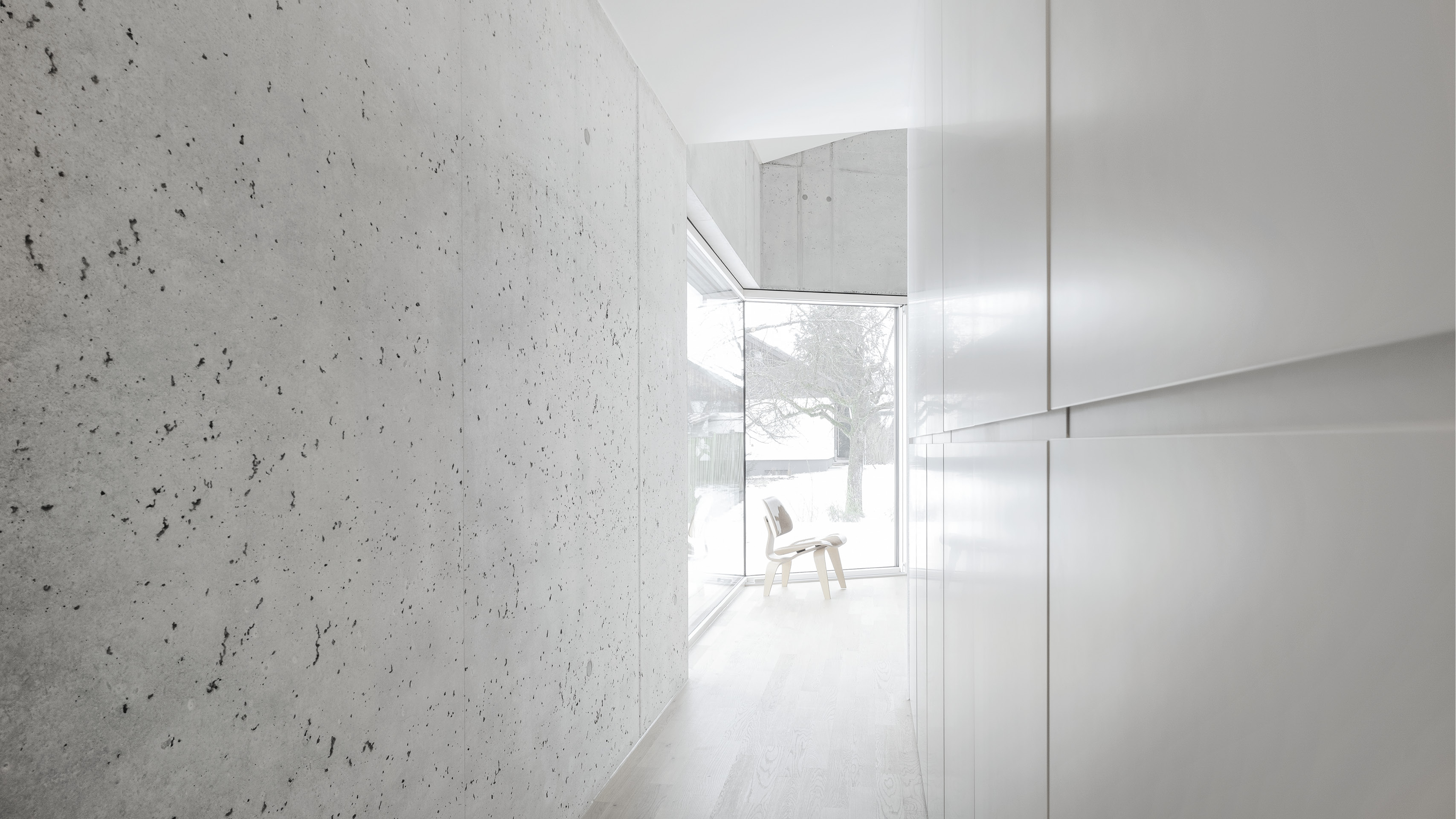 In its minimalism and robustness, the insulating concrete is a monochrome, massive shell that defines the essence of the house both inside and outside. Outside, thanks to the rough-sawn wooden board formwork, the concrete has the appearance of a solid, lively textured, and protective enclosure. Inside, the folded concrete surfaces are smooth by design and contrast with the warm hues of the solid oak fixtures.