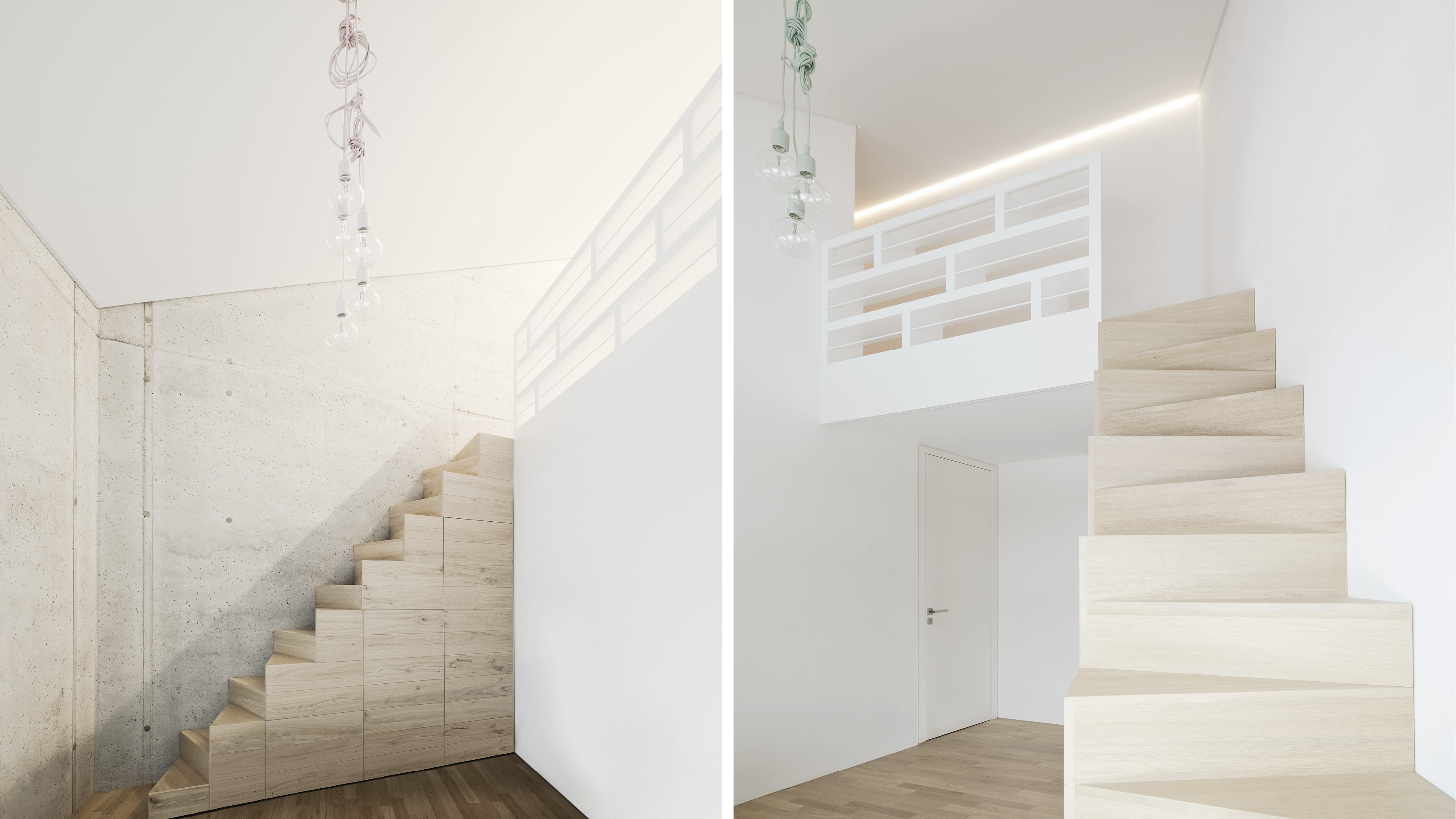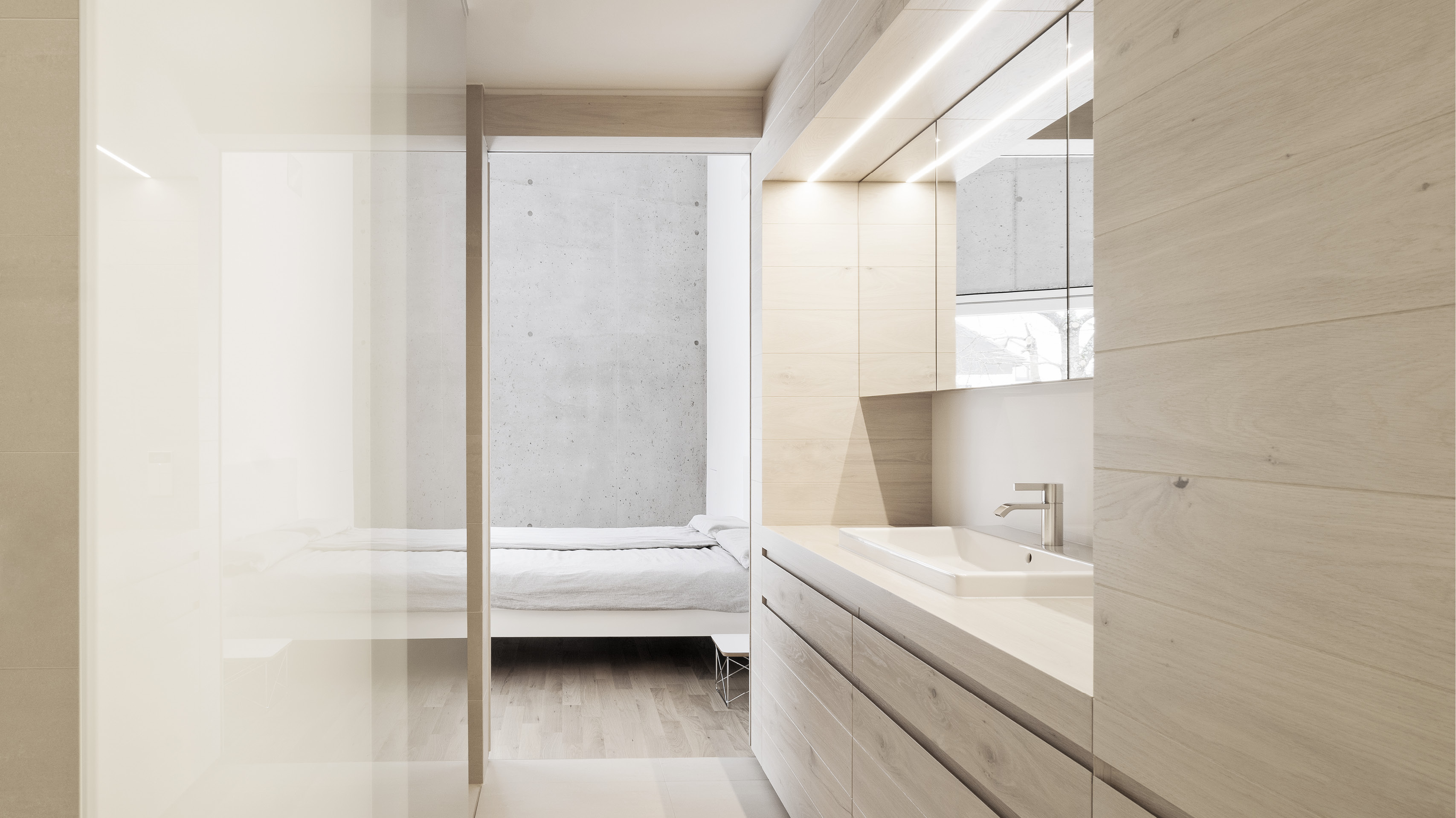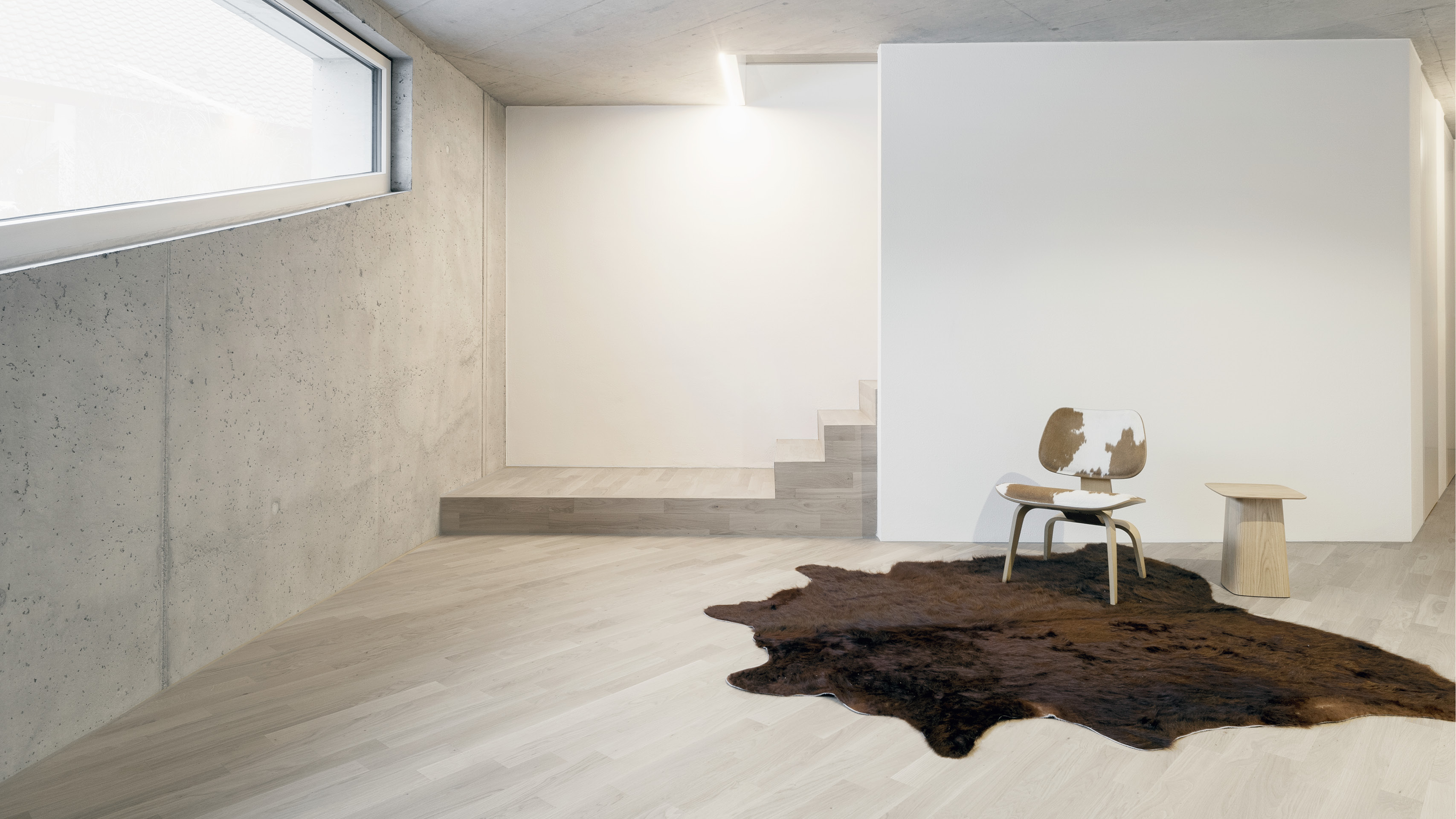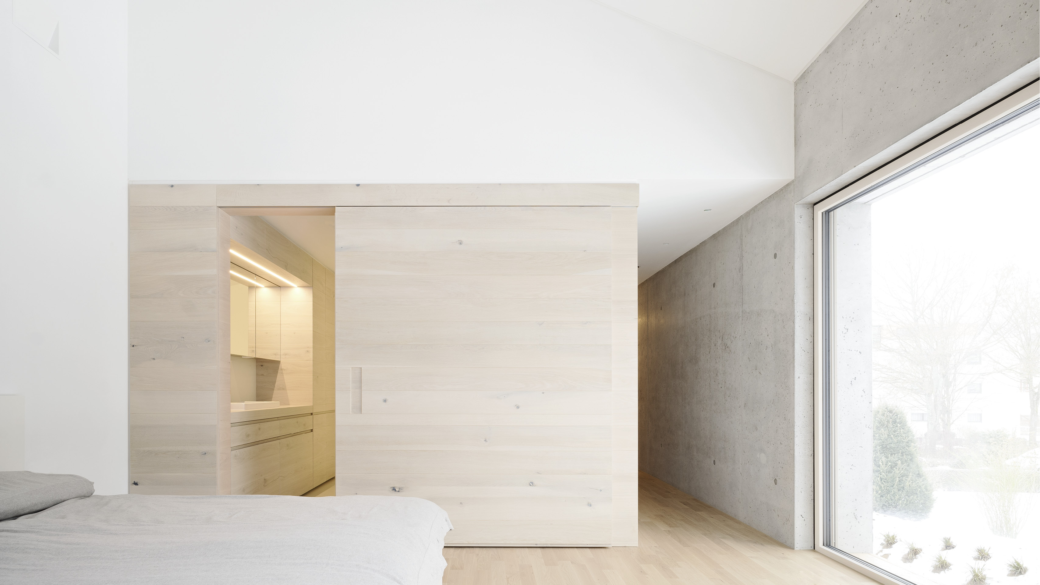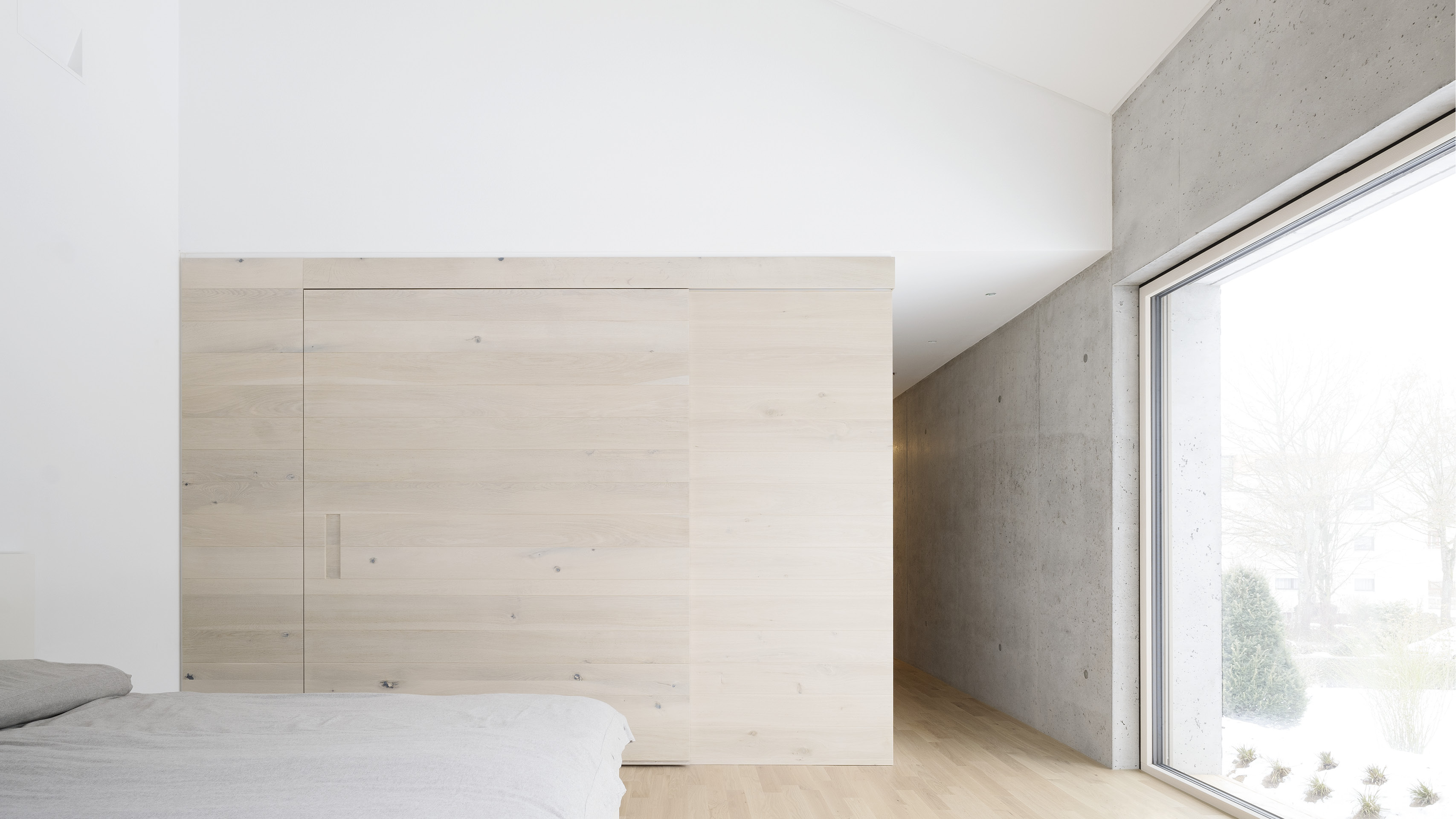 In its minimalism and robustness, the insulating concrete is a monochrome, massive shell that defines the essence of the house both inside and outside. Outside, thanks to the rough-sawn wooden board formwork, the concrete has the appearance of a solid, lively textured, and protective enclosure. Inside, the folded concrete surfaces are smooth by design and contrast with the warm hues of the solid oak fixtures.