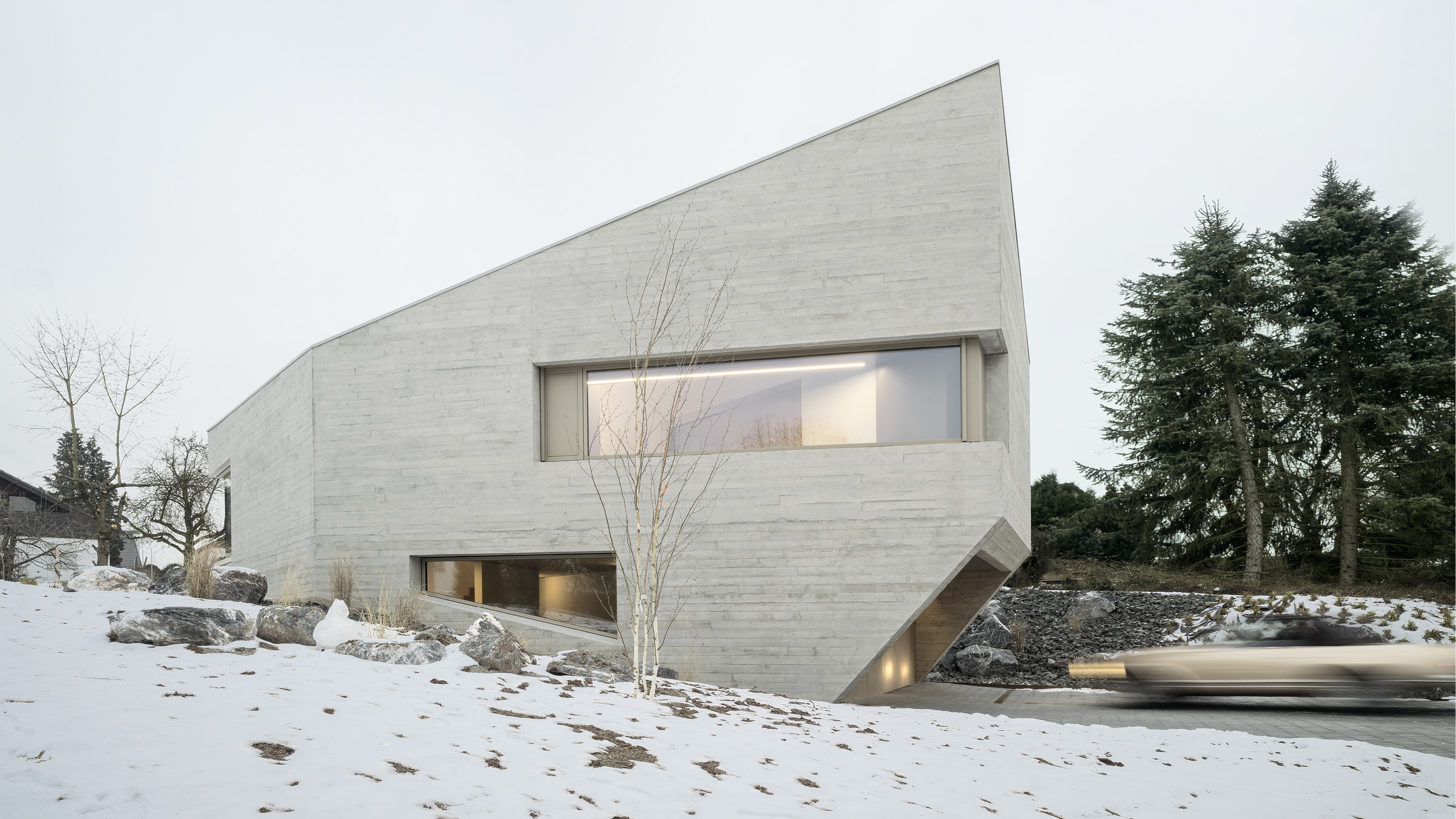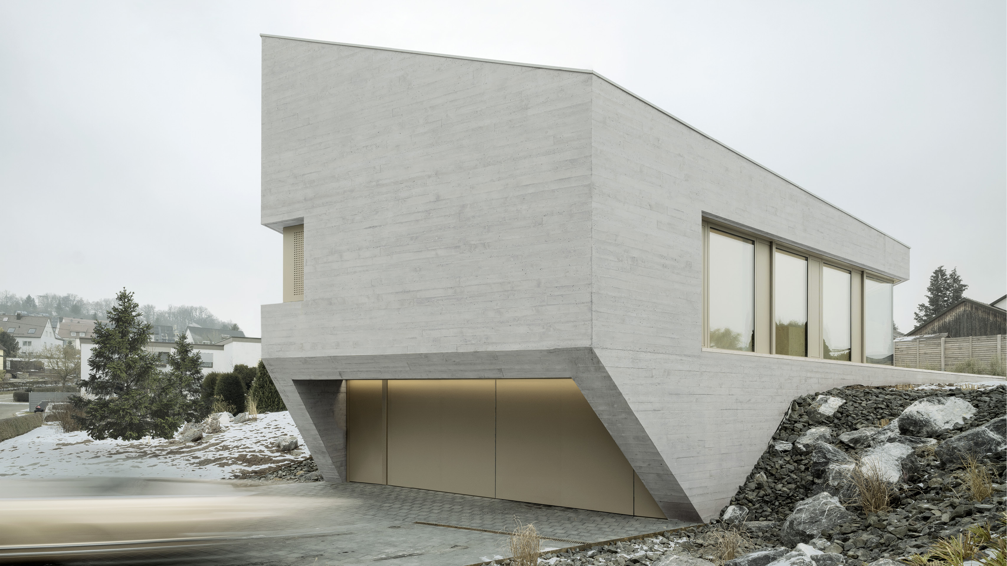 The striking residence, a monolith designed of insulating concrete is located on a quiet street with little traffic in the village, a good 30 km south of Stuttgart.