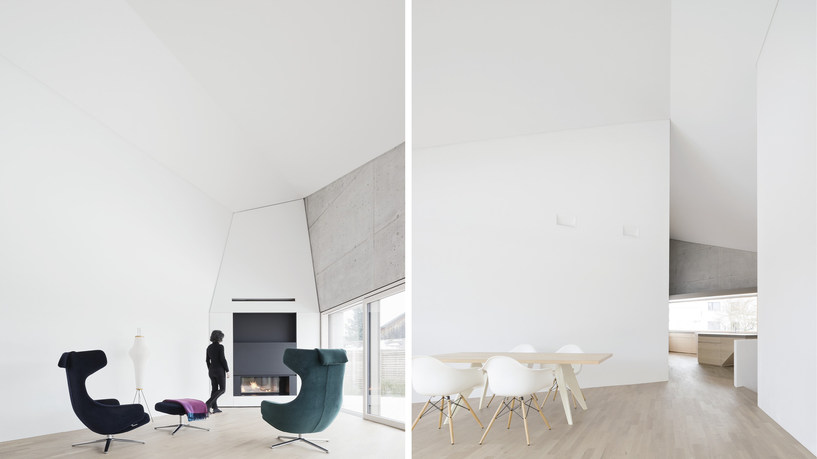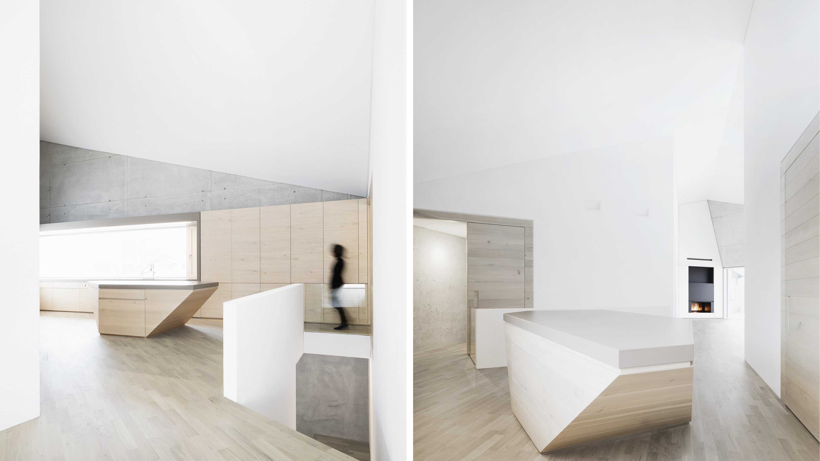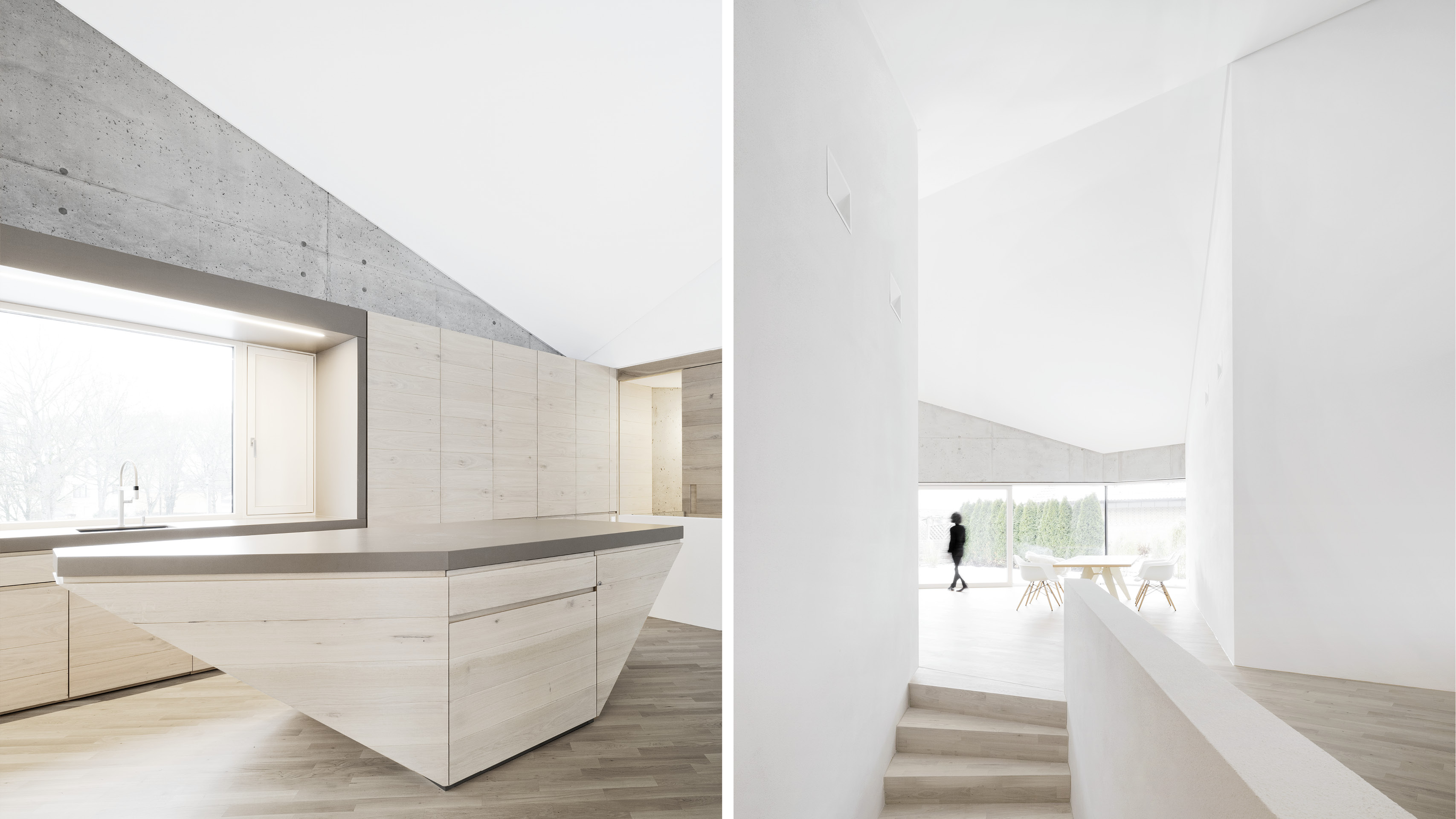 All the rooms of the house correlate with its crystalline form: the trapezoidal layout of the walls yields a diversity of new spatial relationships that have a special character induced by the upward-sloping ceiling surfaces. The individual rooms for the children and the parents lie directly adjacent to the living space and, as opposing parallelograms, divide the open floor plan into zones for the kitchen and the dining area. The result is a sensuous, atmospherically dense place of dwelling.