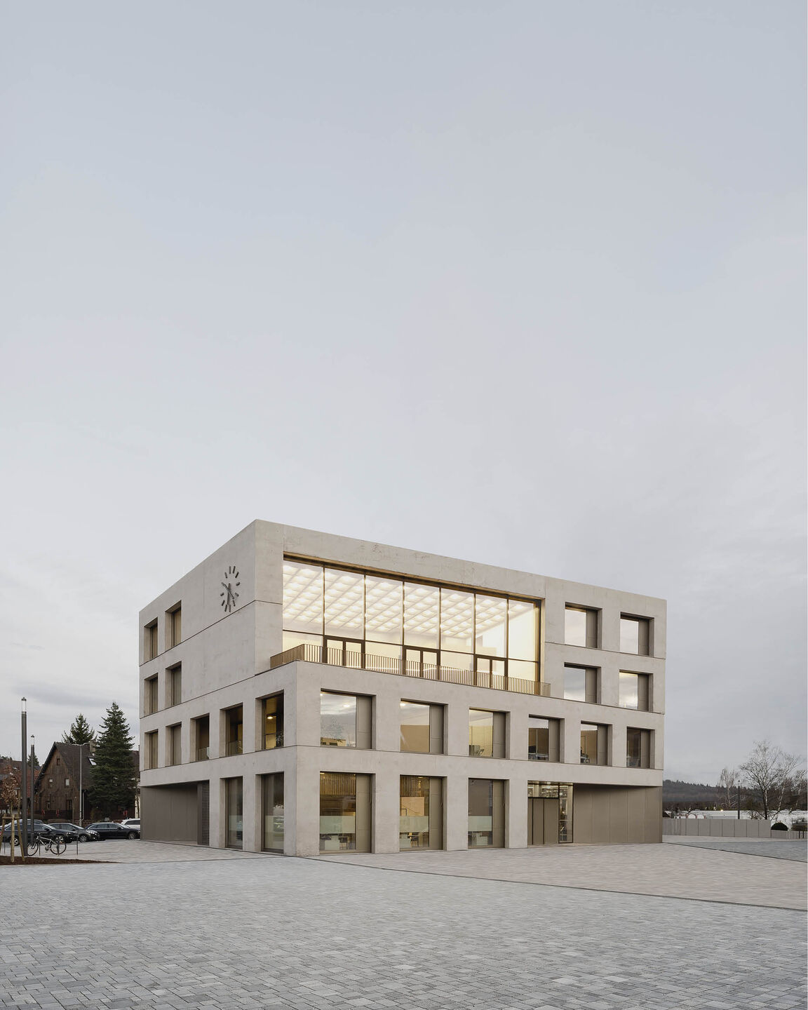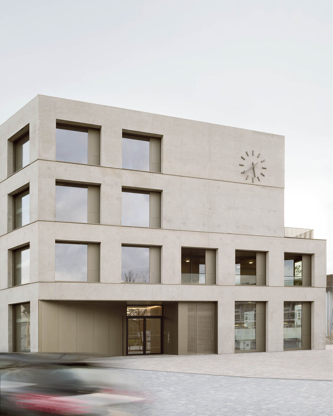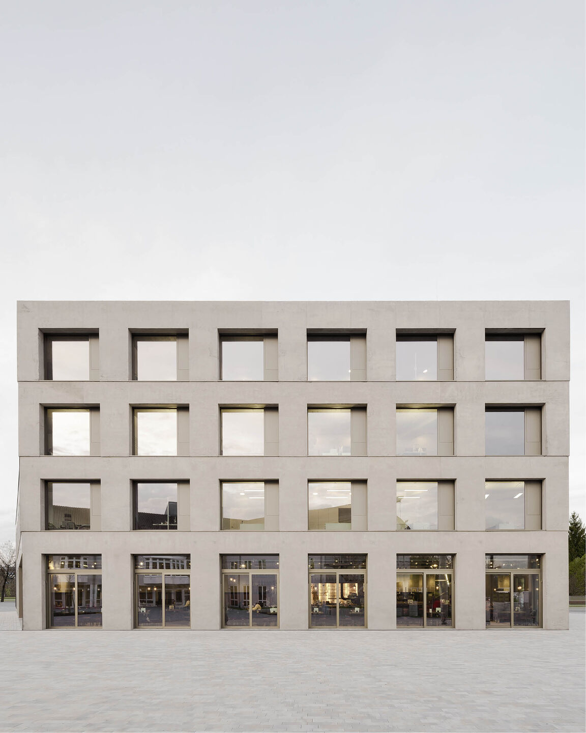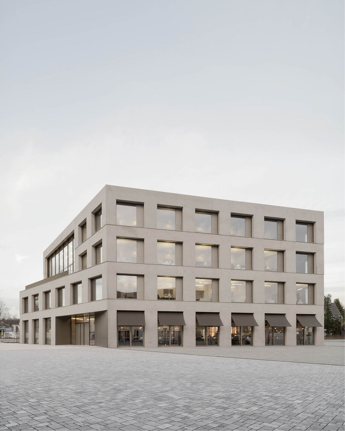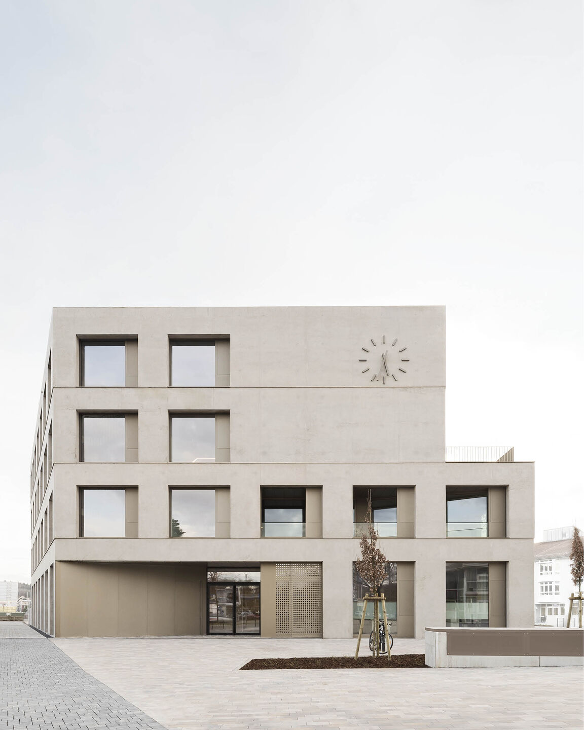 Given the building’s prominent location, its impact to the townscape when viewed from a distance was an important consideration in determining its dimensions: the height of the new four-story building takes its cue from the surrounding buildings, yet it manifests itself as a discrete object that excitingly enhances them. Its rigorous facades made of insulating concrete strengthen the feeling of solidity and anchorage to the site. Within this uniform outer shell, whose mineral-based wall construction is fully recyclable, the large, regularly spaced windows with deep reveals are clearly distinguishable.