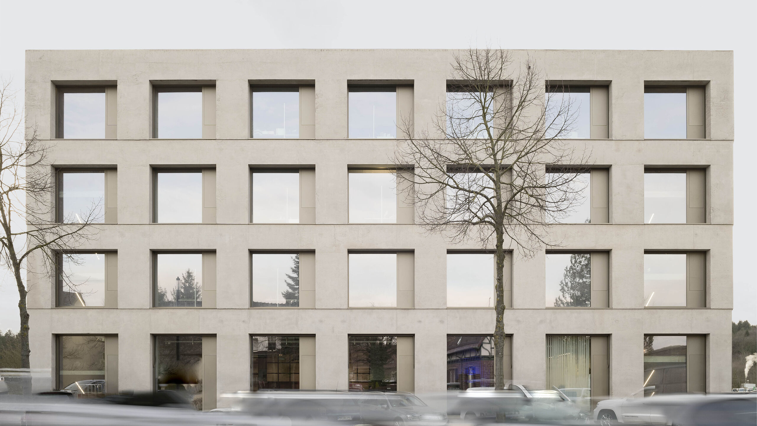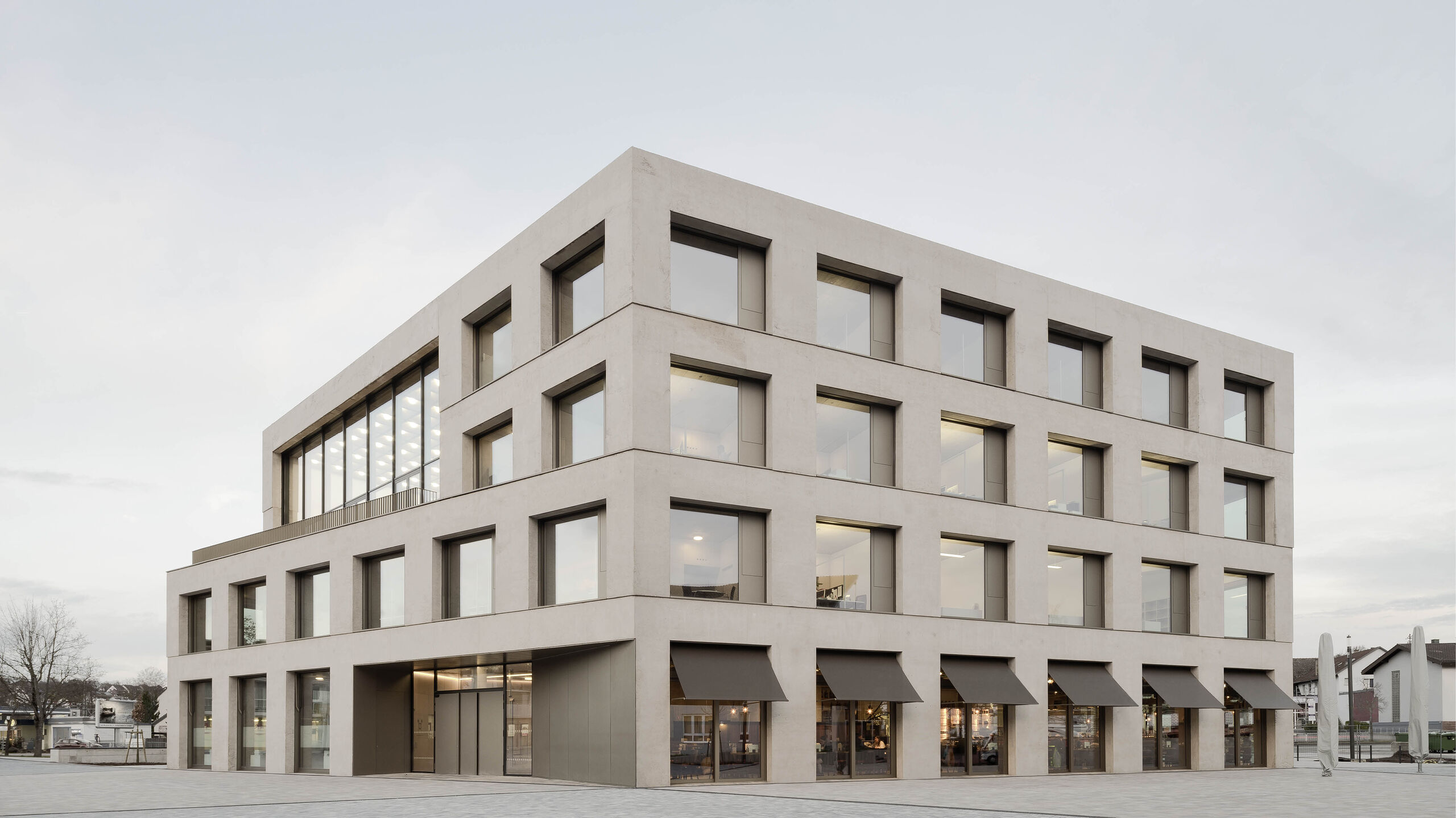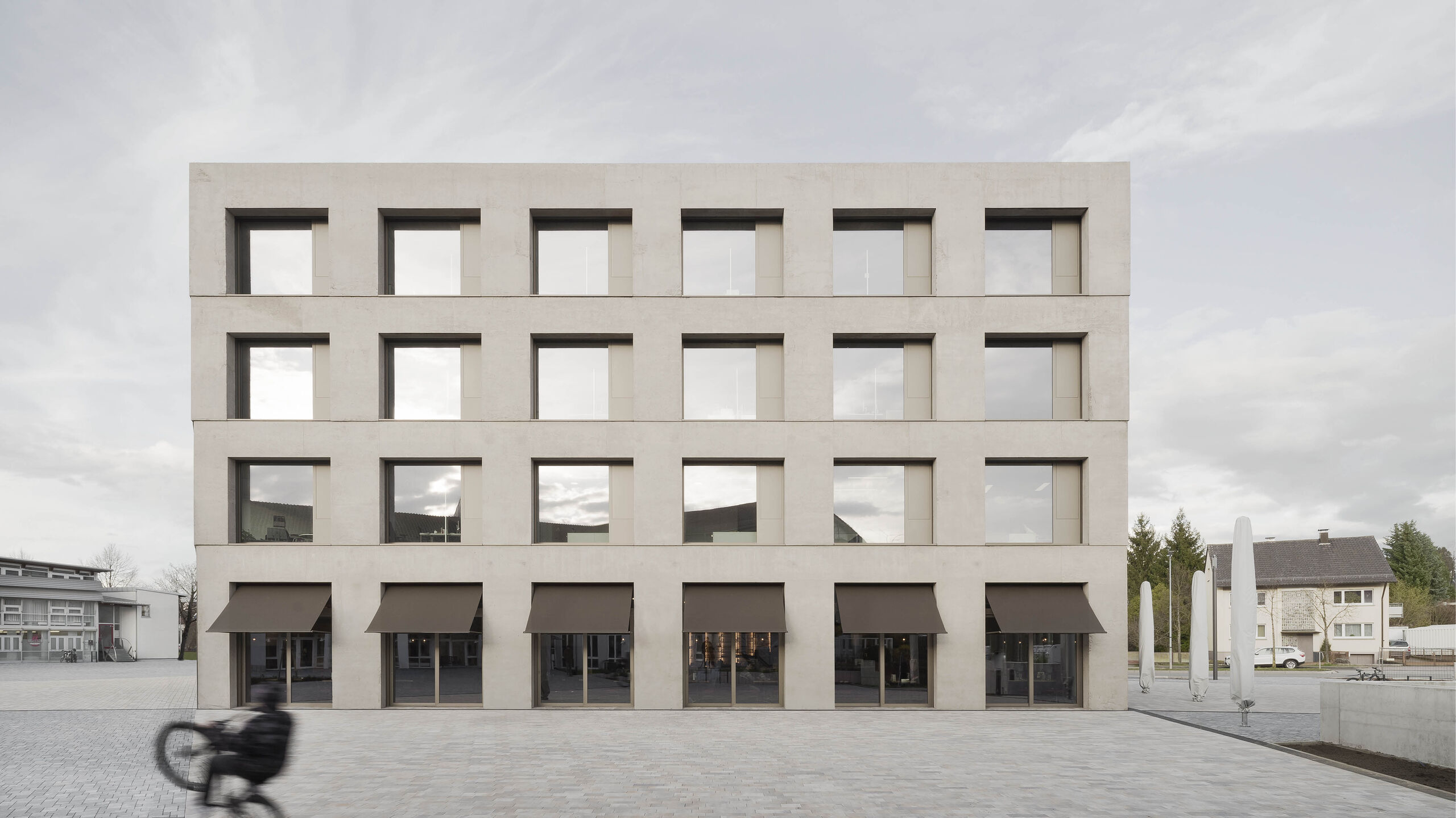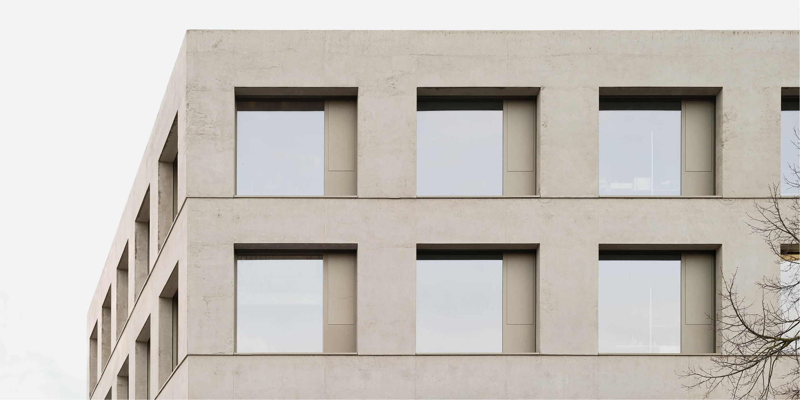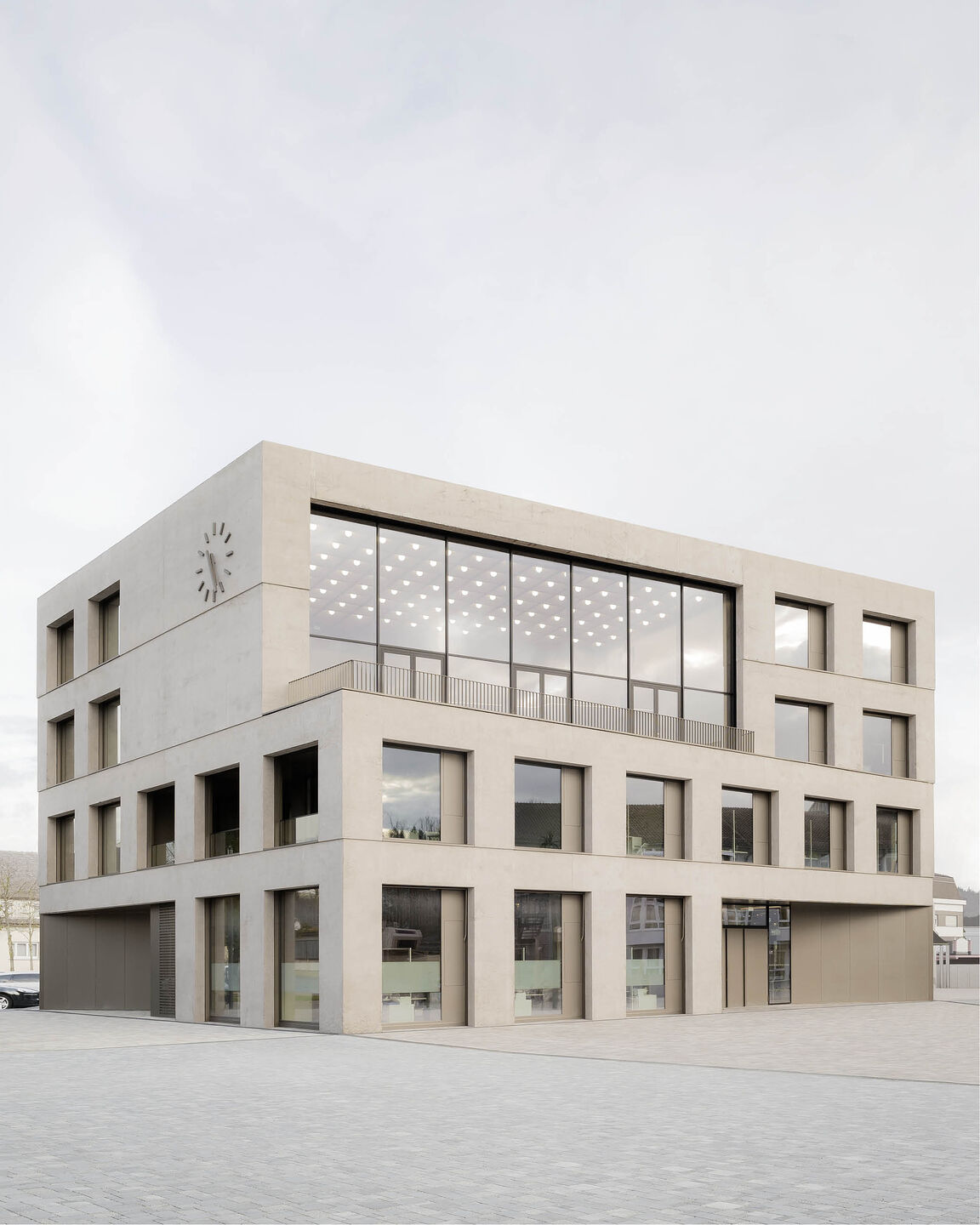 Given the building’s prominent location, its impact to the townscape when viewed from a distance was an important consideration in determining its dimensions: the height of the new four-story building takes its cue from the surrounding buildings, yet it manifests itself as a discrete object that excitingly enhances them. Its rigorous facades made of insulating concrete strengthen the feeling of solidity and anchorage to the site. Within this uniform outer shell, whose mineral-based wall construction is fully recyclable, the large, regularly spaced windows with deep reveals are clearly distinguishable.