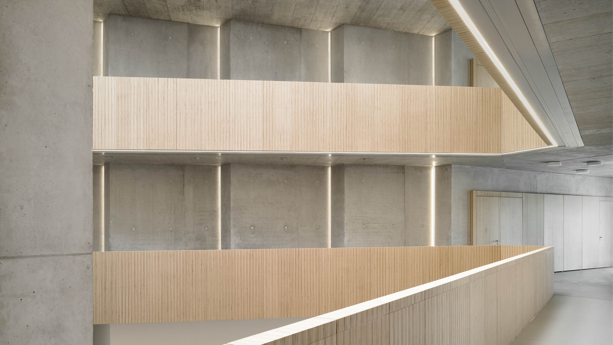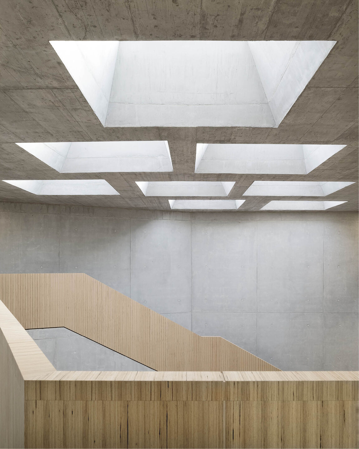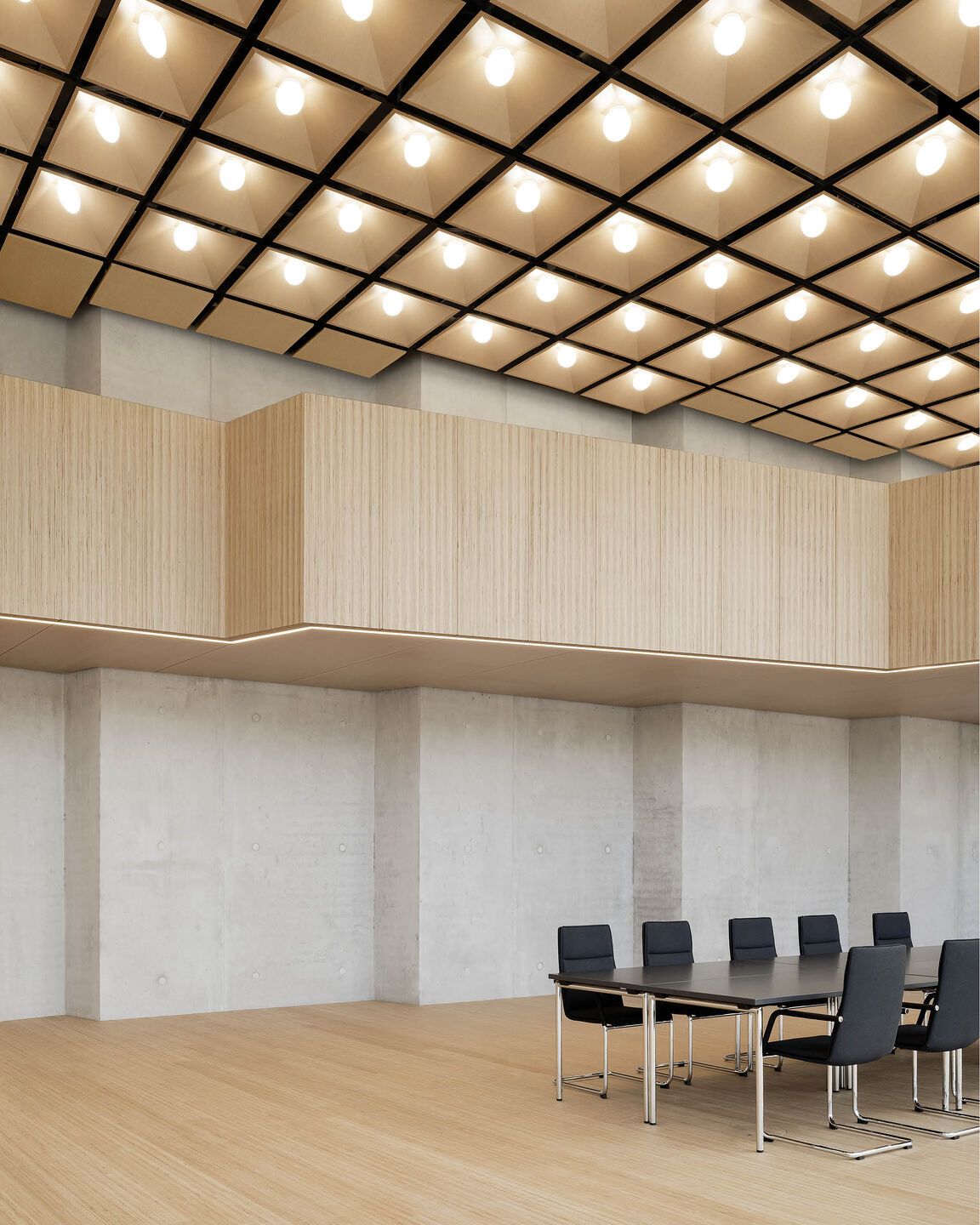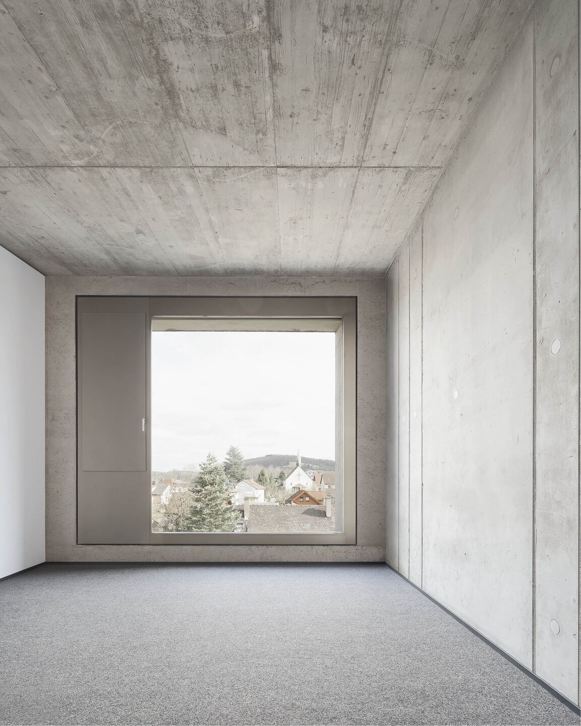 Given the building’s prominent location, its impact to the townscape when viewed from a distance was an important consideration in determining its dimensions: the height of the new four-story building takes its cue from the surrounding buildings, yet it manifests itself as a discrete object that excitingly enhances them. Its rigorous facades made of insulating concrete strengthen the feeling of solidity and anchorage to the site. Within this uniform outer shell, whose mineral-based wall construction is fully recyclable, the large, regularly spaced windows with deep reveals are clearly distinguishable.