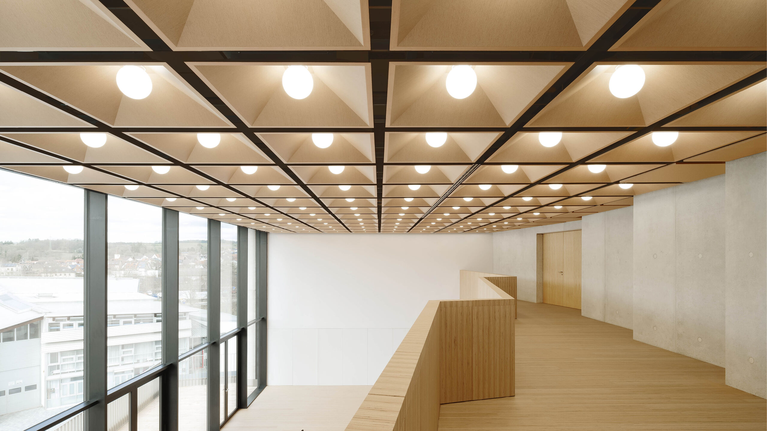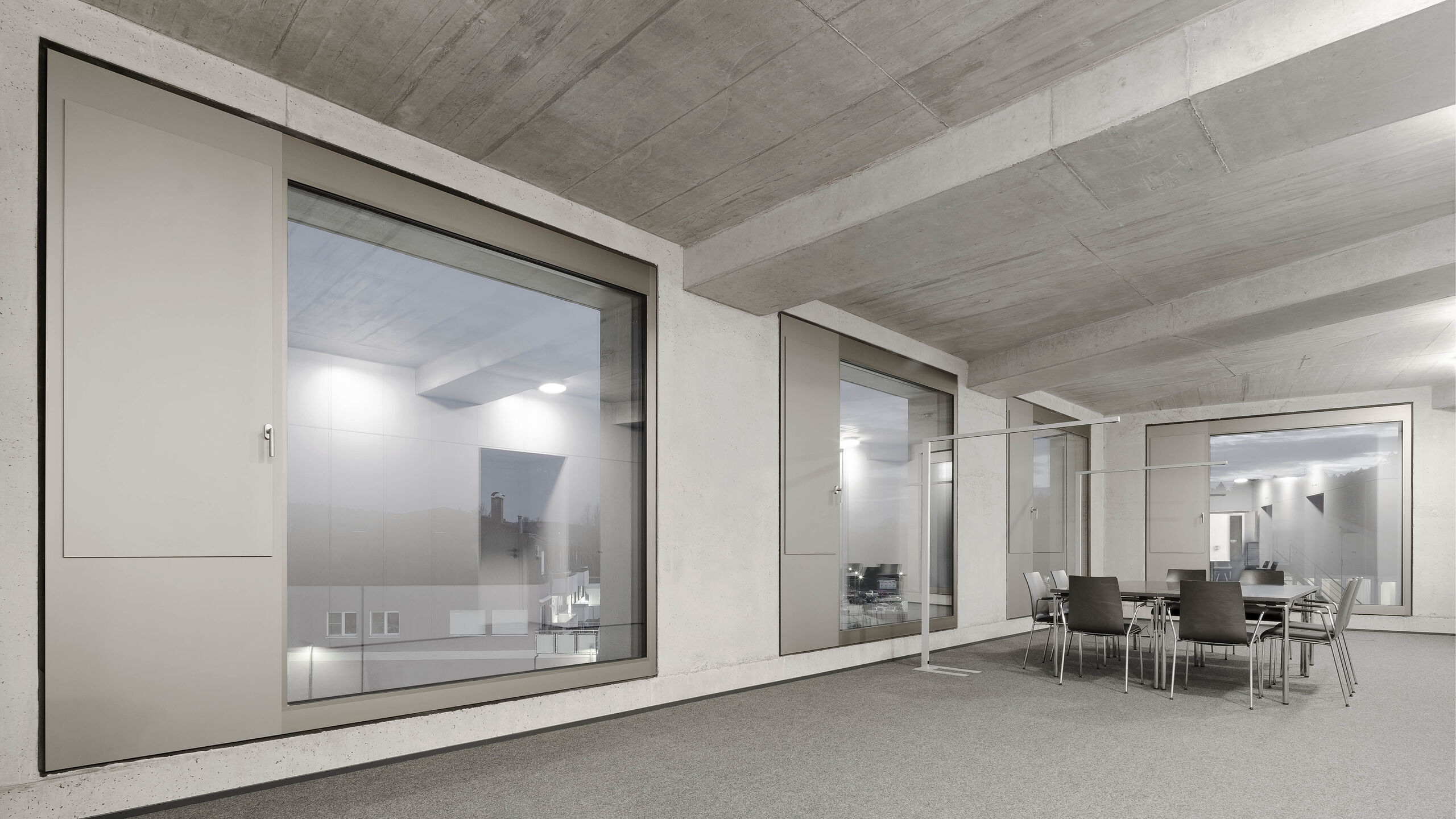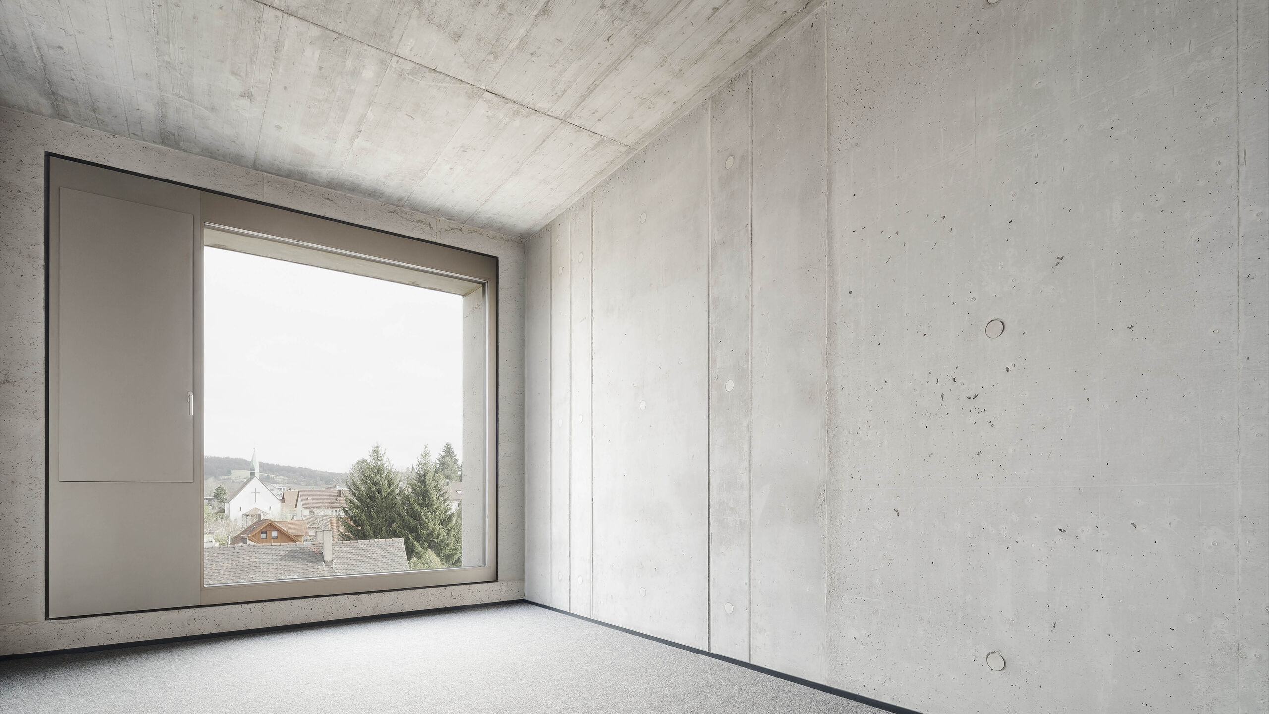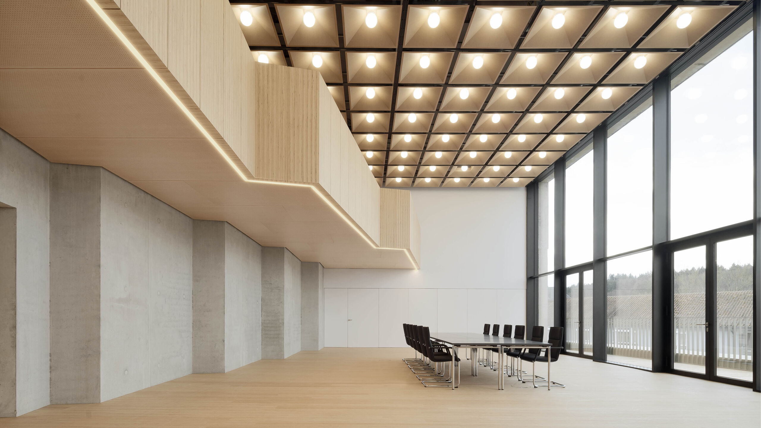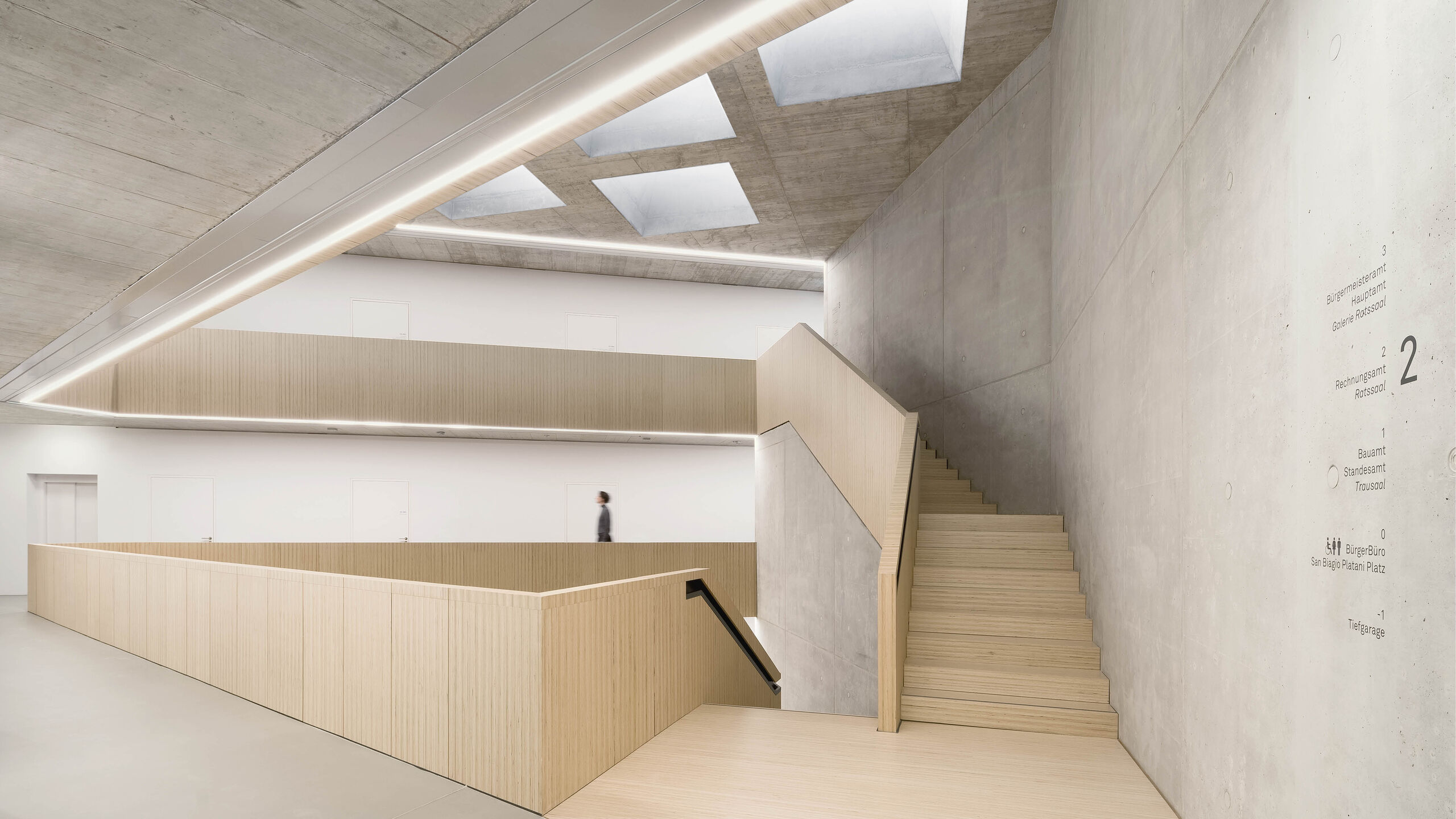 Given the building’s prominent location, its impact to the townscape when viewed from a distance was an important consideration in determining its dimensions: the height of the new four-story building takes its cue from the surrounding buildings, yet it manifests itself as a discrete object that excitingly enhances them. Its rigorous facades made of insulating concrete strengthen the feeling of solidity and anchorage to the site. Within this uniform outer shell, whose mineral-based wall construction is fully recyclable, the large, regularly spaced windows with deep reveals are clearly distinguishable.