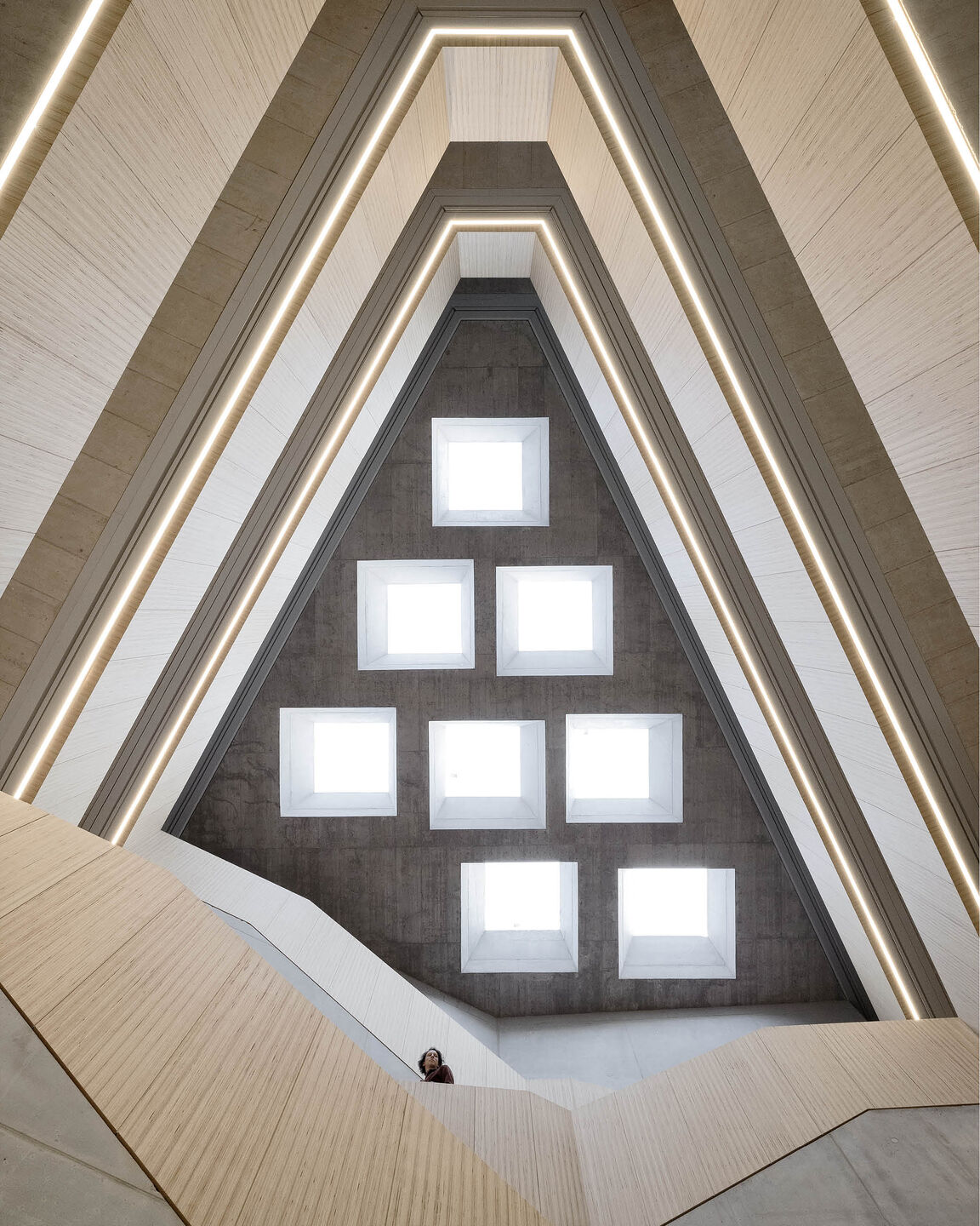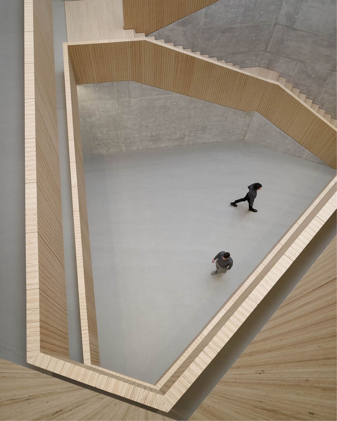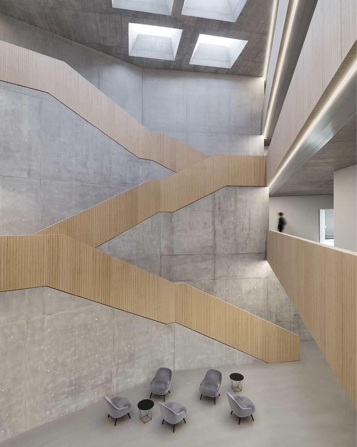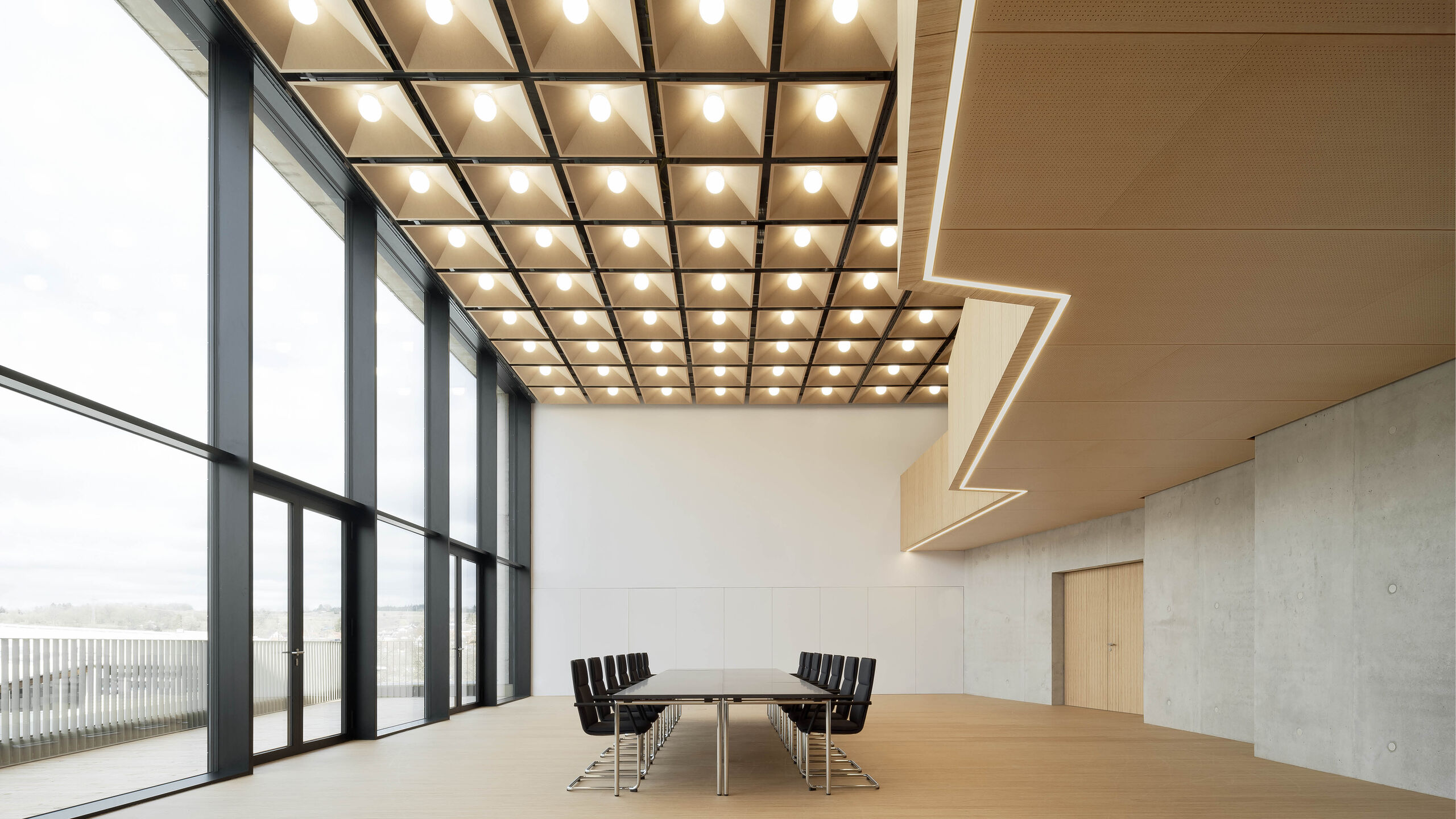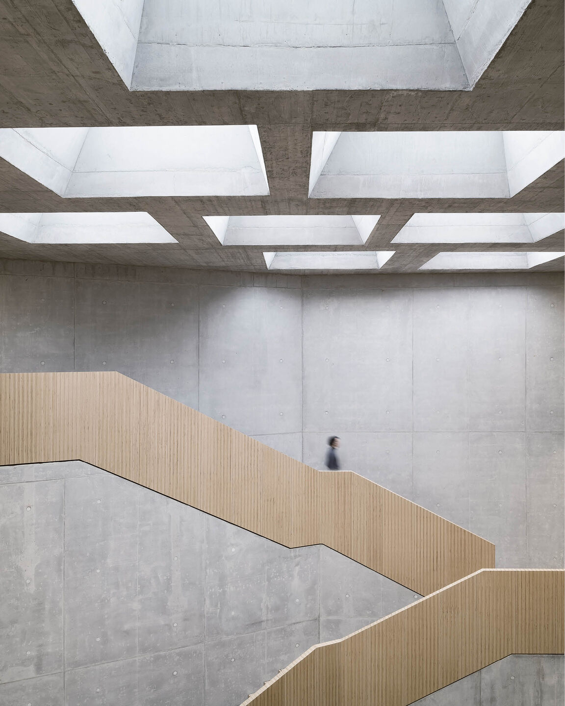 Given the building’s prominent location, its impact to the townscape when viewed from a distance was an important consideration in determining its dimensions: the height of the new four-story building takes its cue from the surrounding buildings, yet it manifests itself as a discrete object that excitingly enhances them. Its rigorous facades made of insulating concrete strengthen the feeling of solidity and anchorage to the site. Within this uniform outer shell, whose mineral-based wall construction is fully recyclable, the large, regularly spaced windows with deep reveals are clearly distinguishable.