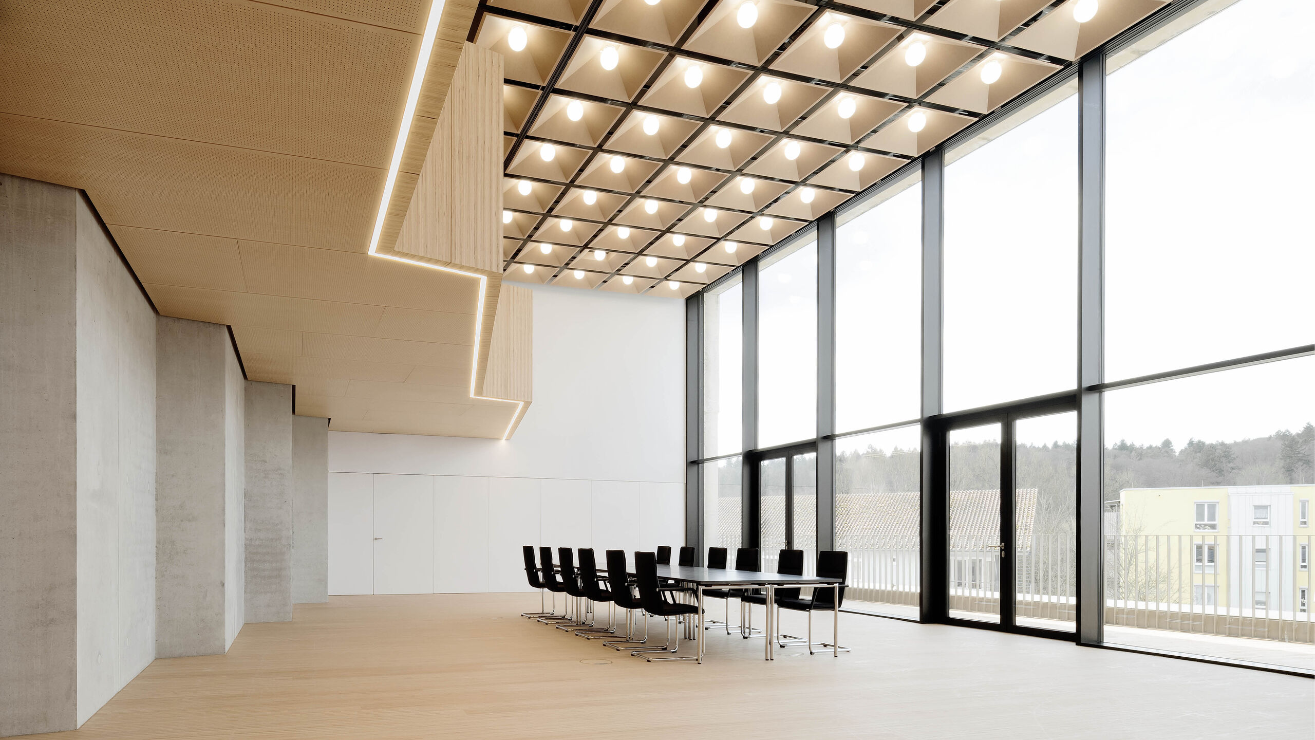 The new town hall in Remchingen, on a prominent site between federal highway B10 and the green space along the river Pfinz, is conceived as a new center for encounters and communication. Its immediate vicinity is dominated by the Remchingen Cultural Center and a nursing home, which are discrete, self-referential freestanding buildings that do not form an urban spatial relationship to each other.